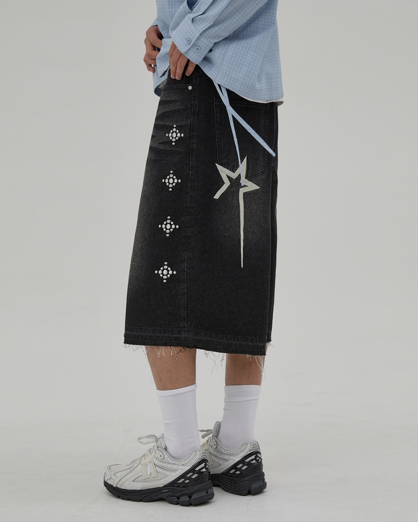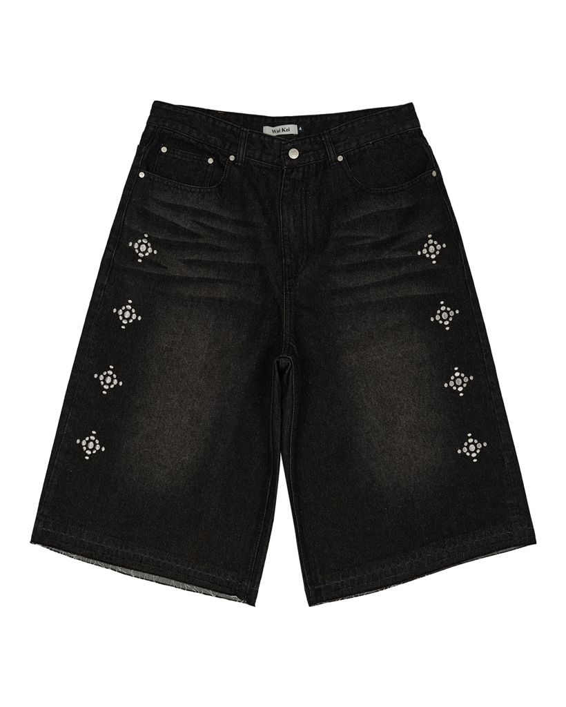 [K-POPアイドル着用] Western Stud Bermuda Denim Pants BLACK