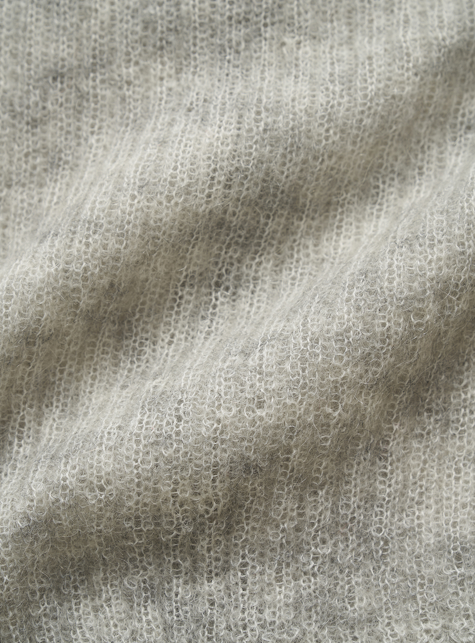 ライトグレーで、ヘアリーな糸が特徴のモヘア×ウール混ニット