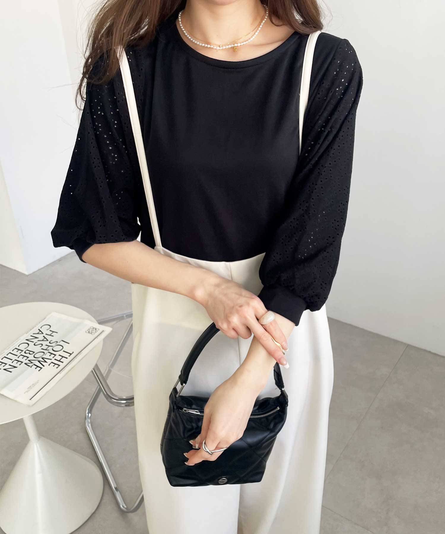 コンパクトなリブニットやブラウス、ドルマンシルエットのトップスなど、いろんなトップスと好相性。