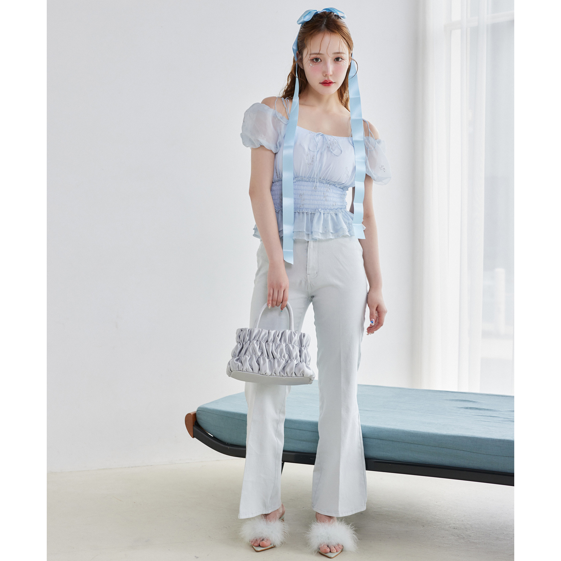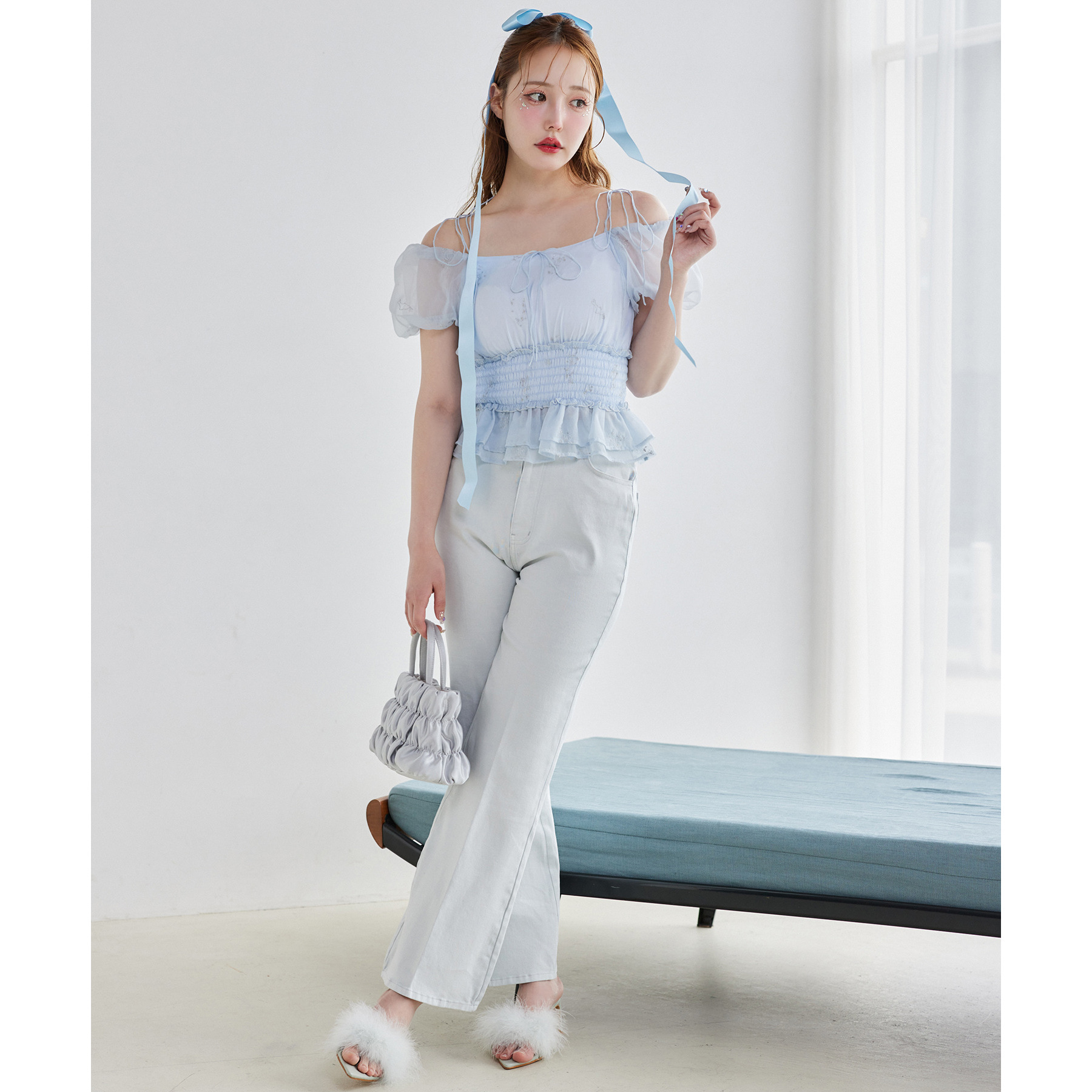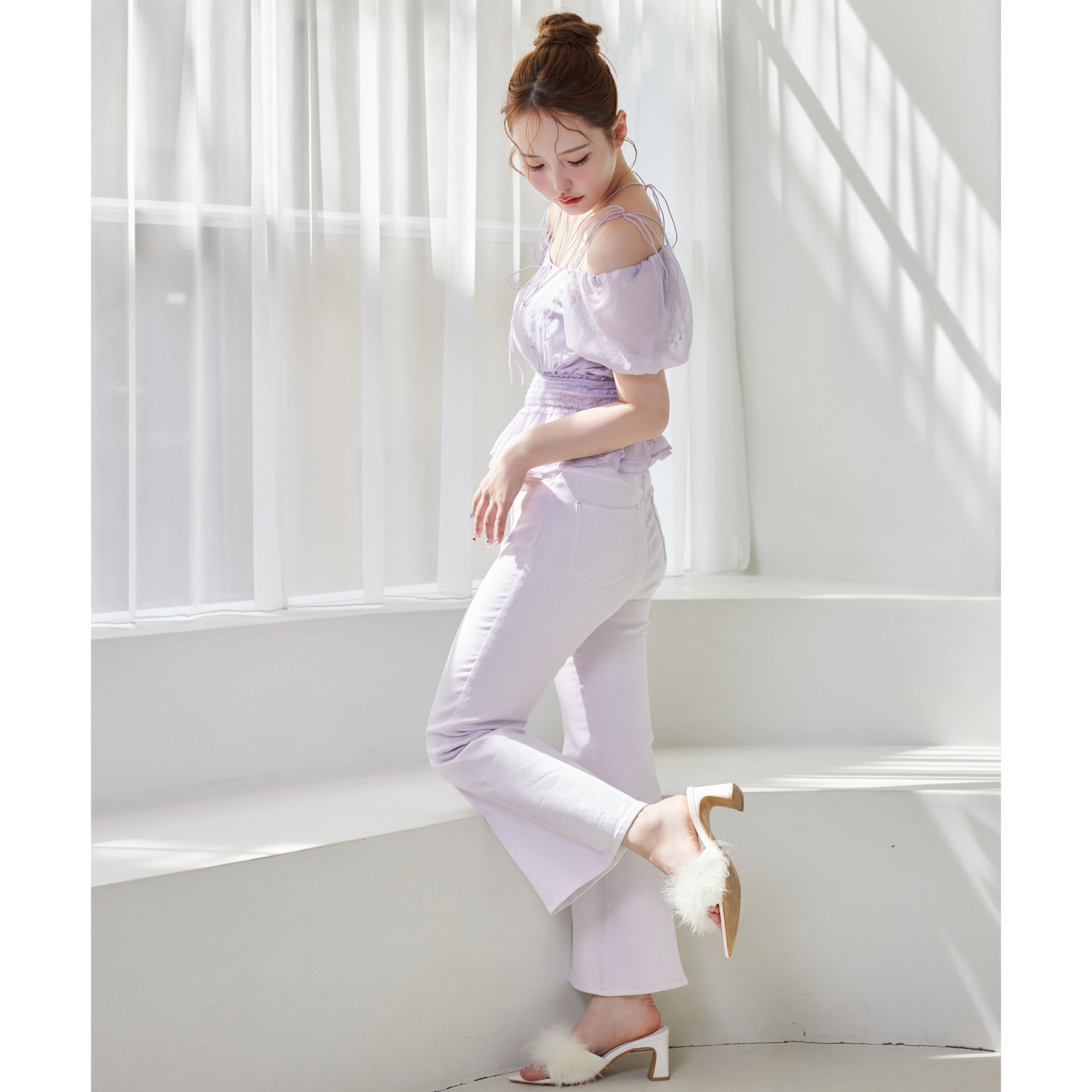 デニムパンツを合わせて甘さを抑えたカジュアルスタイルにしたり、