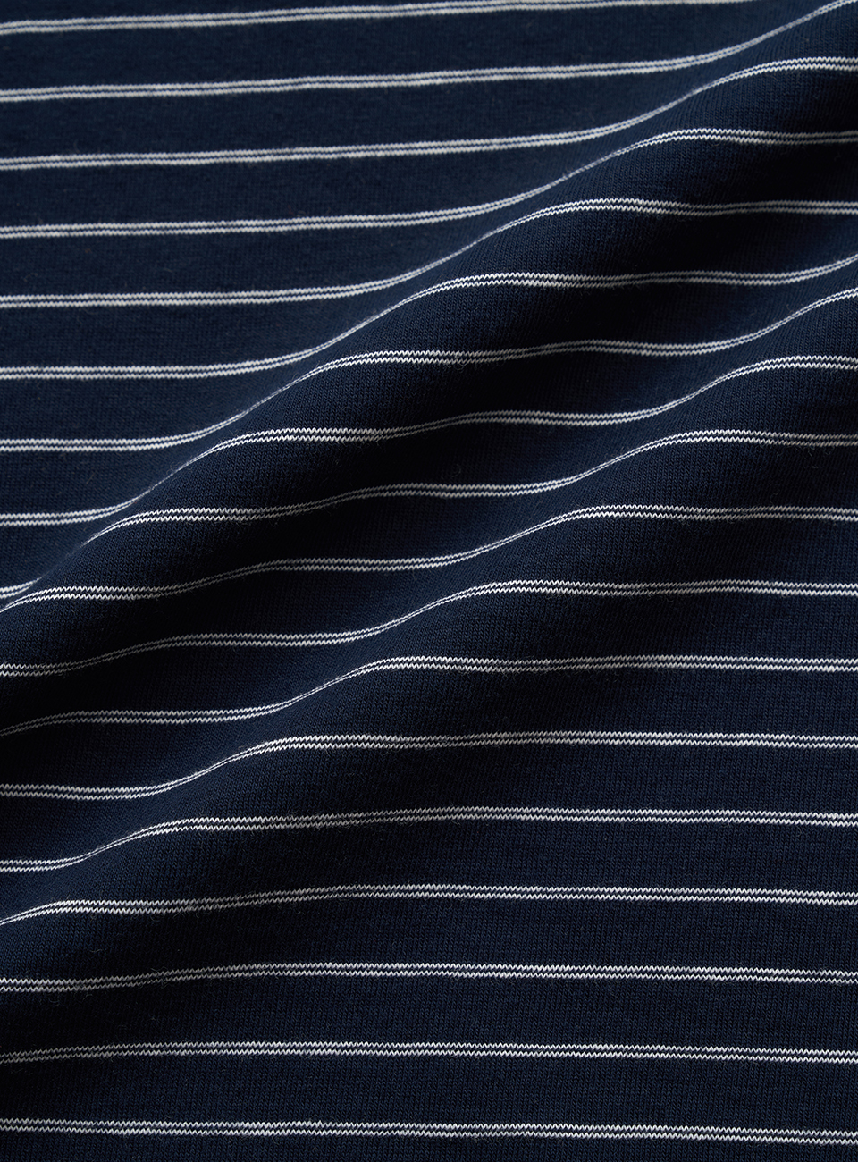深みのあるネイビーにホワイトのピンストライプ柄が映えるコットン素材