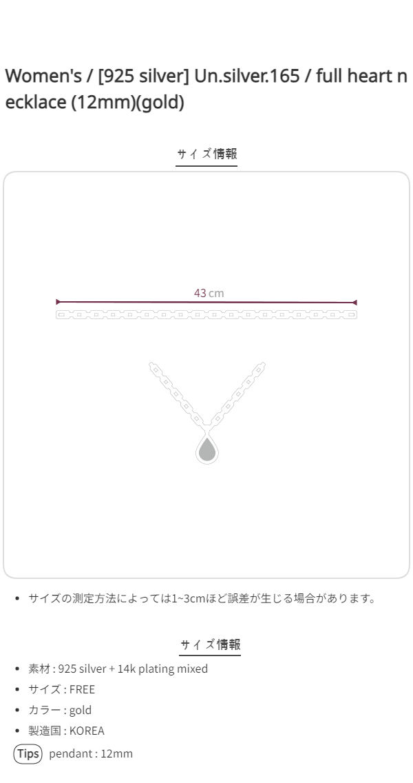 [925 silver] Un.silver.165 / full heart necklace (12mm)(gold)