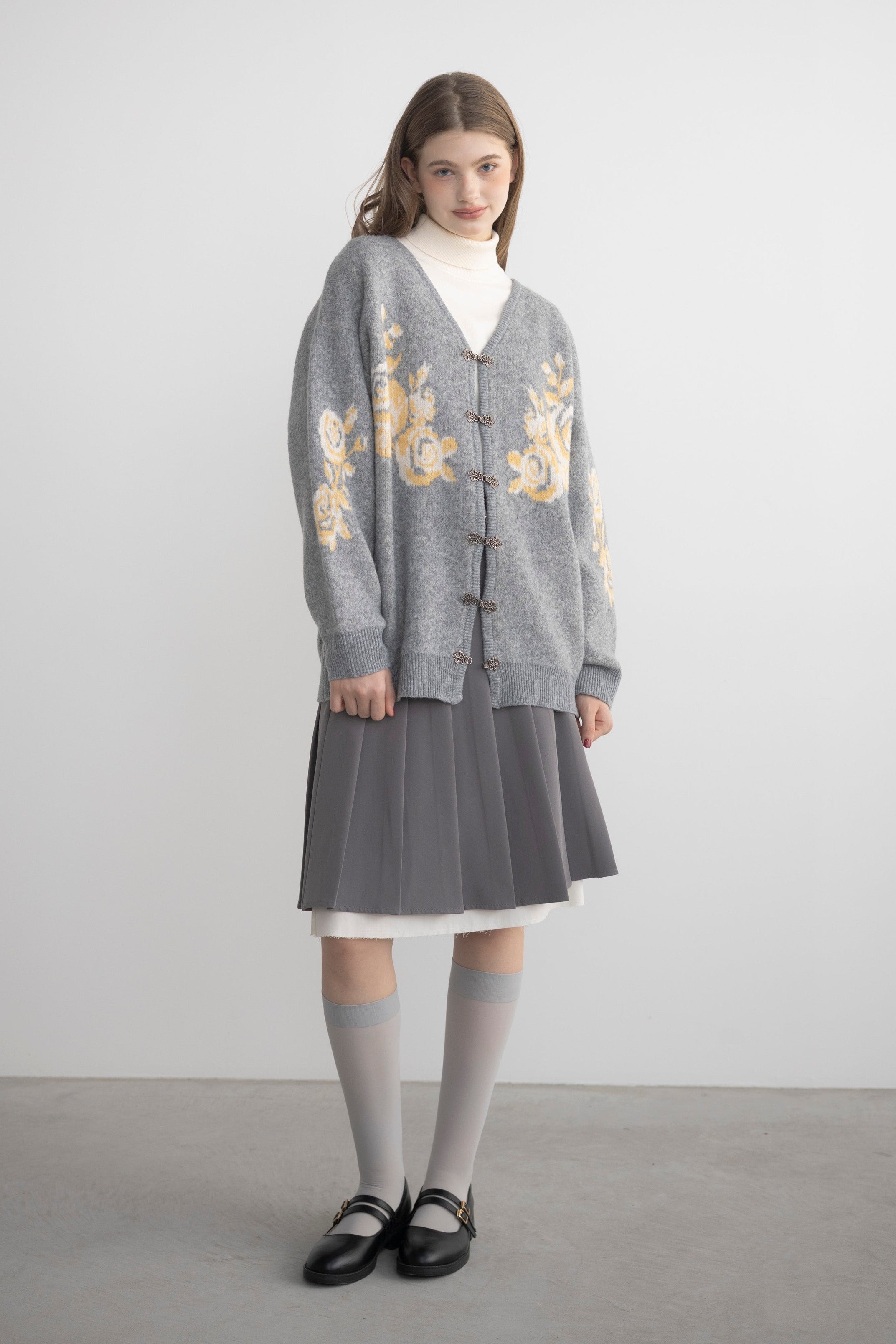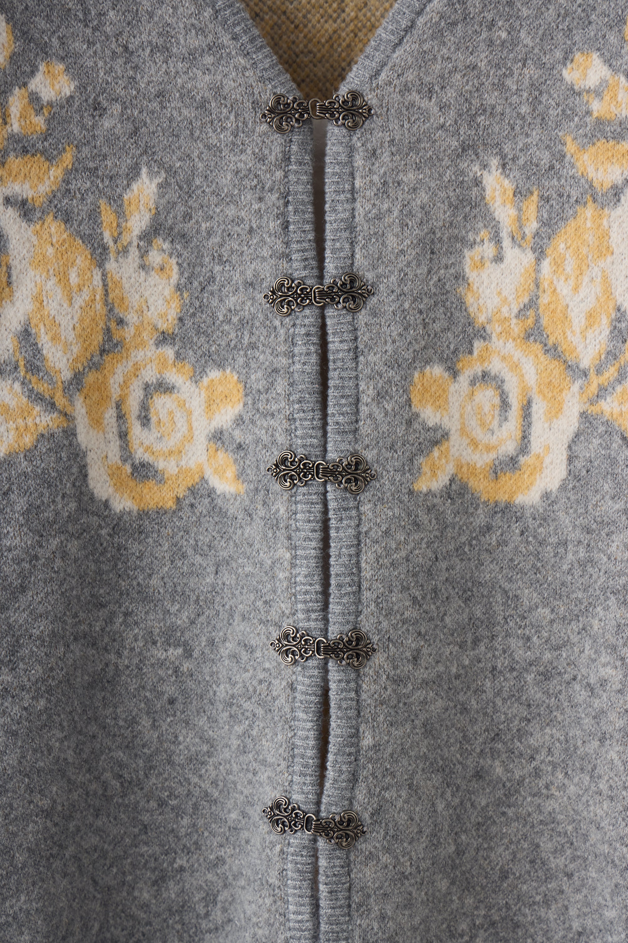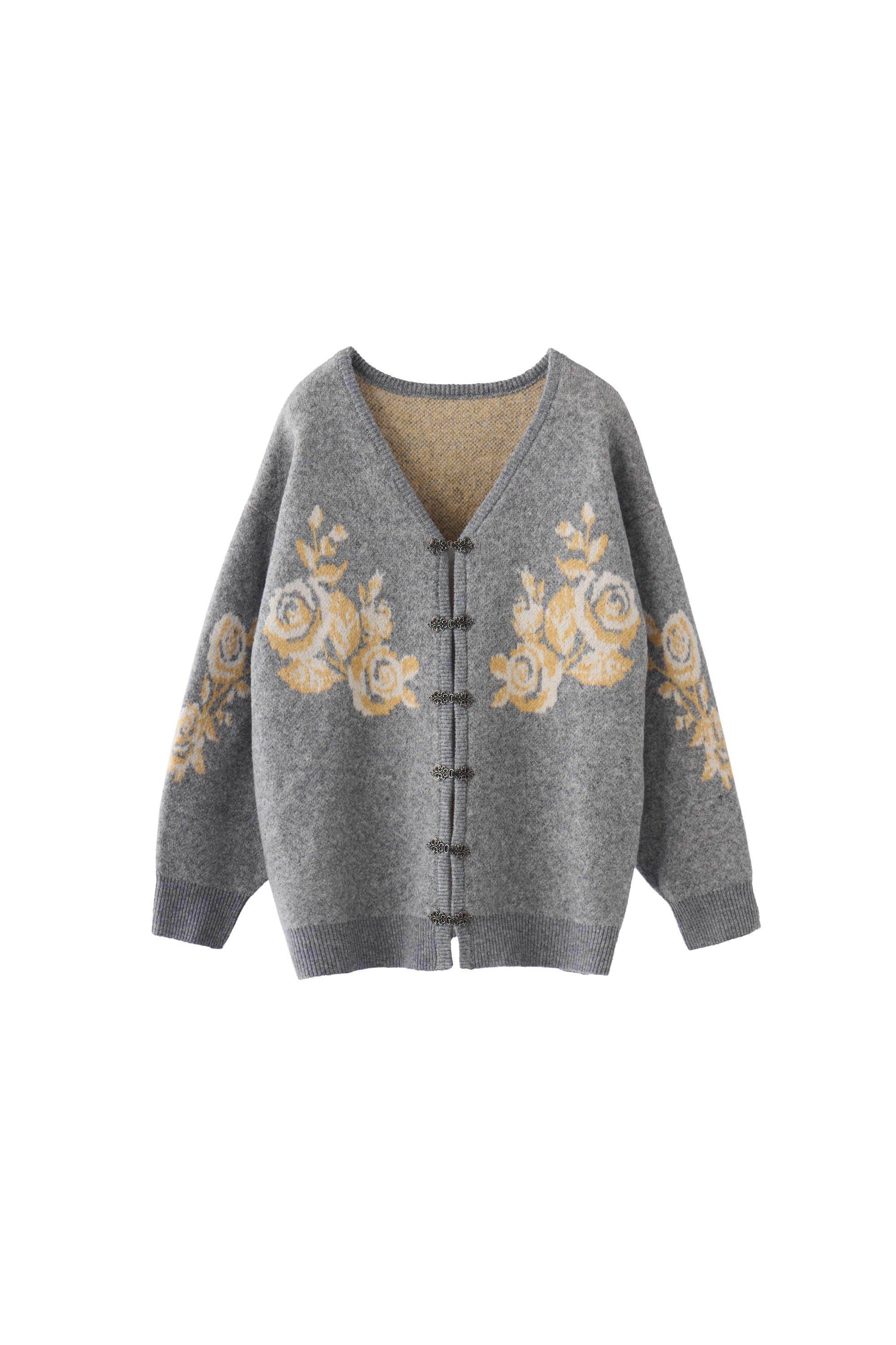 メタルフックと存在感のあるオリジナル花柄がポイントのニットカーディガン。