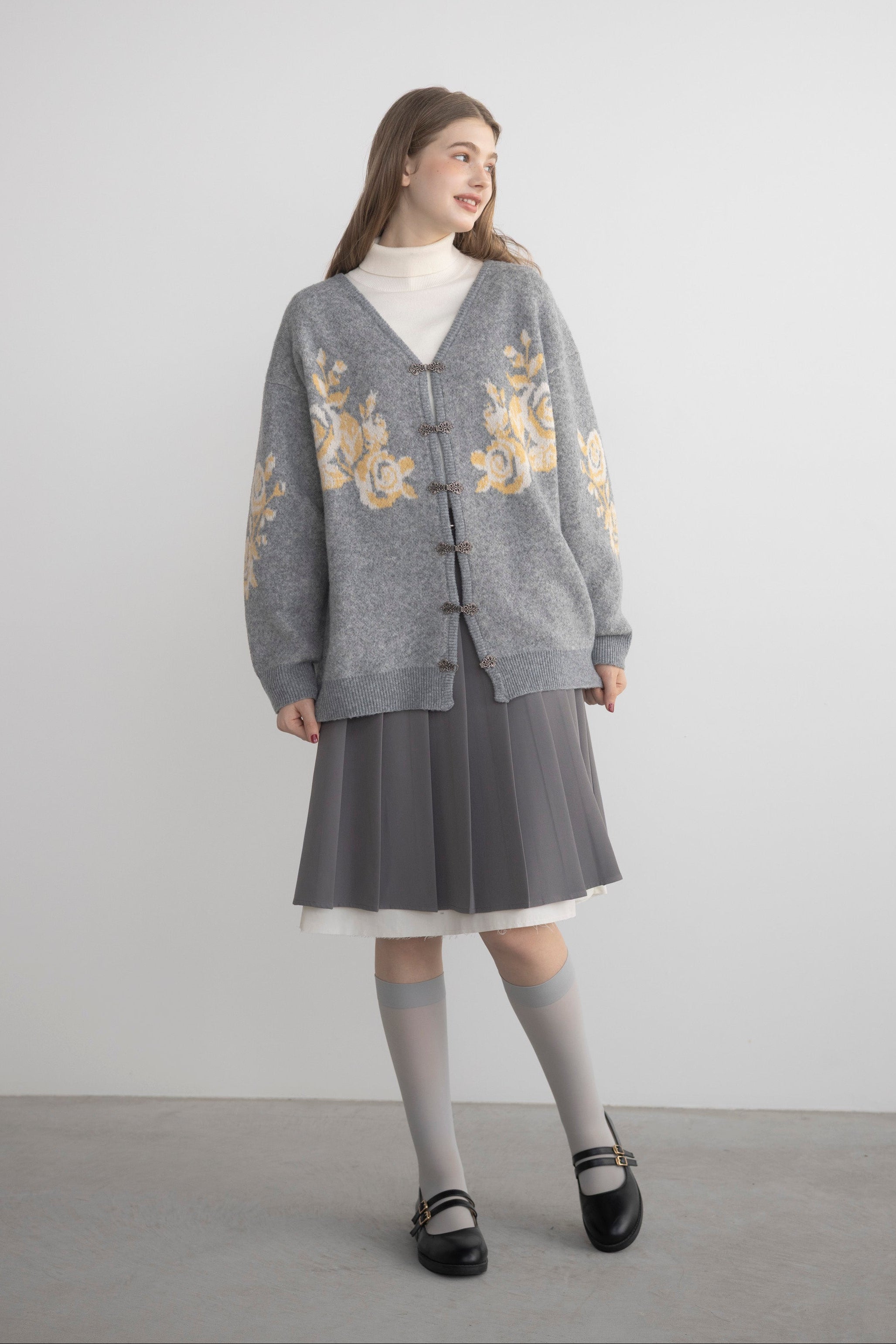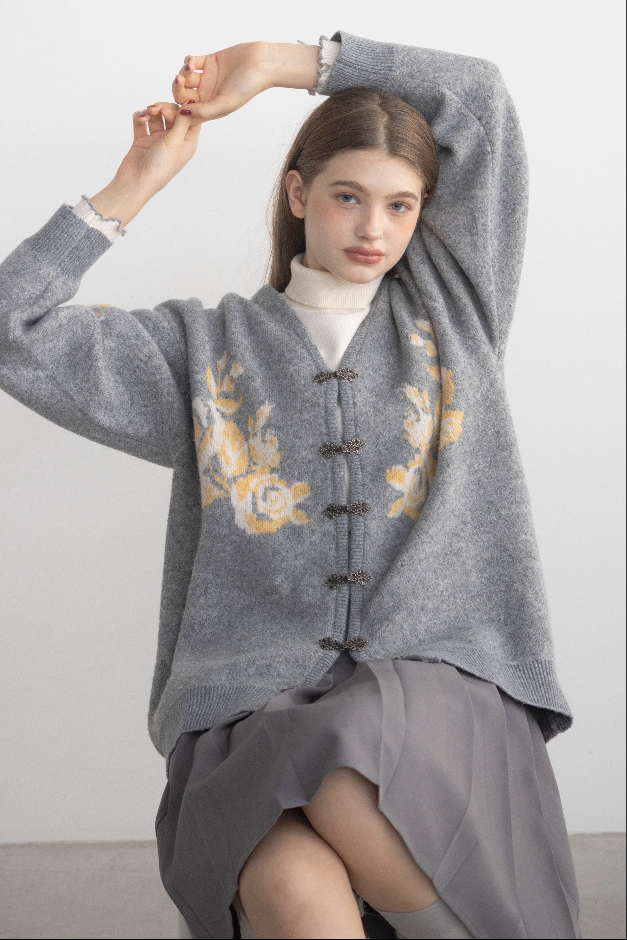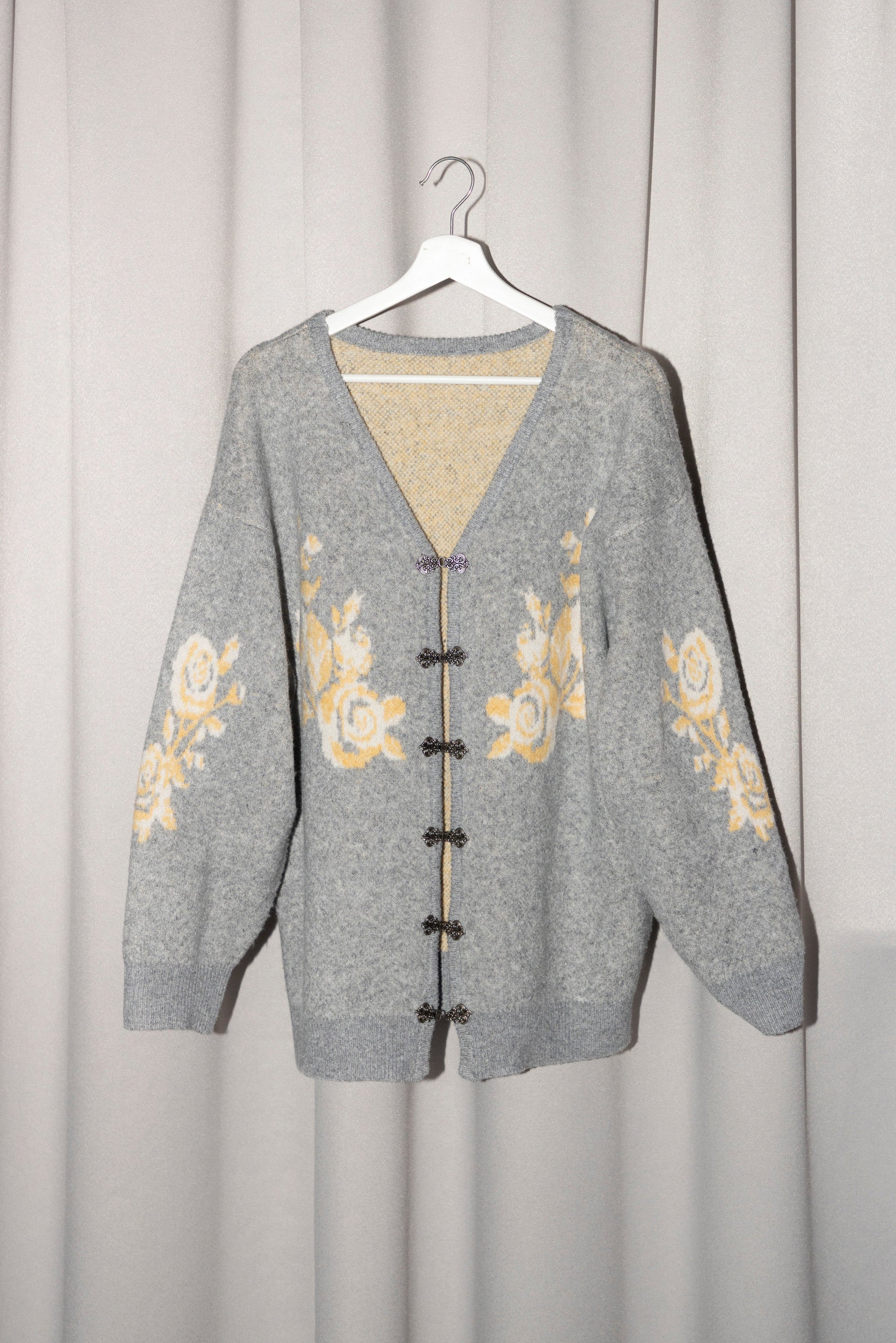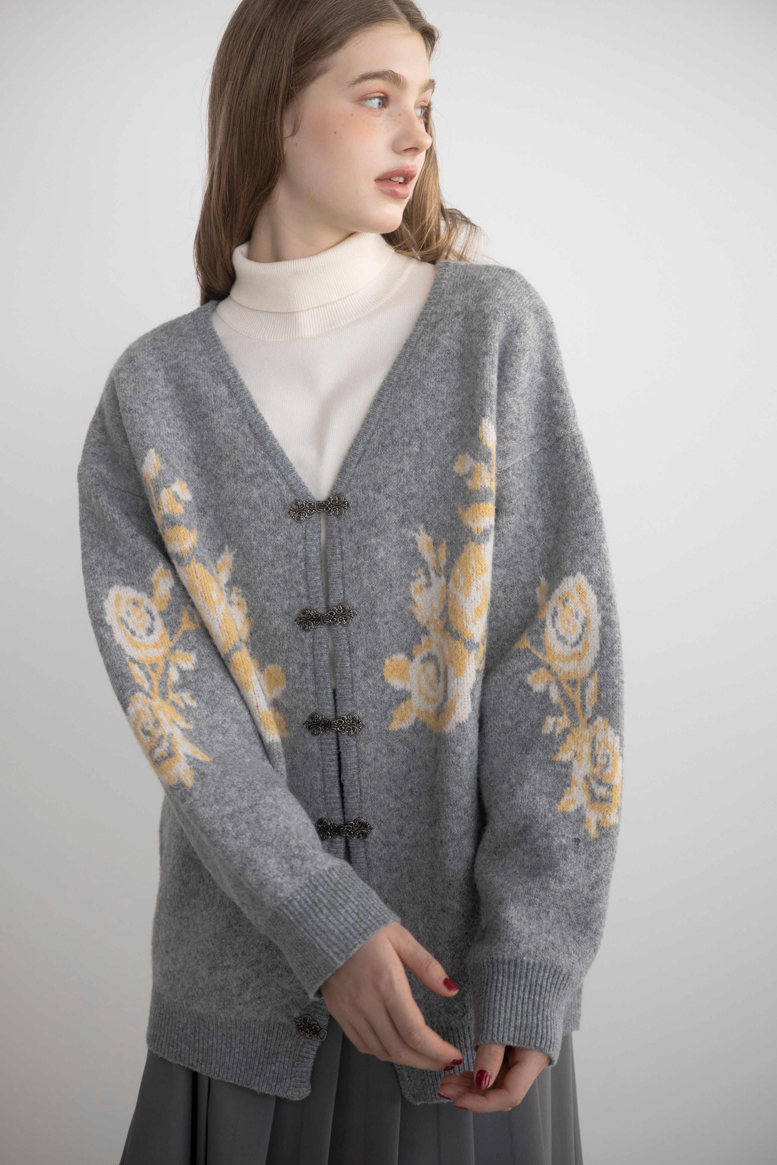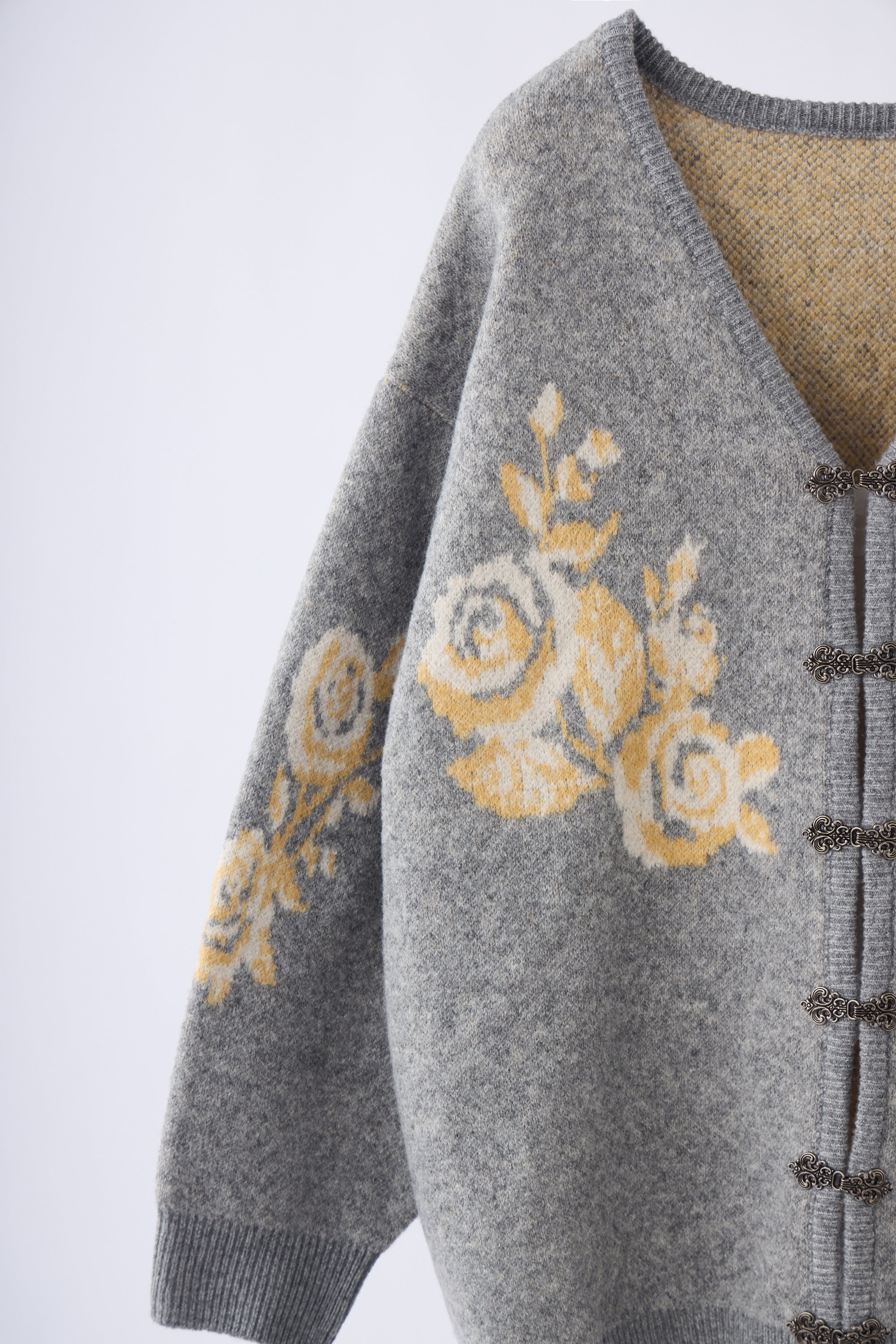 上品な花柄とメタルフックが魅力のニットカーディガン