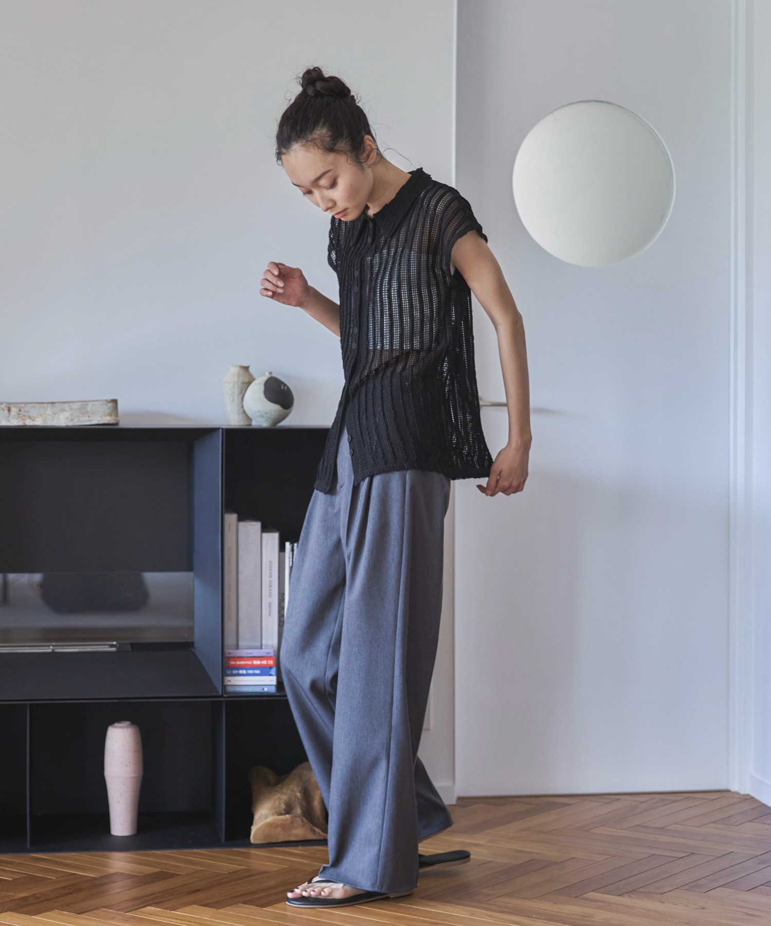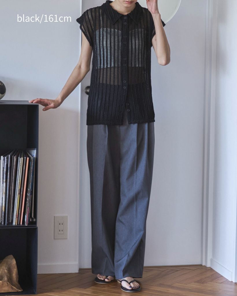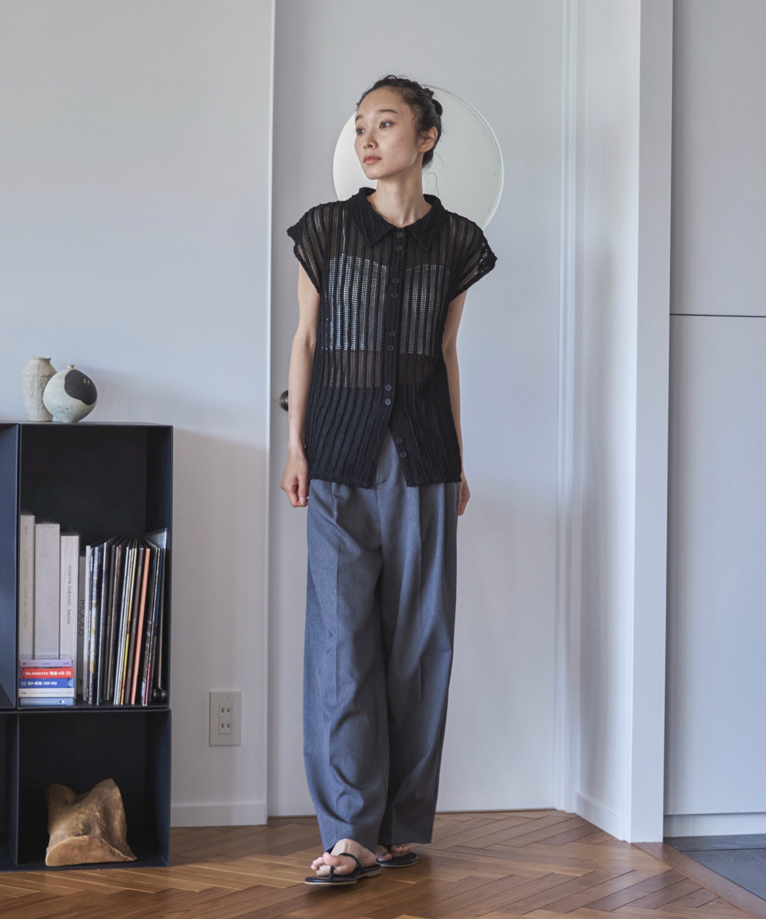 一見ニット見えするアイテムですが、サラッとしたポリエステル生地で涼しくお召しいただけます。