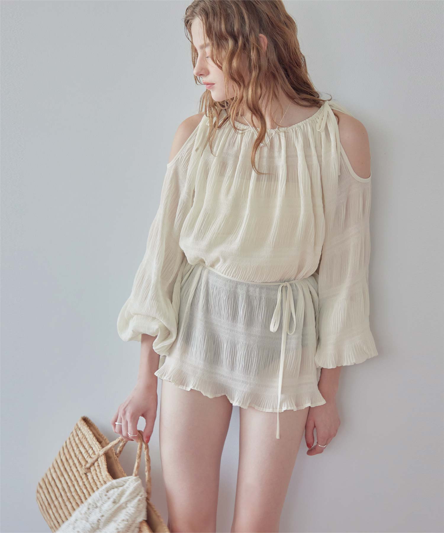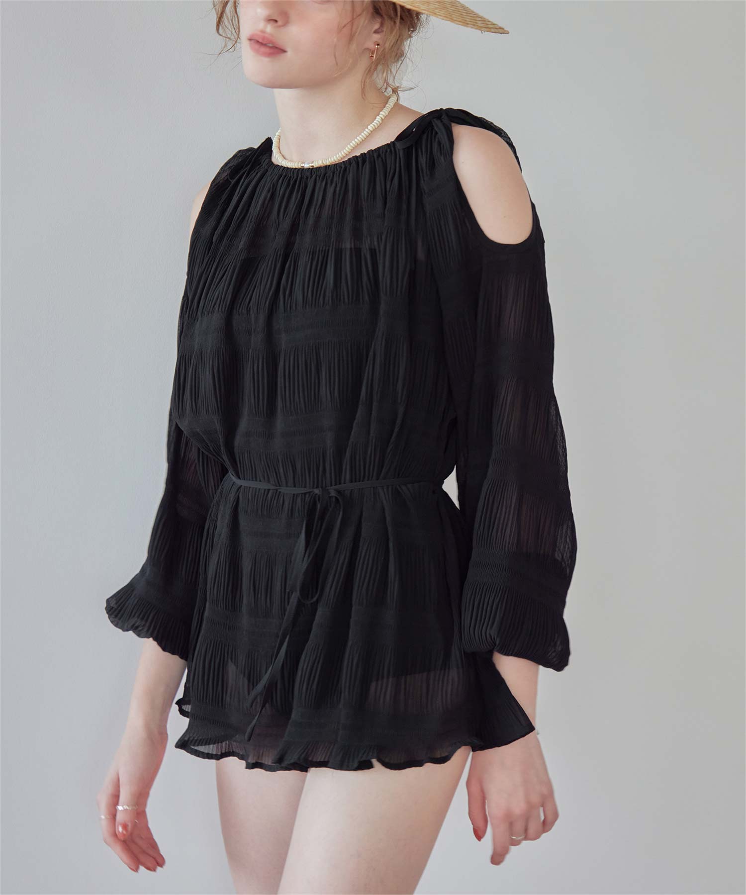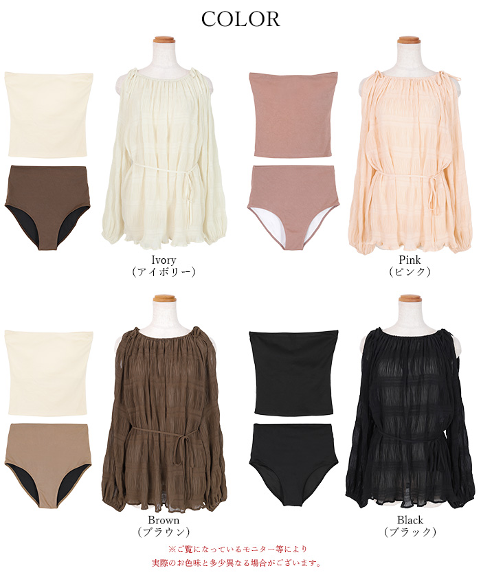 ・透け感のあるオープンショルダートップスがセットになった、大人可愛い3点セット水着。