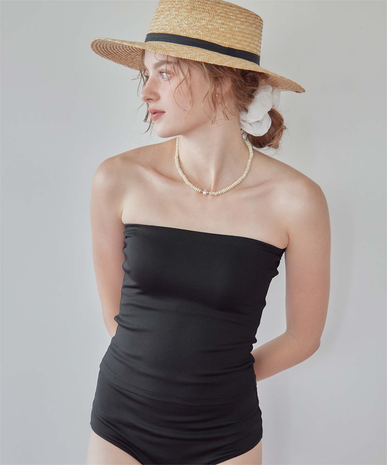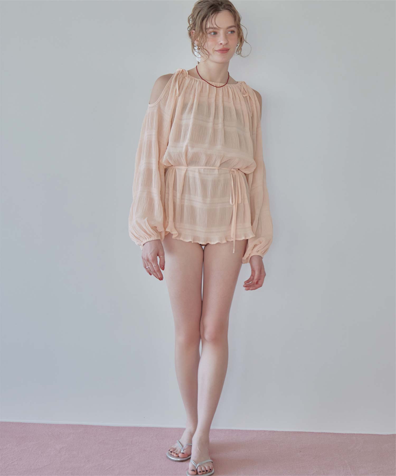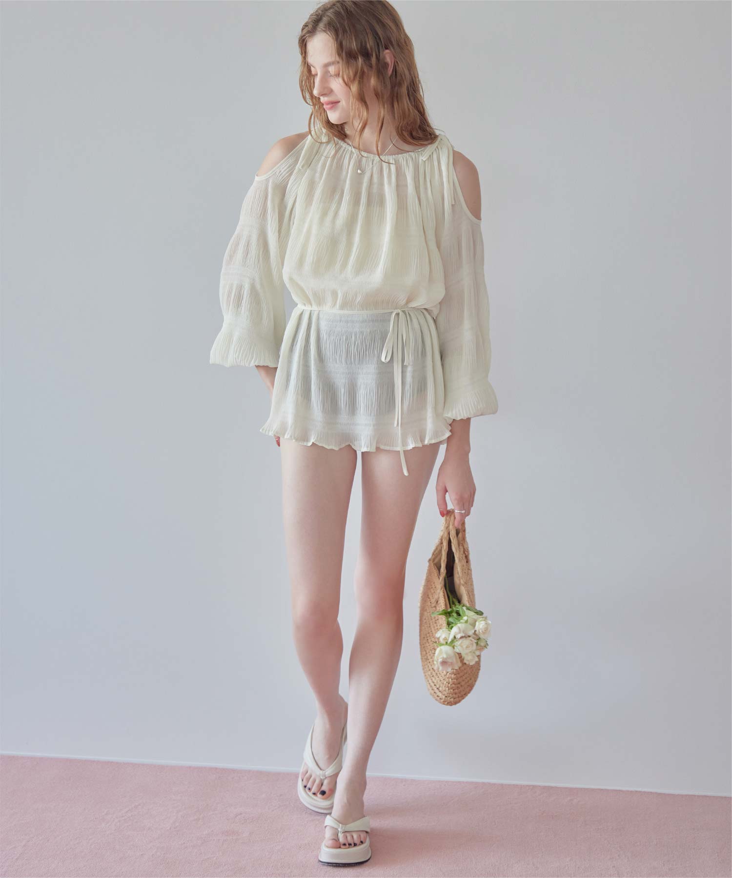 ・透け感のあるオープンショルダートップスがセットになった、大人可愛い3点セット水着。