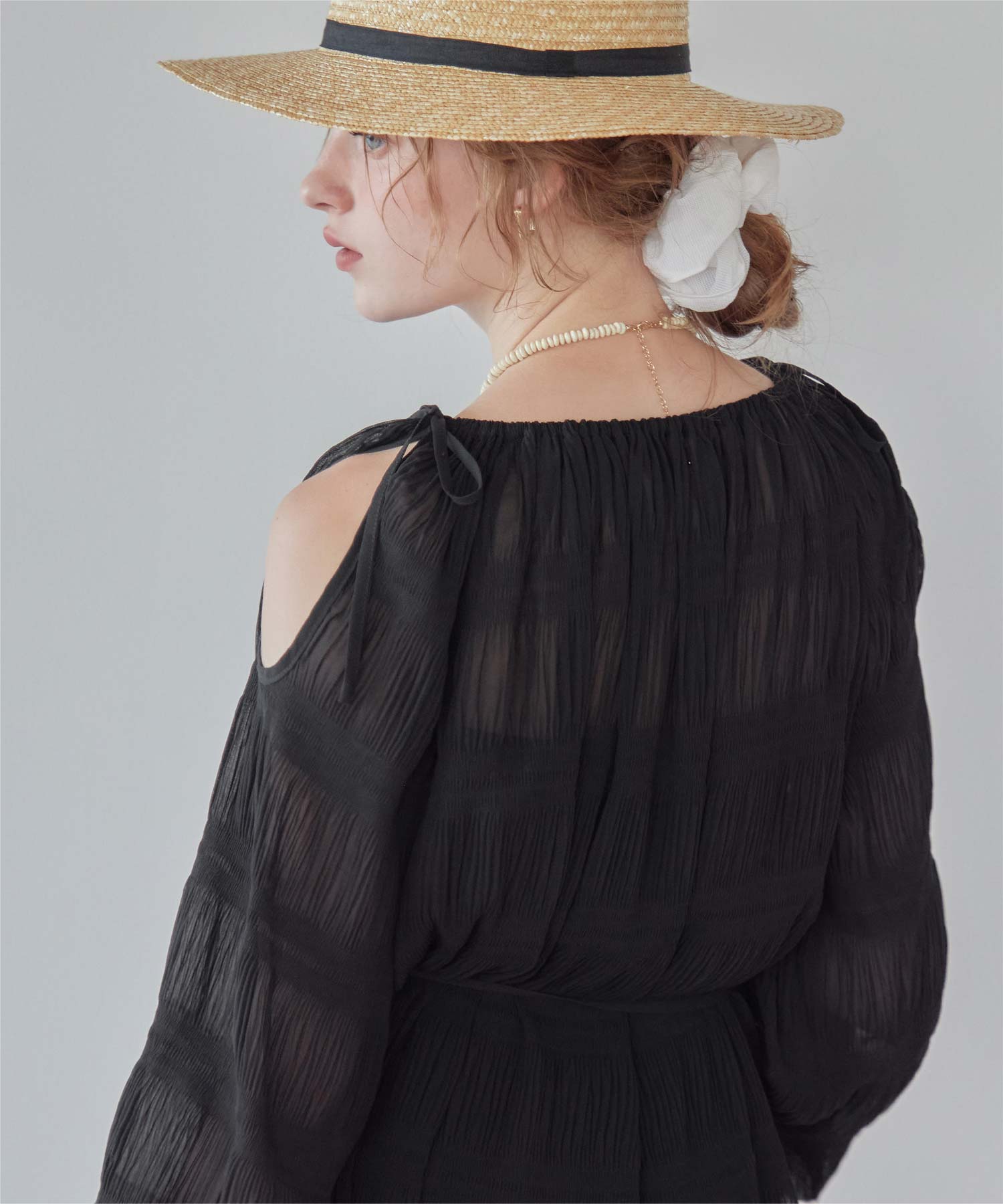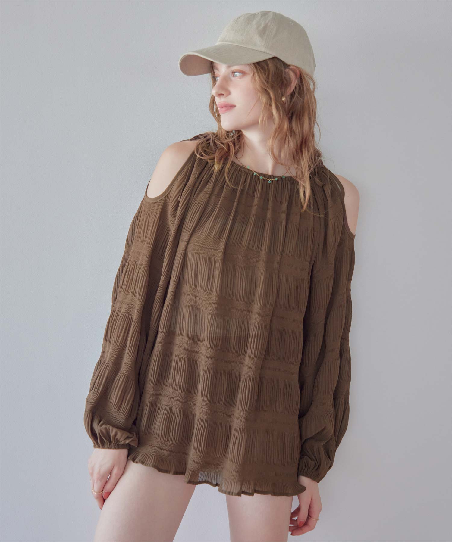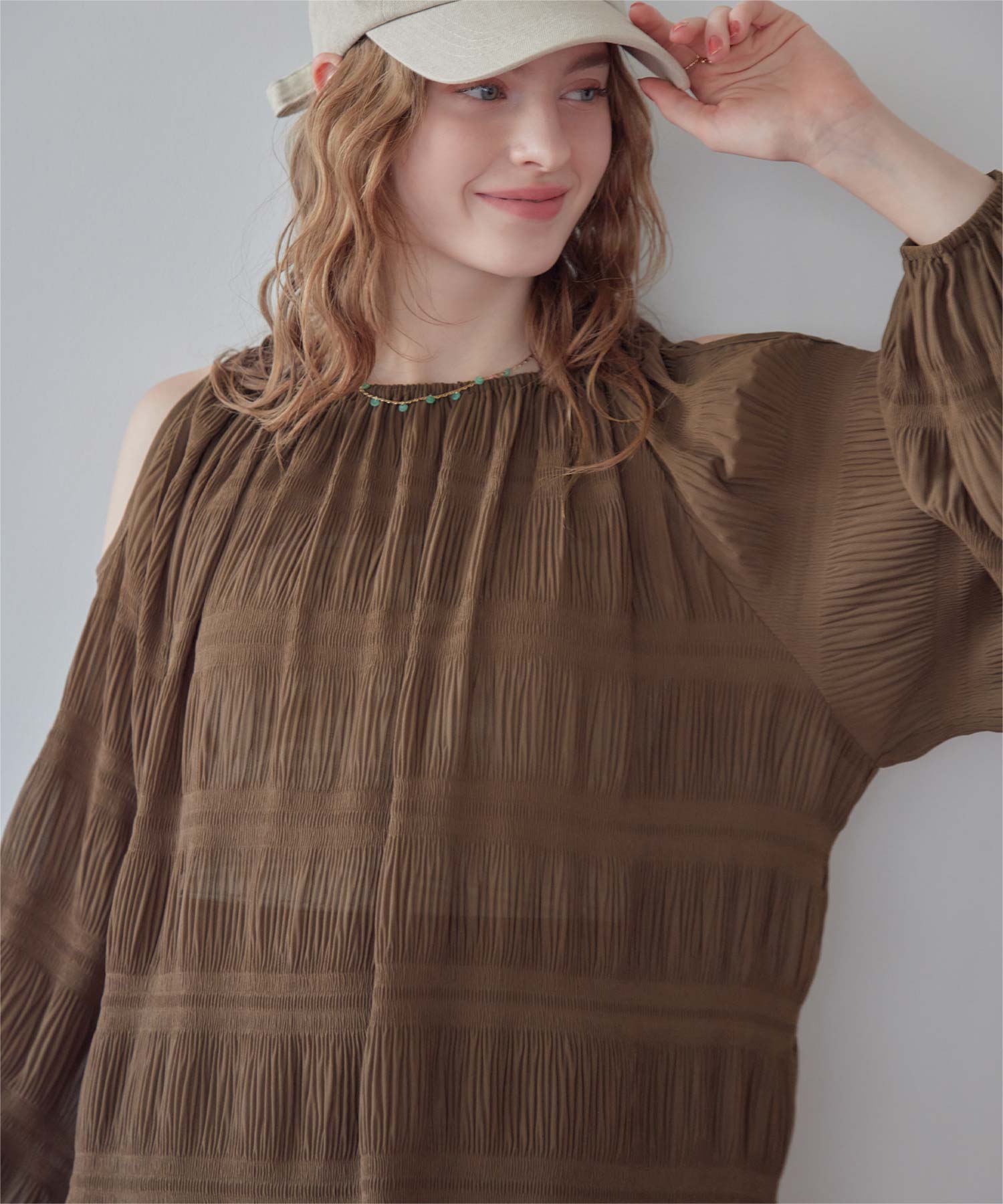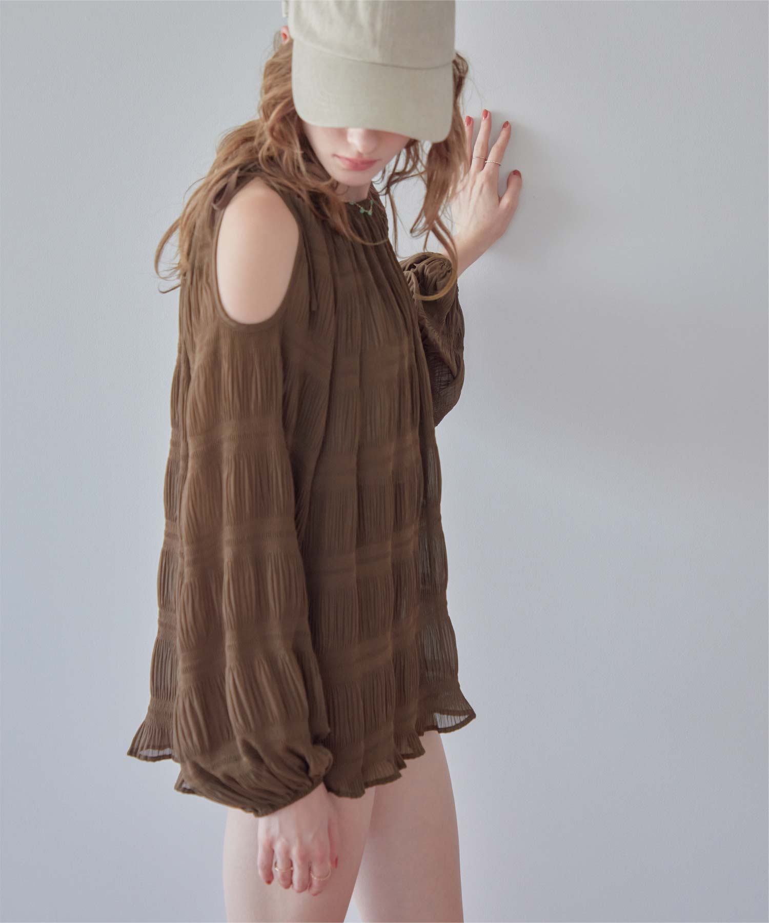 ・肩まわりをさりげなく見せるデザインで、ヘルシーな抜け感を演出。