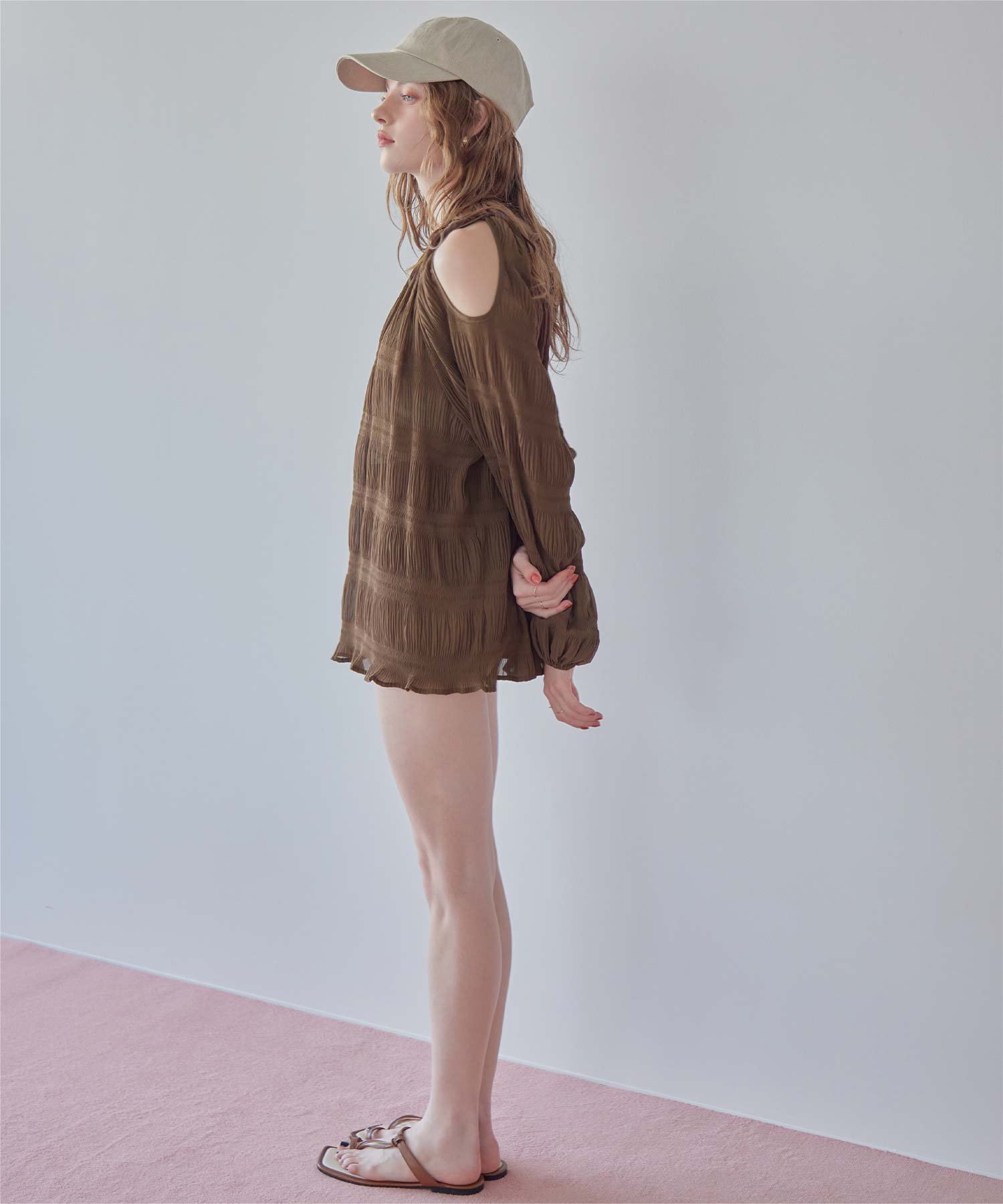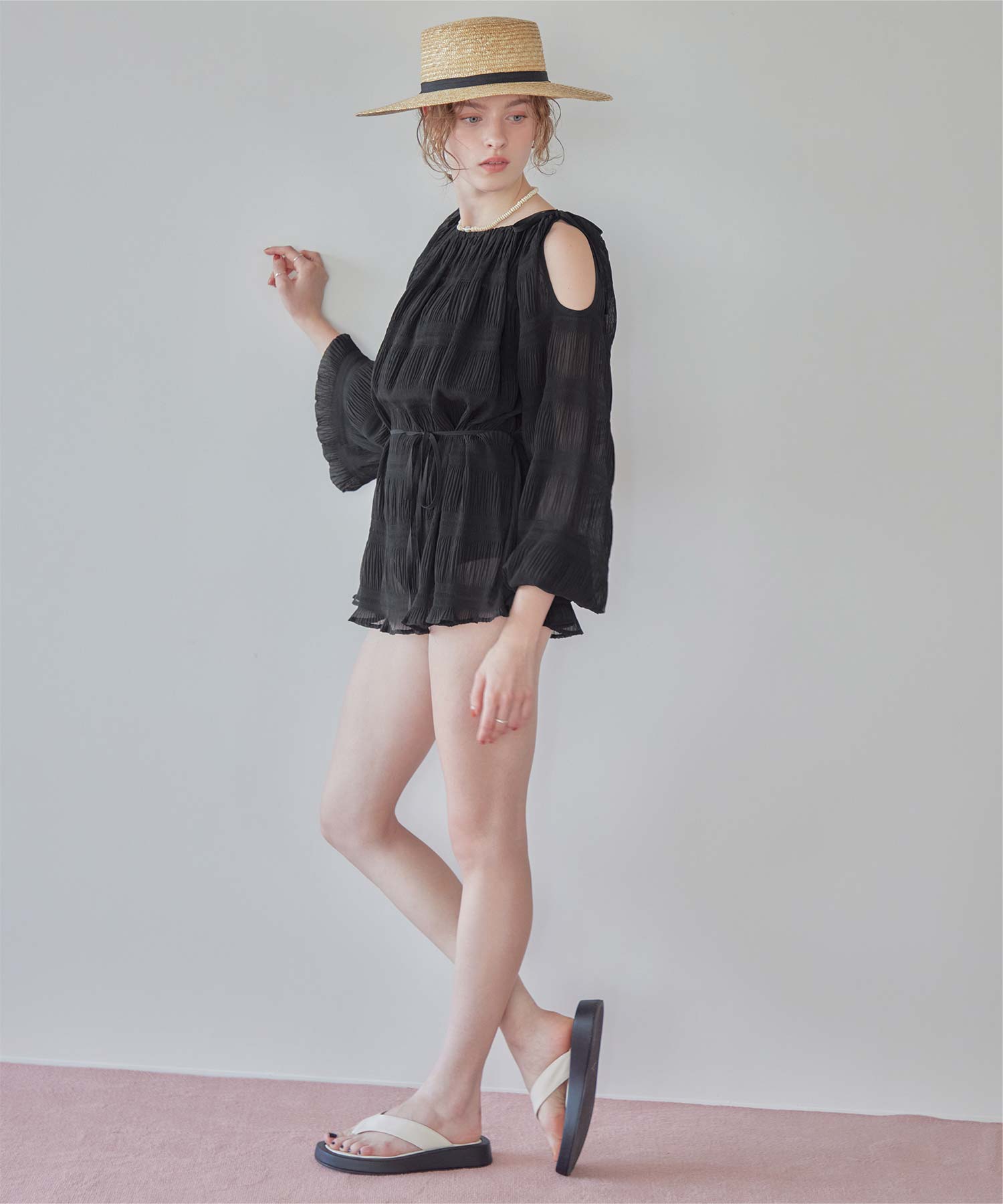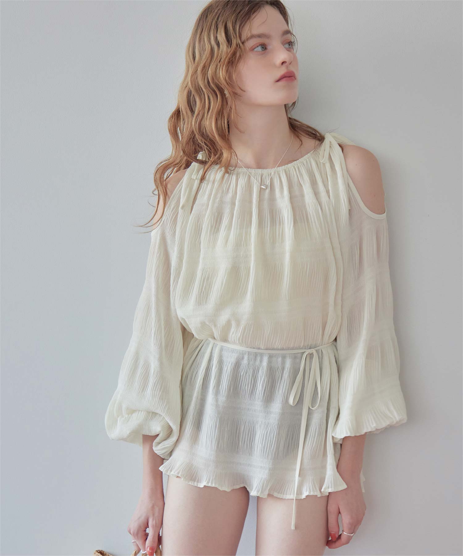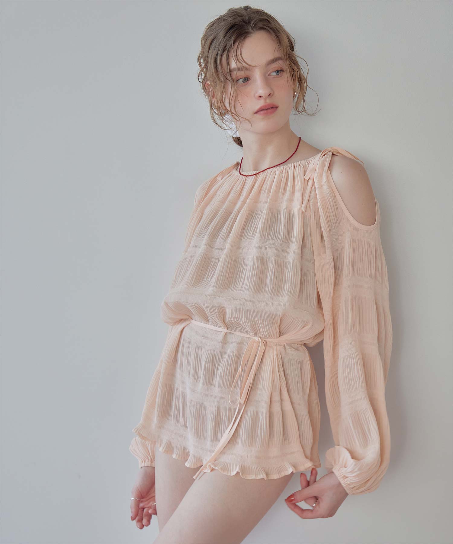 ・肩まわりをさりげなく見せるデザインで、ヘルシーな抜け感を演出。