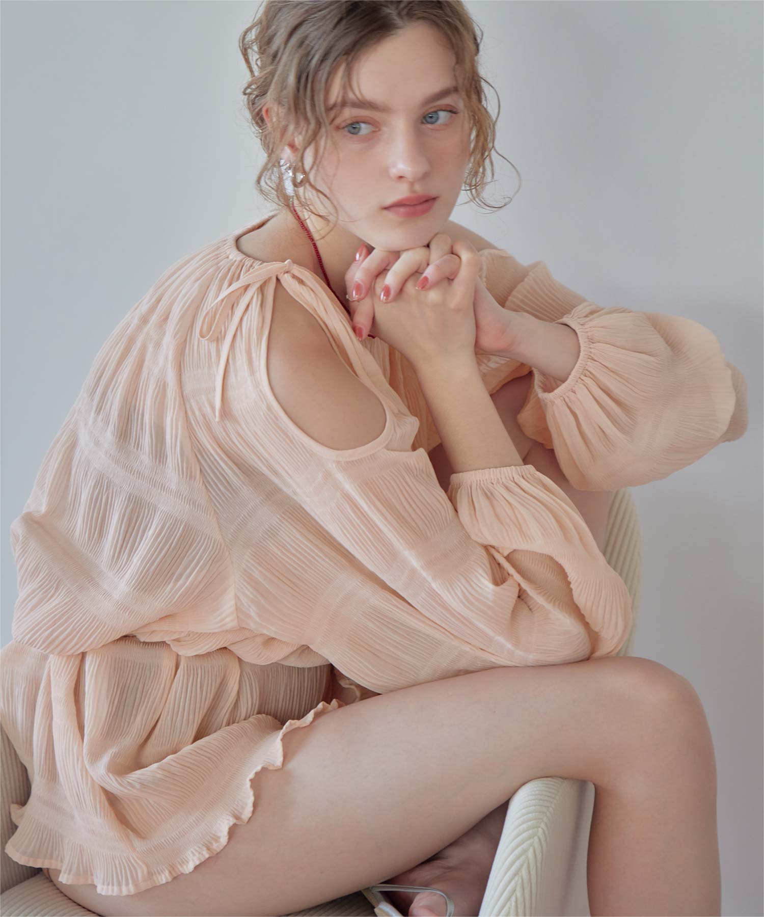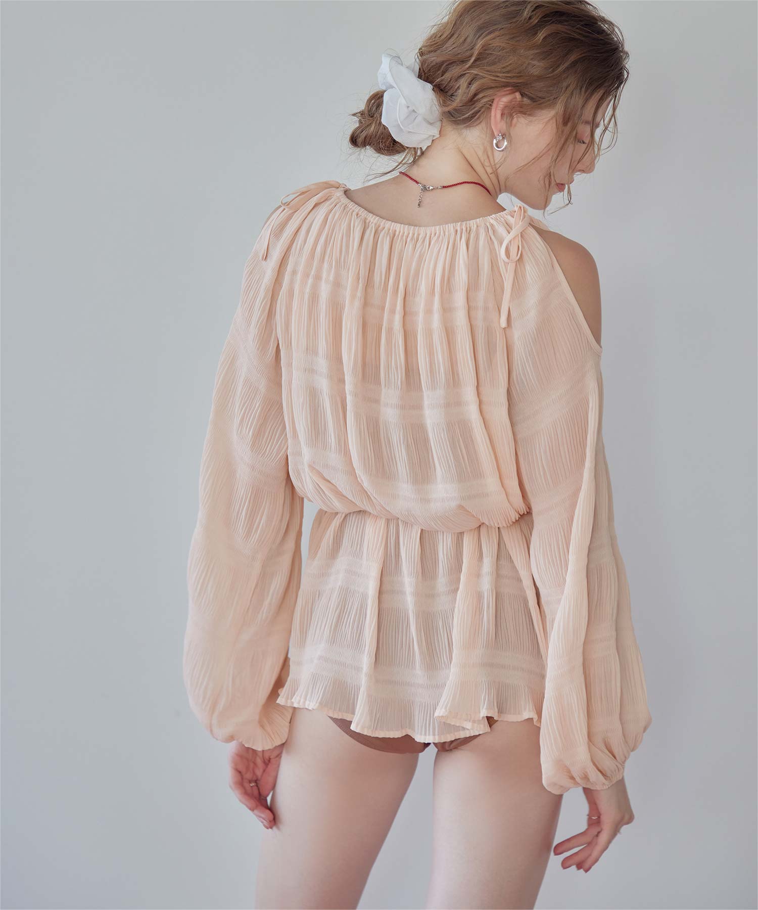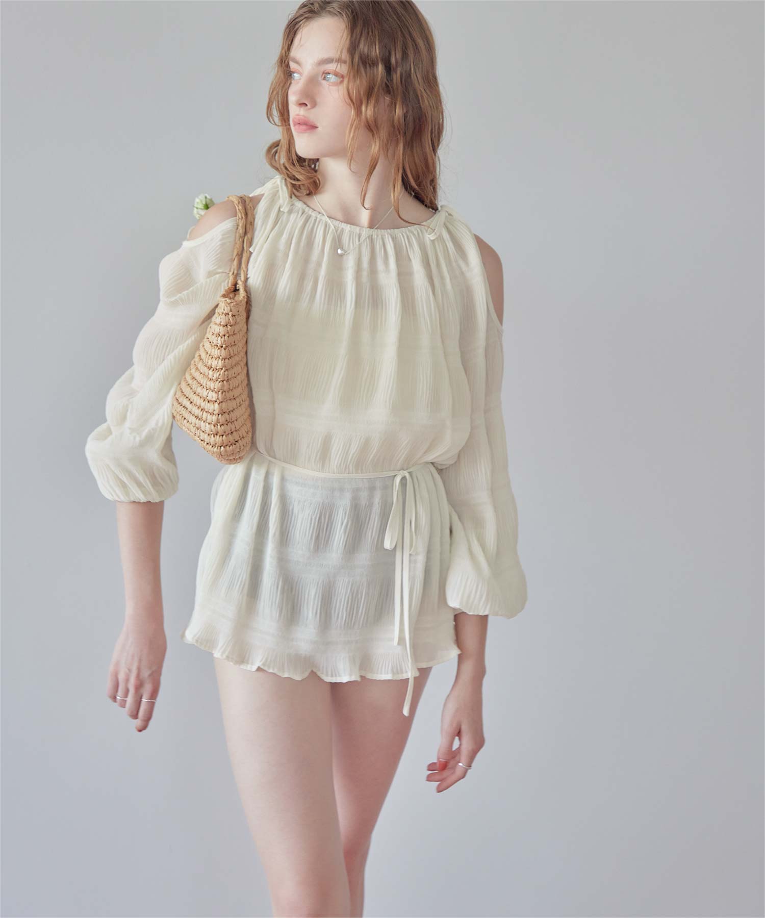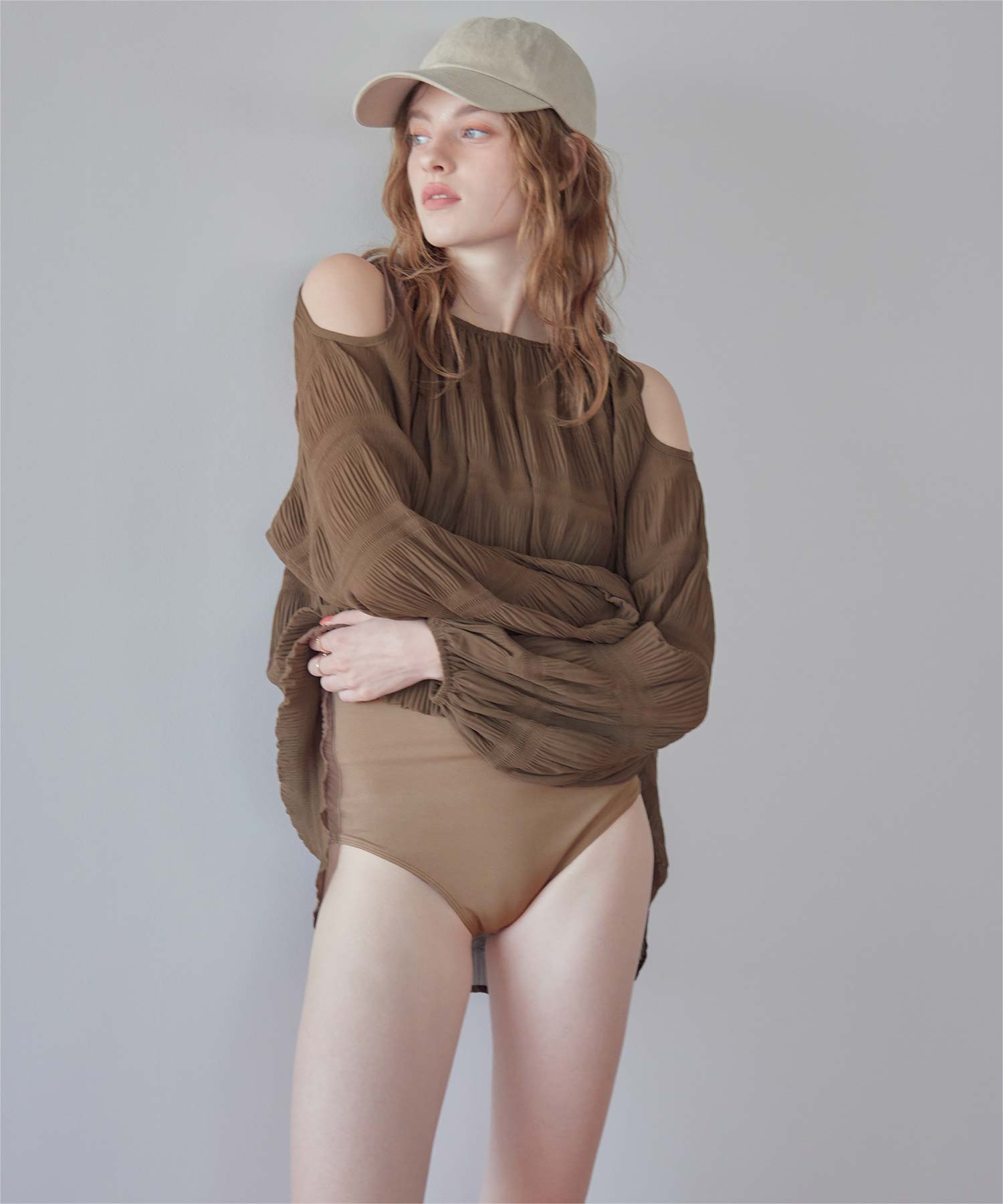 ・肩まわりをさりげなく見せるデザインで、ヘルシーな抜け感を演出。