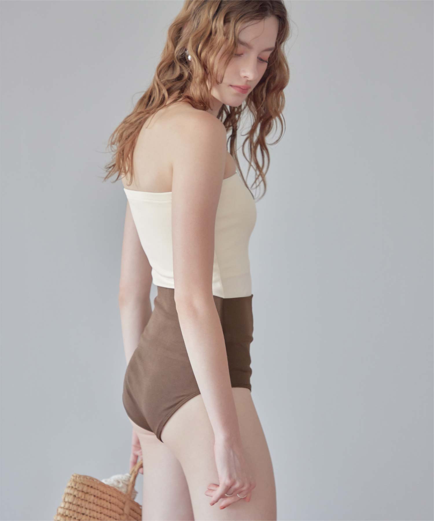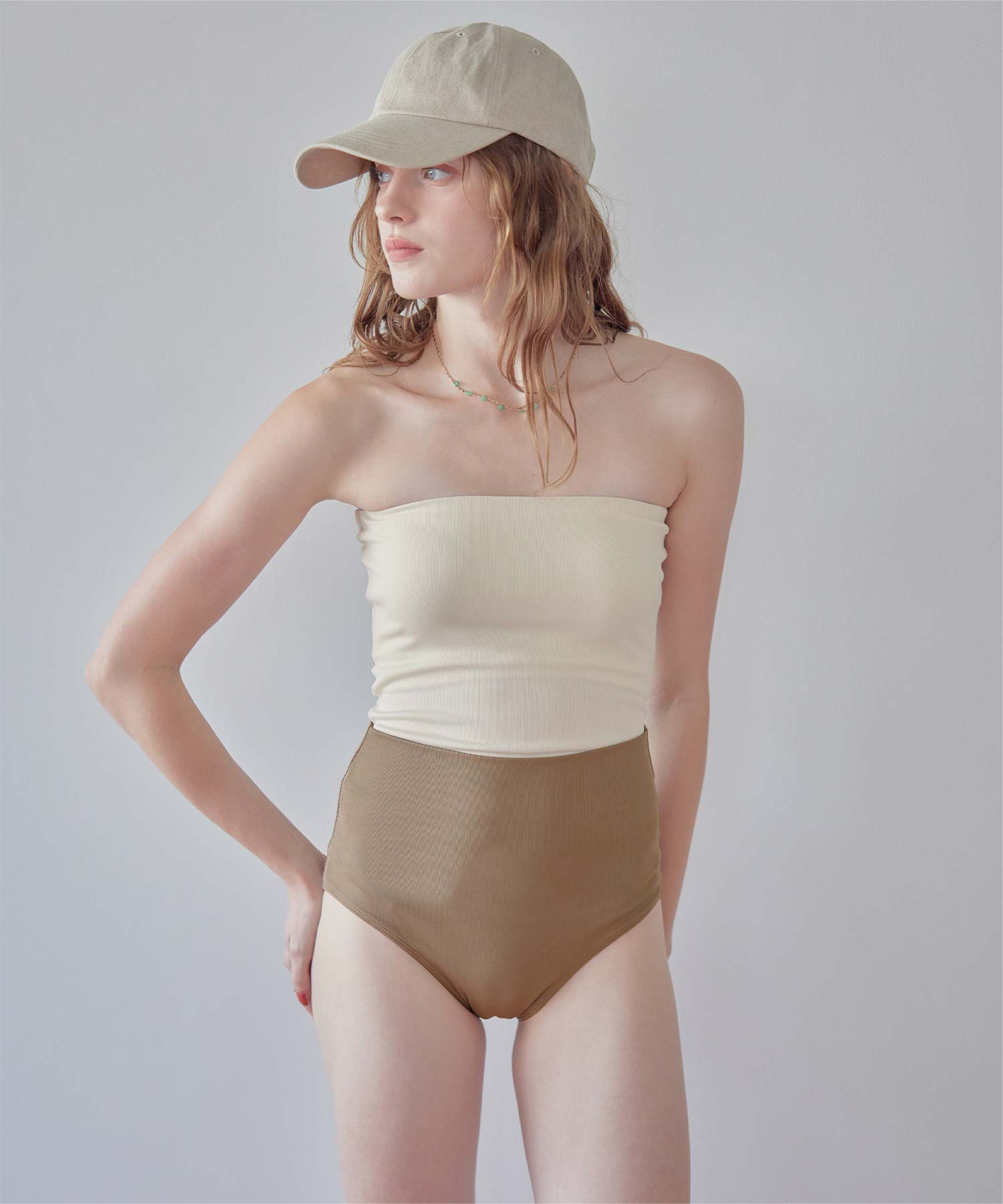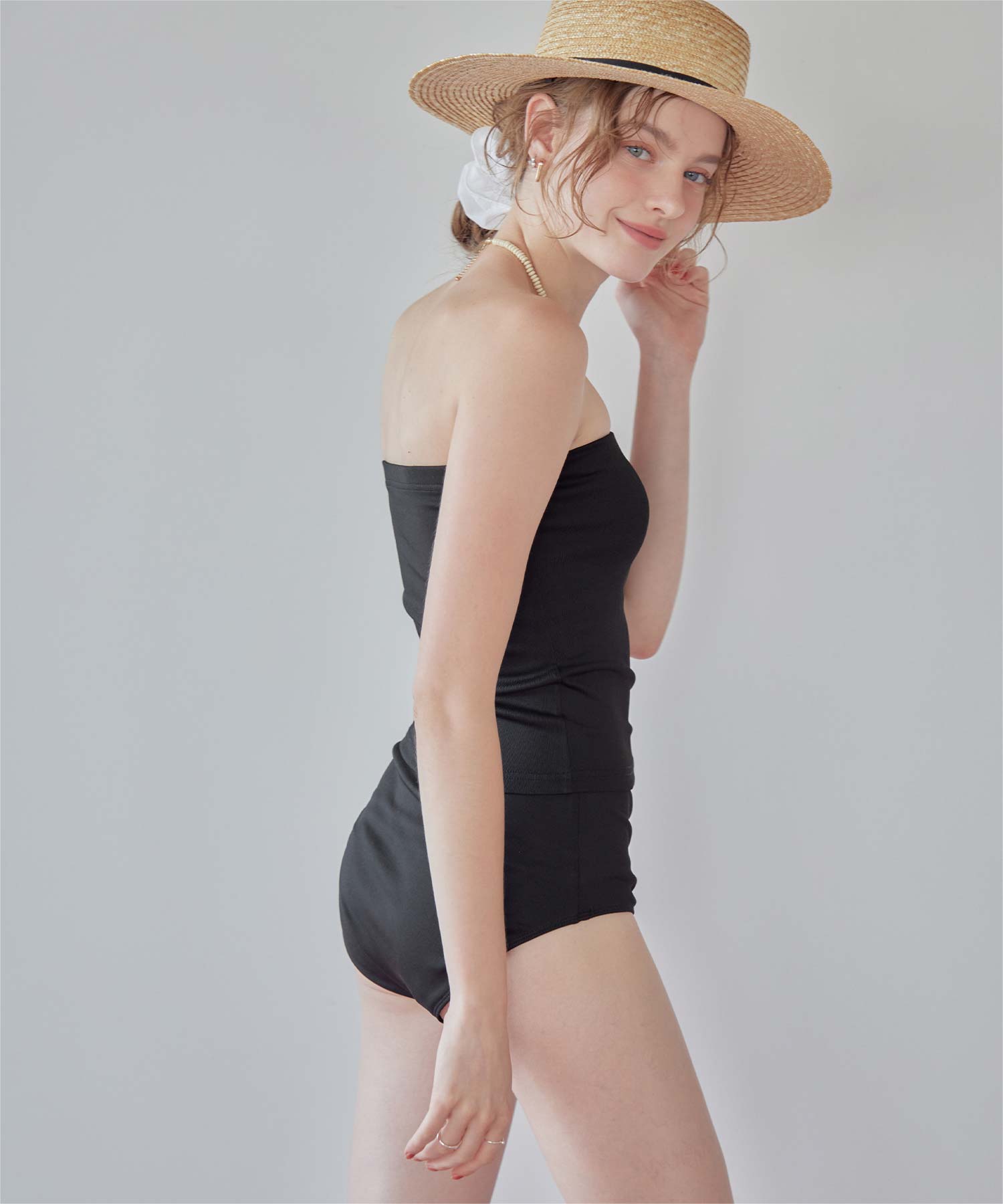 ・インナーはセパレートデザインなのにワンピース見えが叶うマルチway細リブ素材ビキニです。