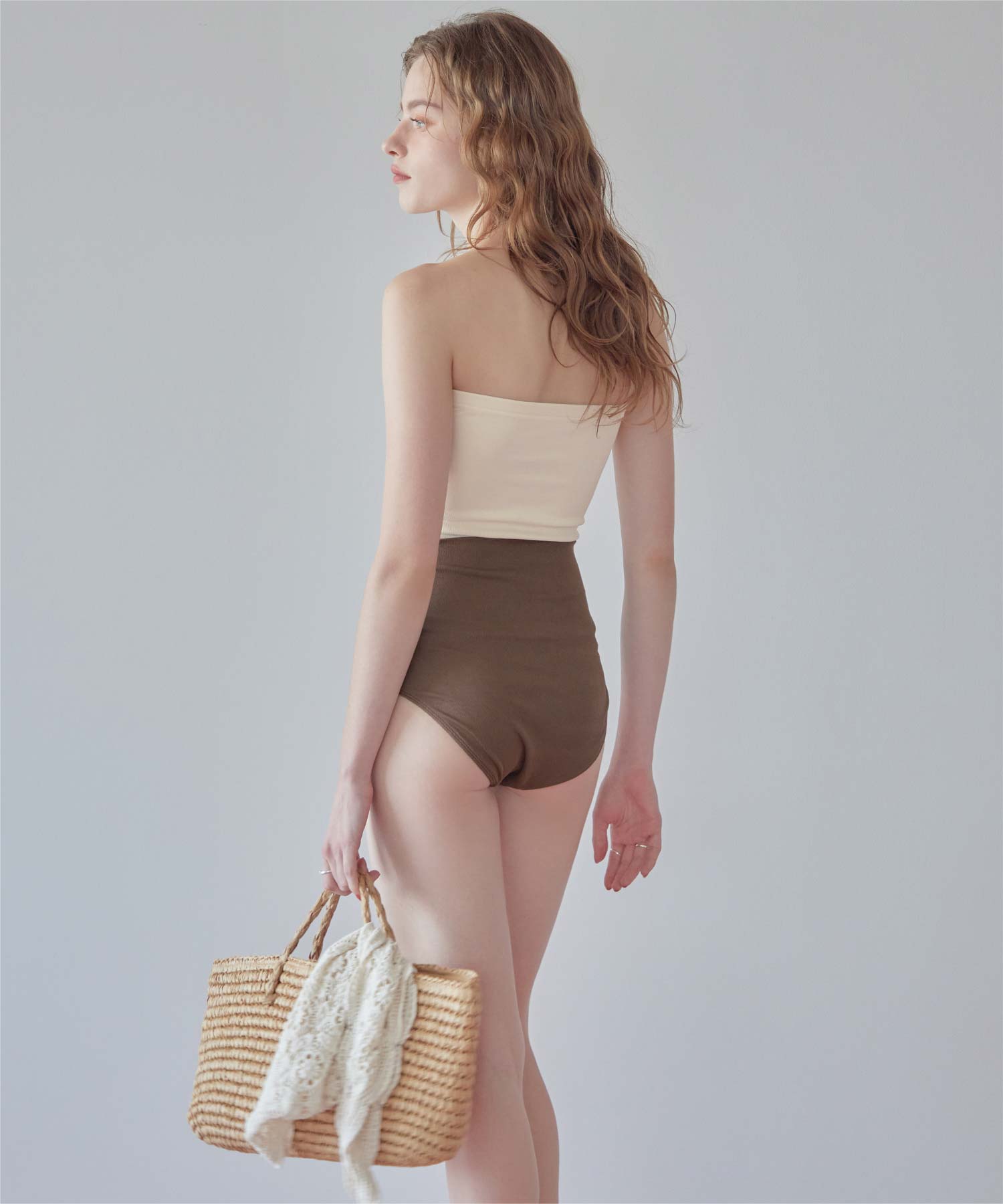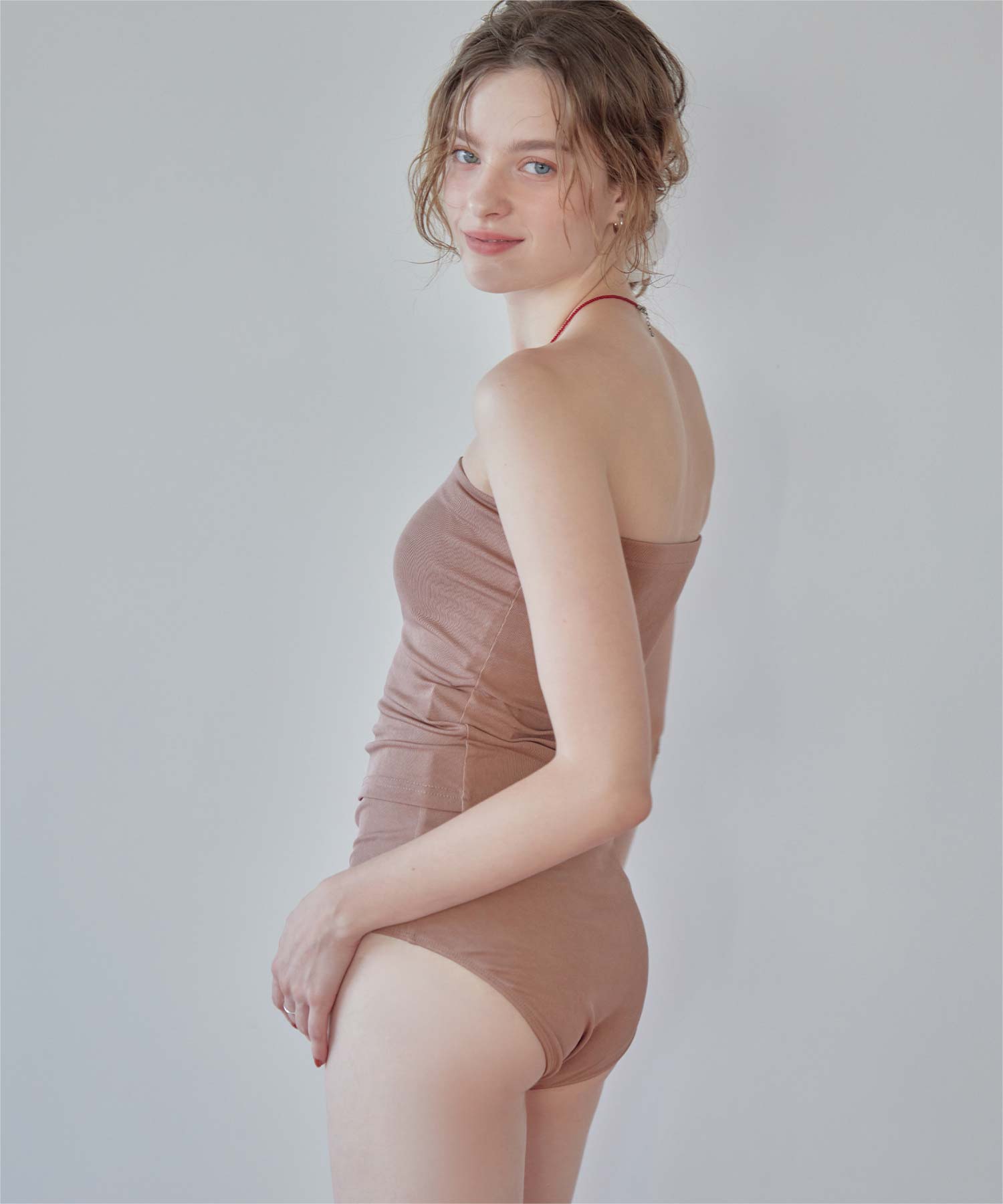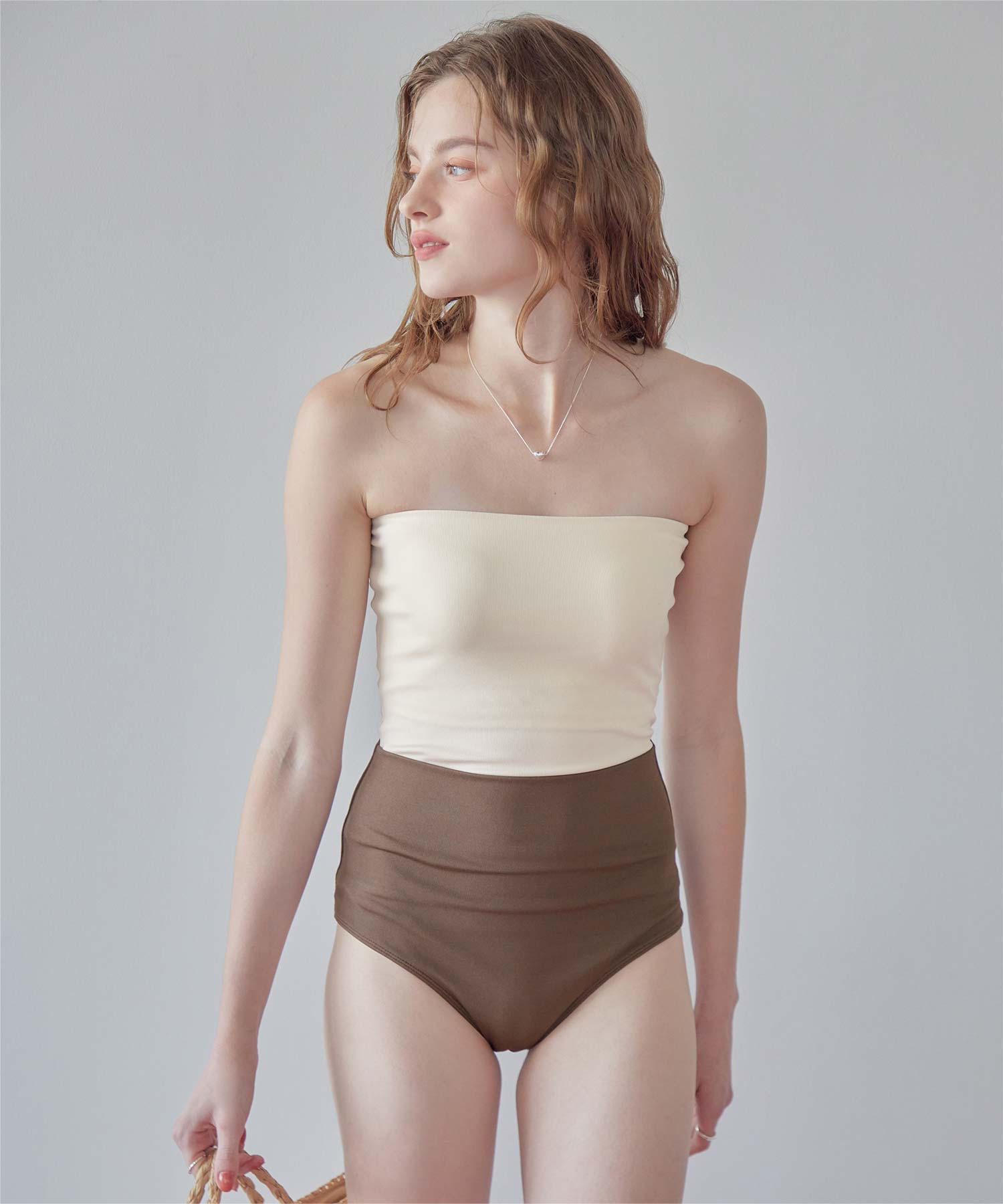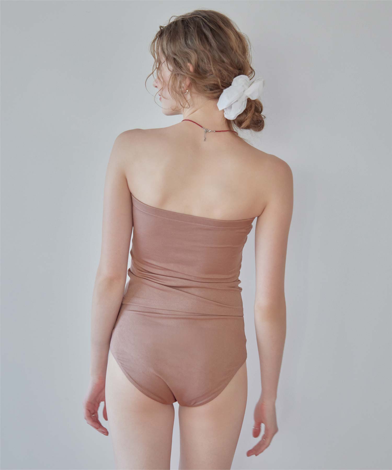 ・インナーはセパレートデザインなのにワンピース見えが叶うマルチway細リブ素材ビキニです。