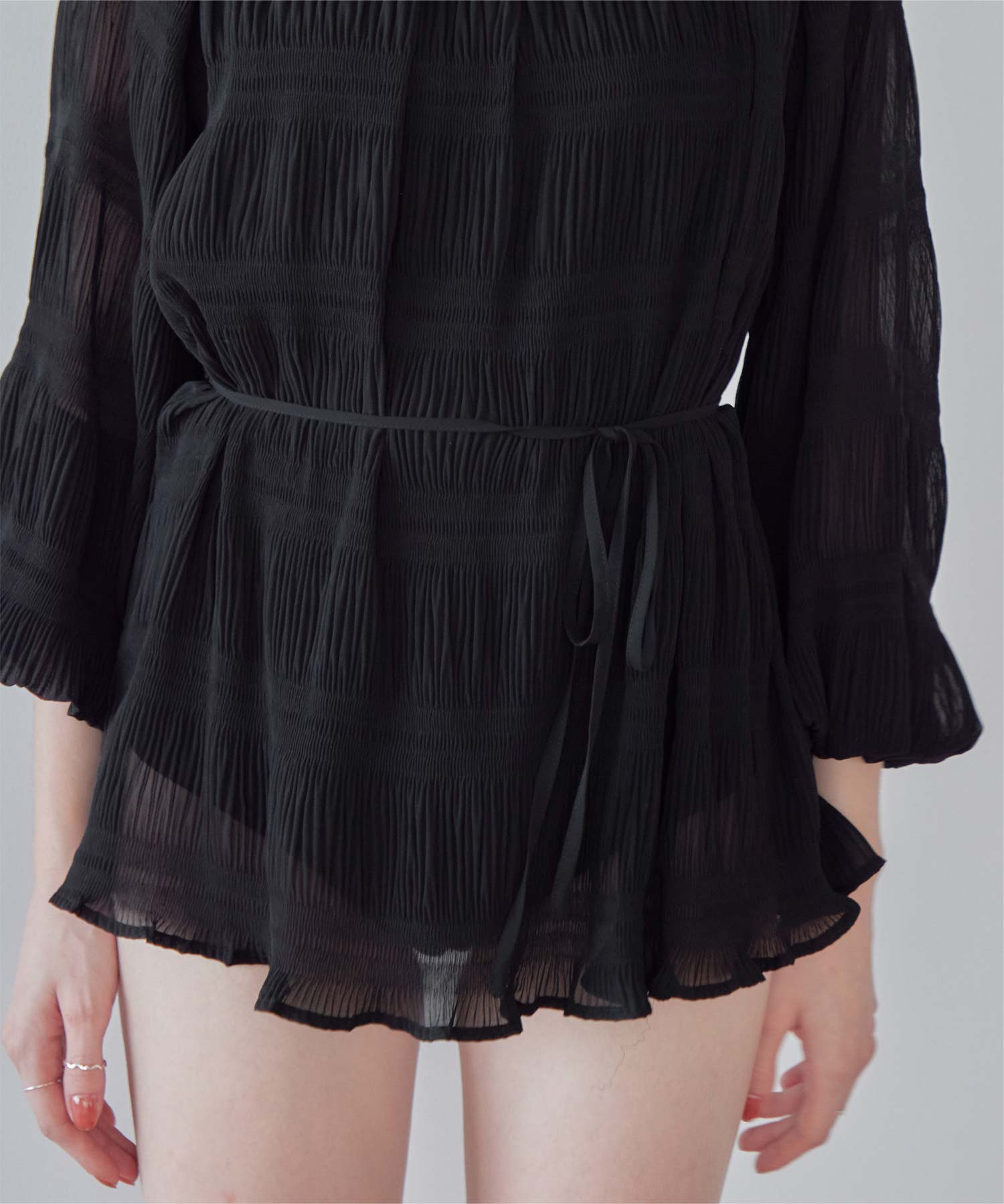 この製品はプリーツ加工を施してあります。この加工は永久的なものではなく、着用やお洗濯の繰返しによって次第にプリーツが消失する可能性があります。保管の際はプリーツを伸ばさないようにご配慮下さい。