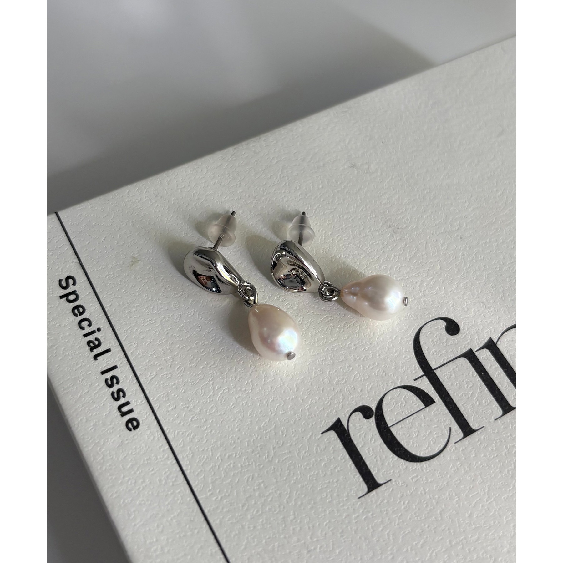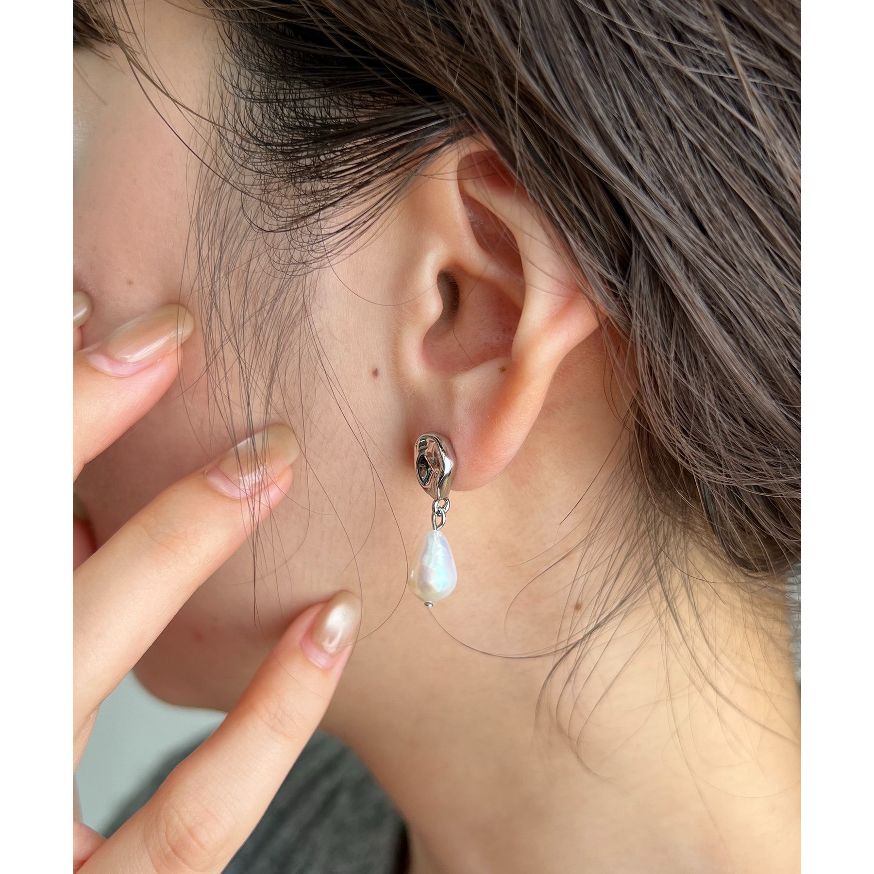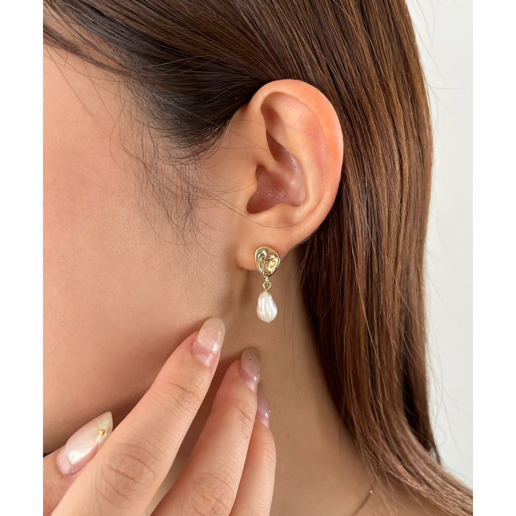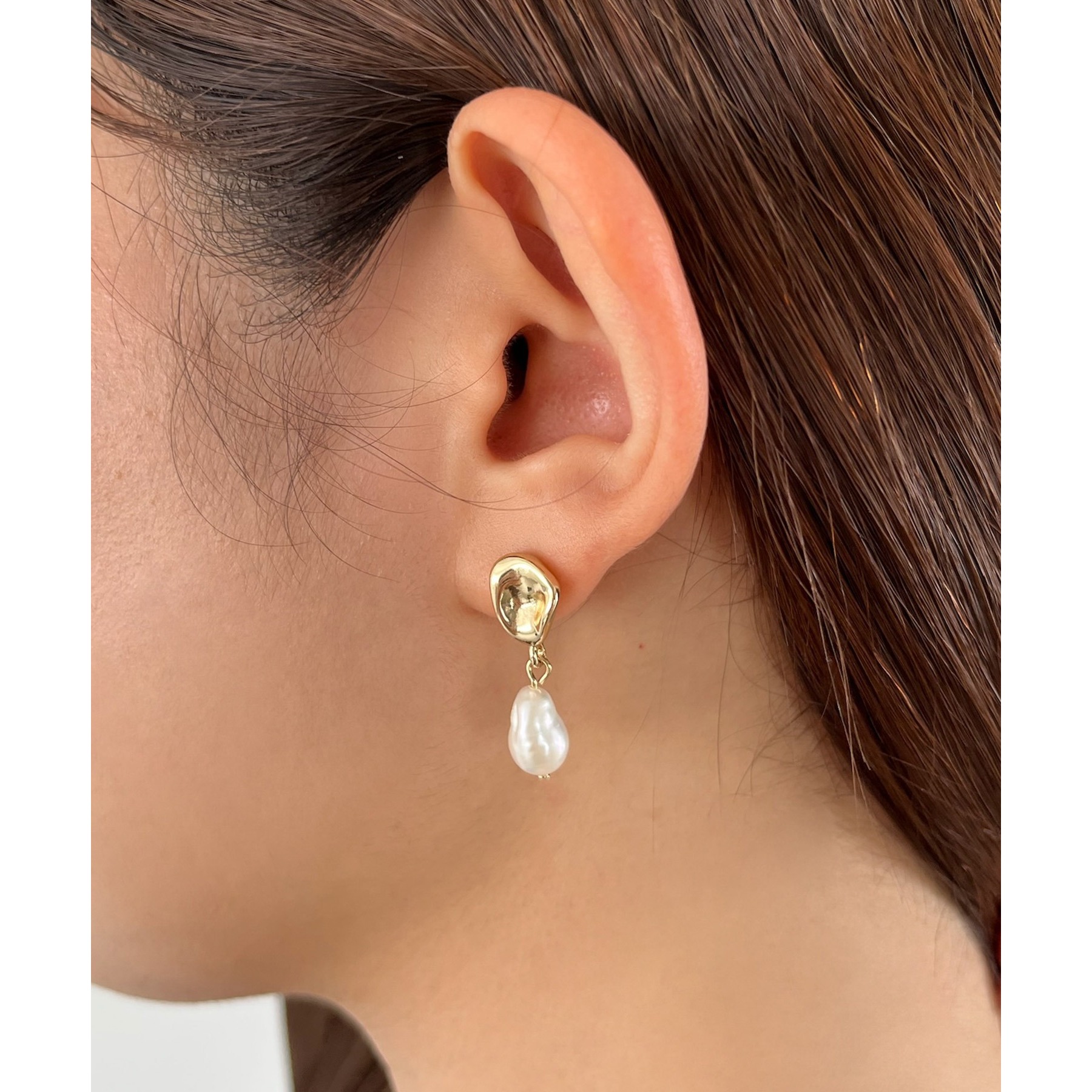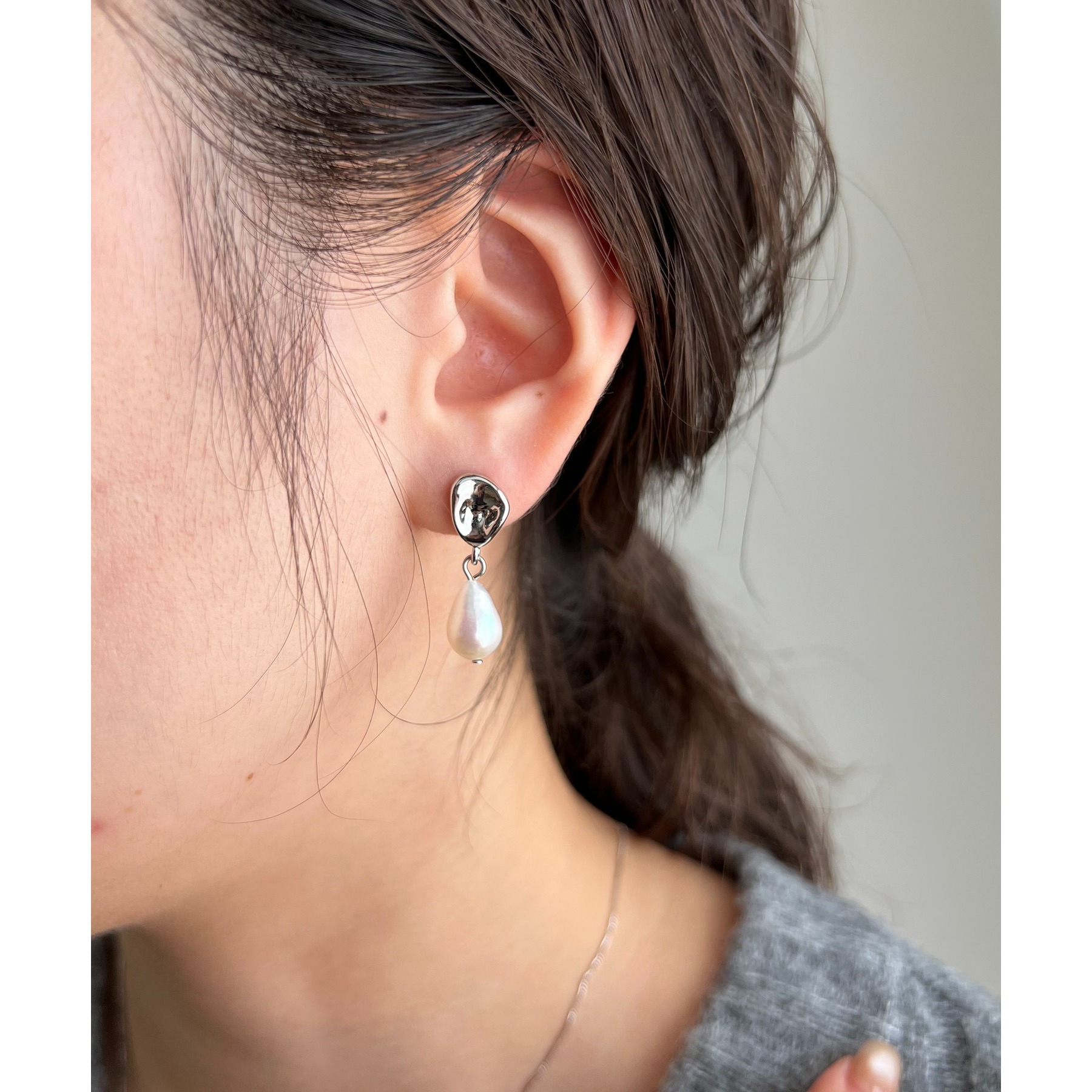 高級感のある淡水パールとドロップモチーフが頬あたりで揺れる上品なデザイン。