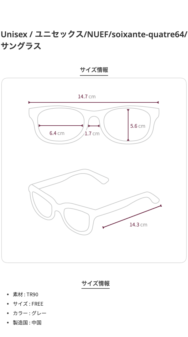 ◾️SIZE GUIDEフレーム正面147mmレンズ幅64mmレンズ高さ56mmブリッジ17mmテンプル長さ143mm重量30g、