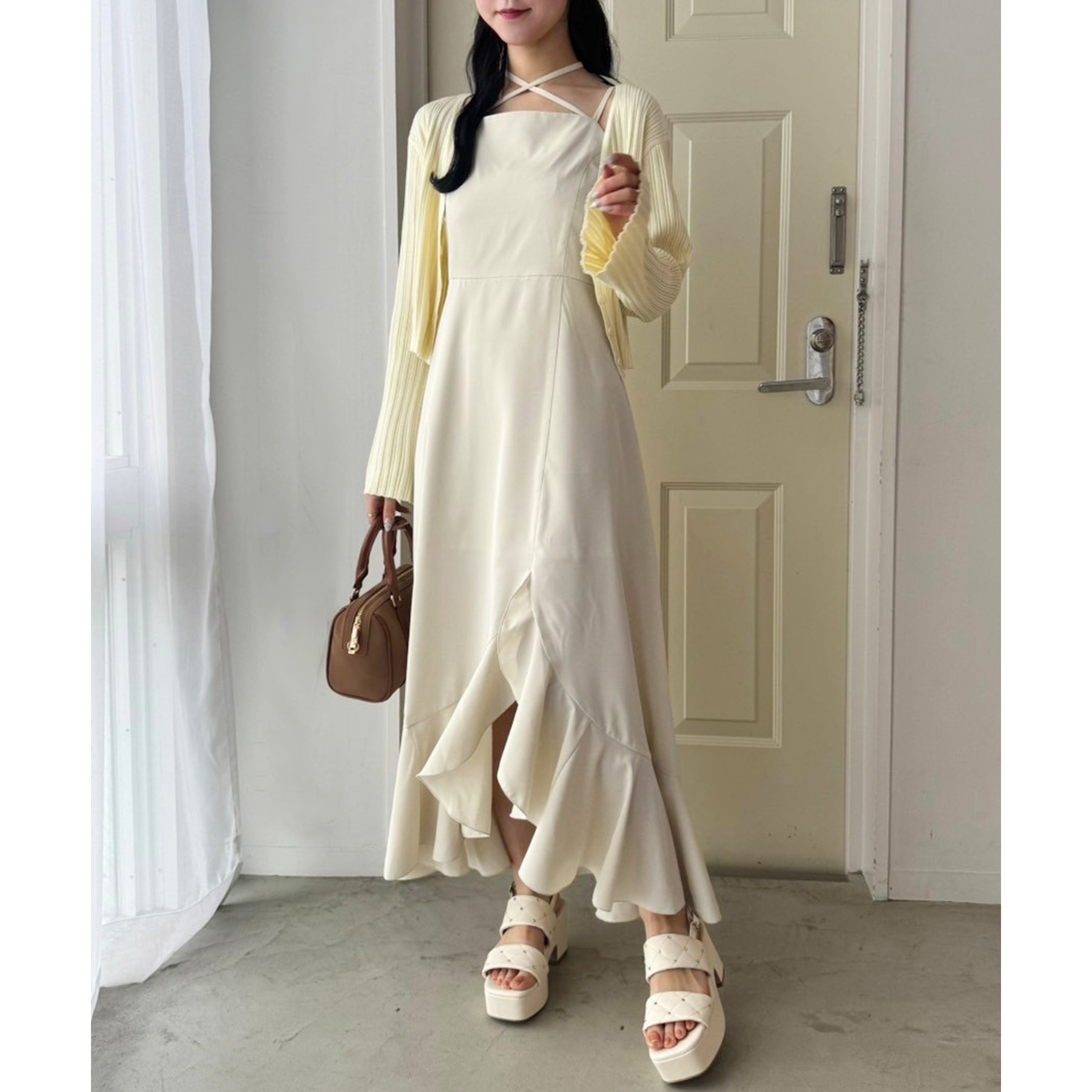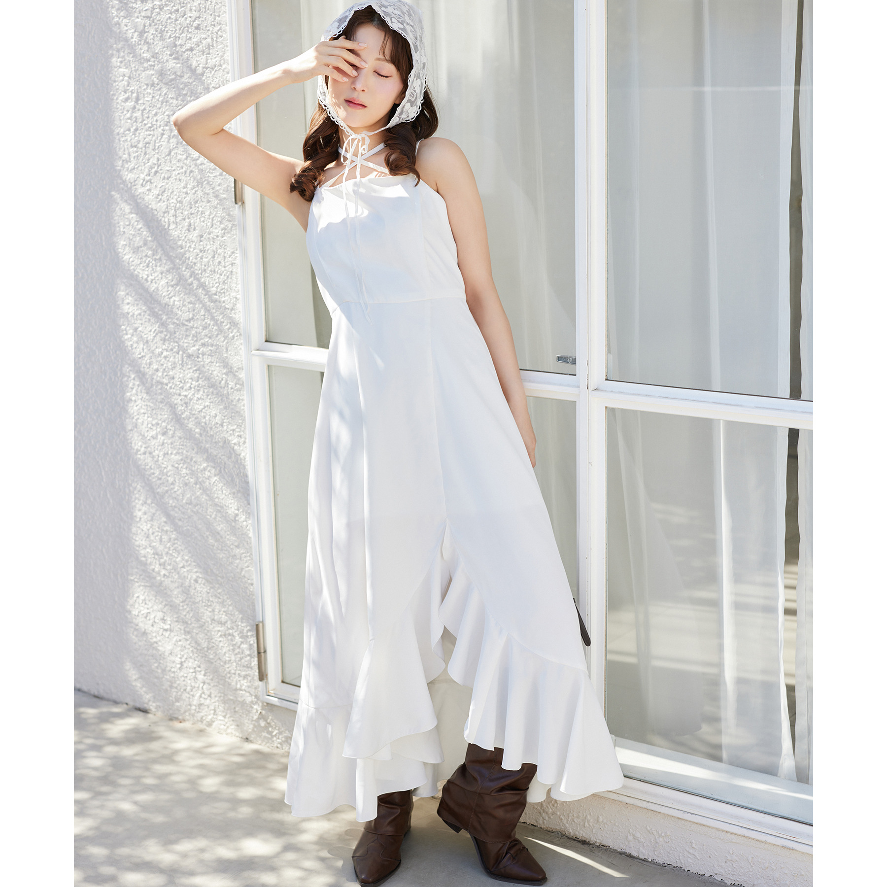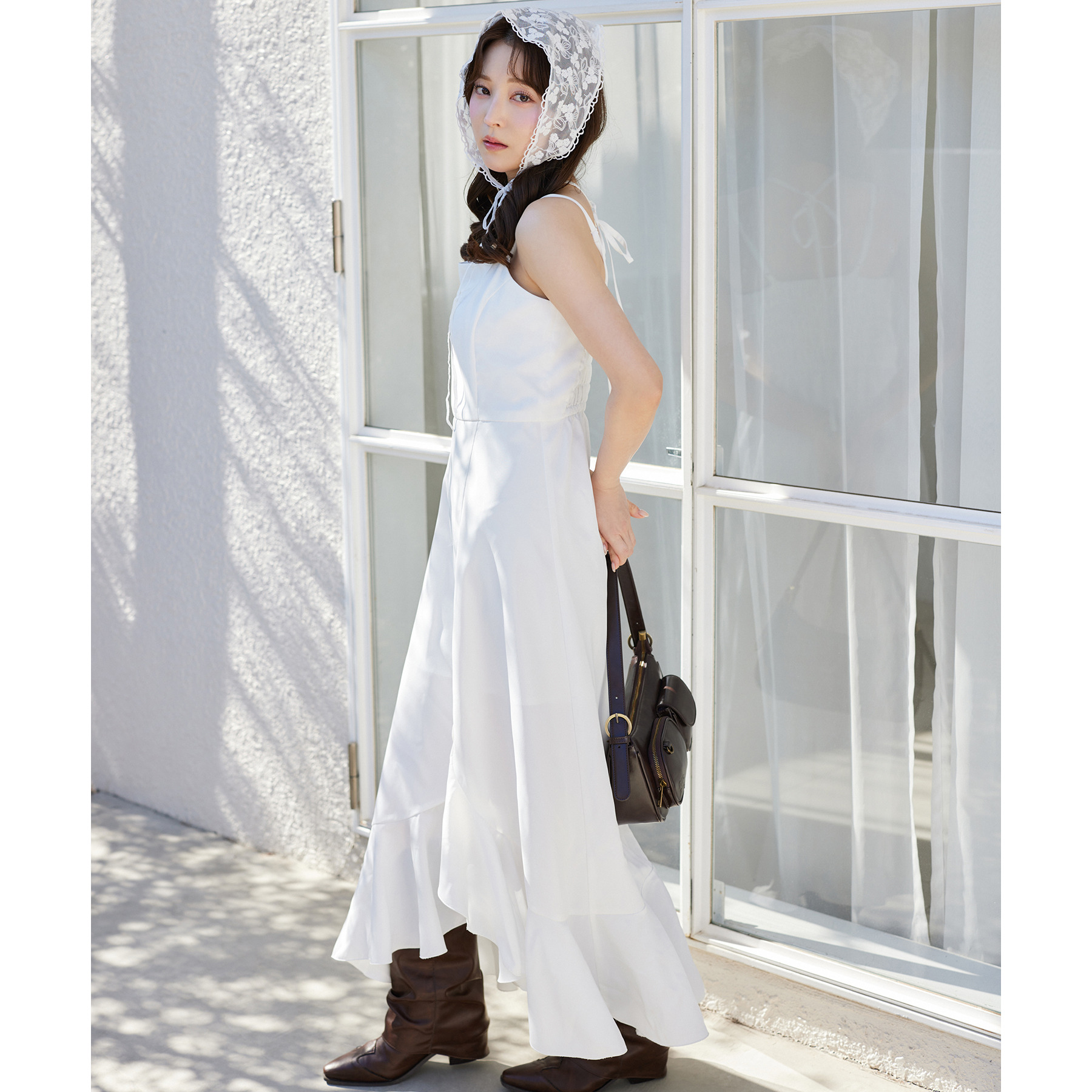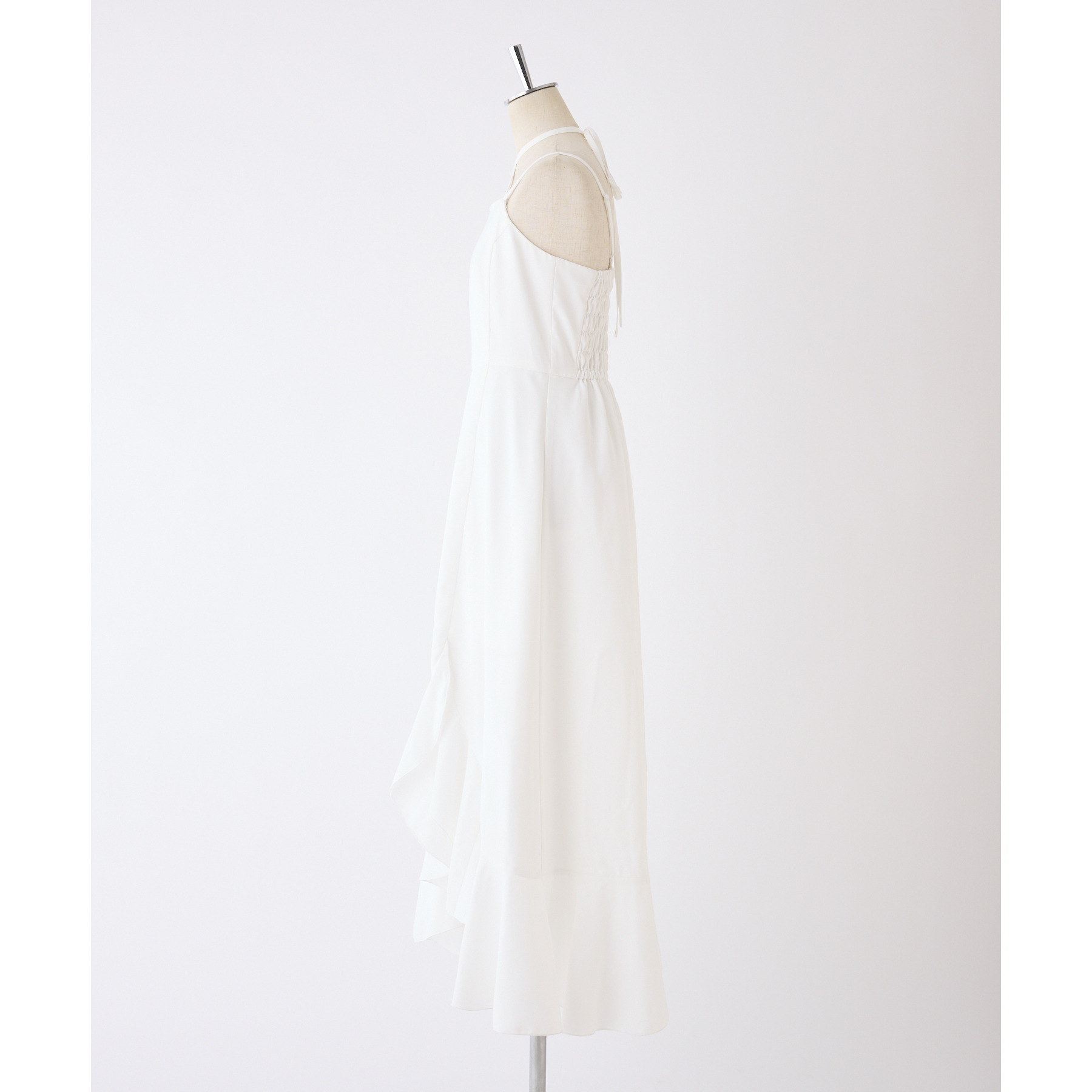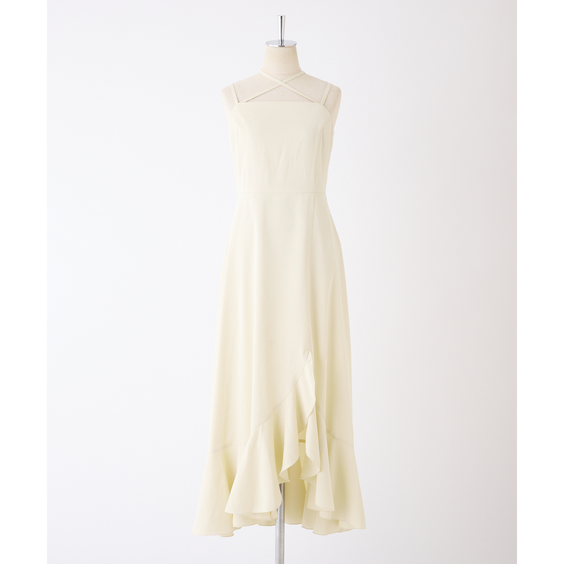 裾に変化をつけたイレギュラーヘムデザインが特徴のロングワンピース。