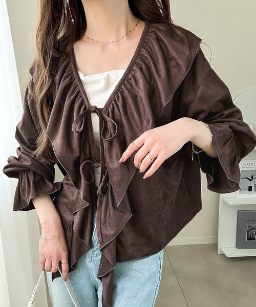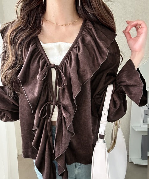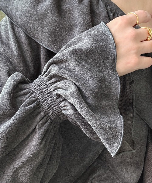 ラッフルデザインの華やかさと、フェイクスエードの高級感で