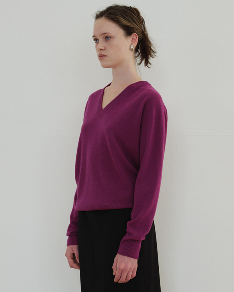 WOOL 100% の糸で仕立てた Vネックニットです。季節の変わり目に 気負いのない厚みと標準的なゲージで編み立てられており、透け感を気にせず安定感よく着用できます。