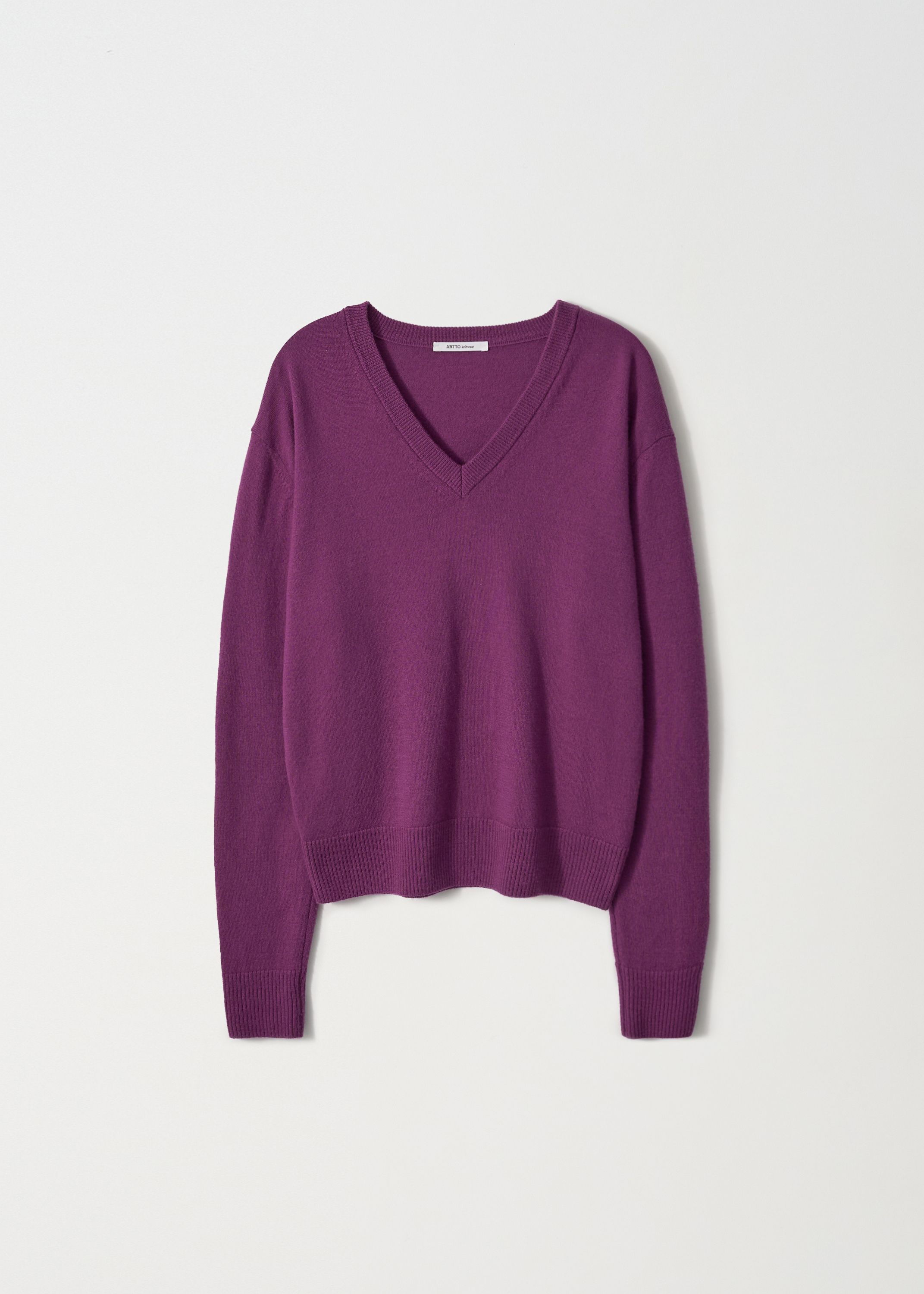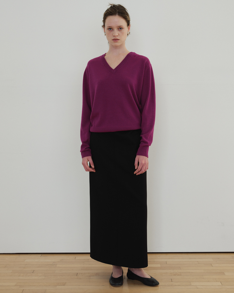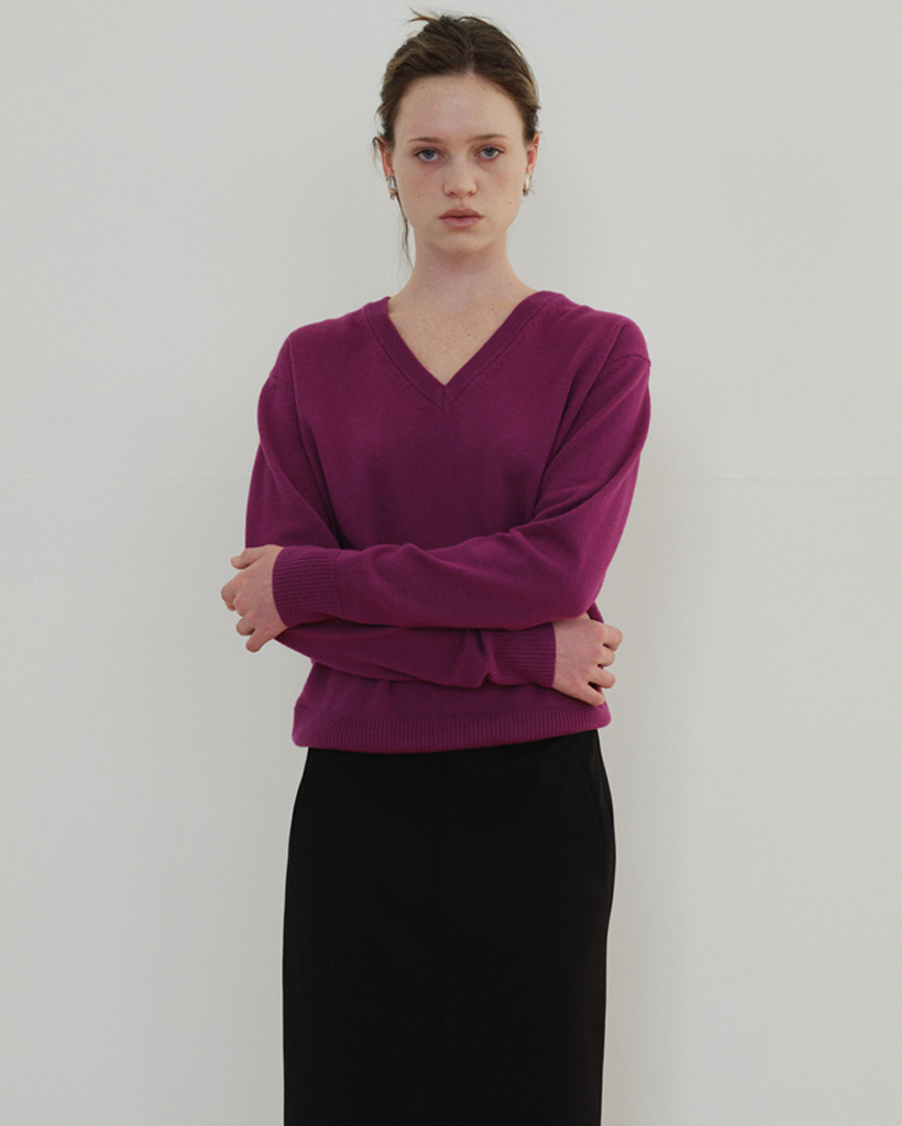 セミオーバーフィットのシルエットにドロップショルダーラインを加え、自然なゆとりが感じられる一着です。丈感はヒップ上で収まり、すっきりとしたバランスに整えます。Vネックの深さは標準的で、一枚での着用はもちろん、インナーとのレイヤード時にも大げさになりすぎません。