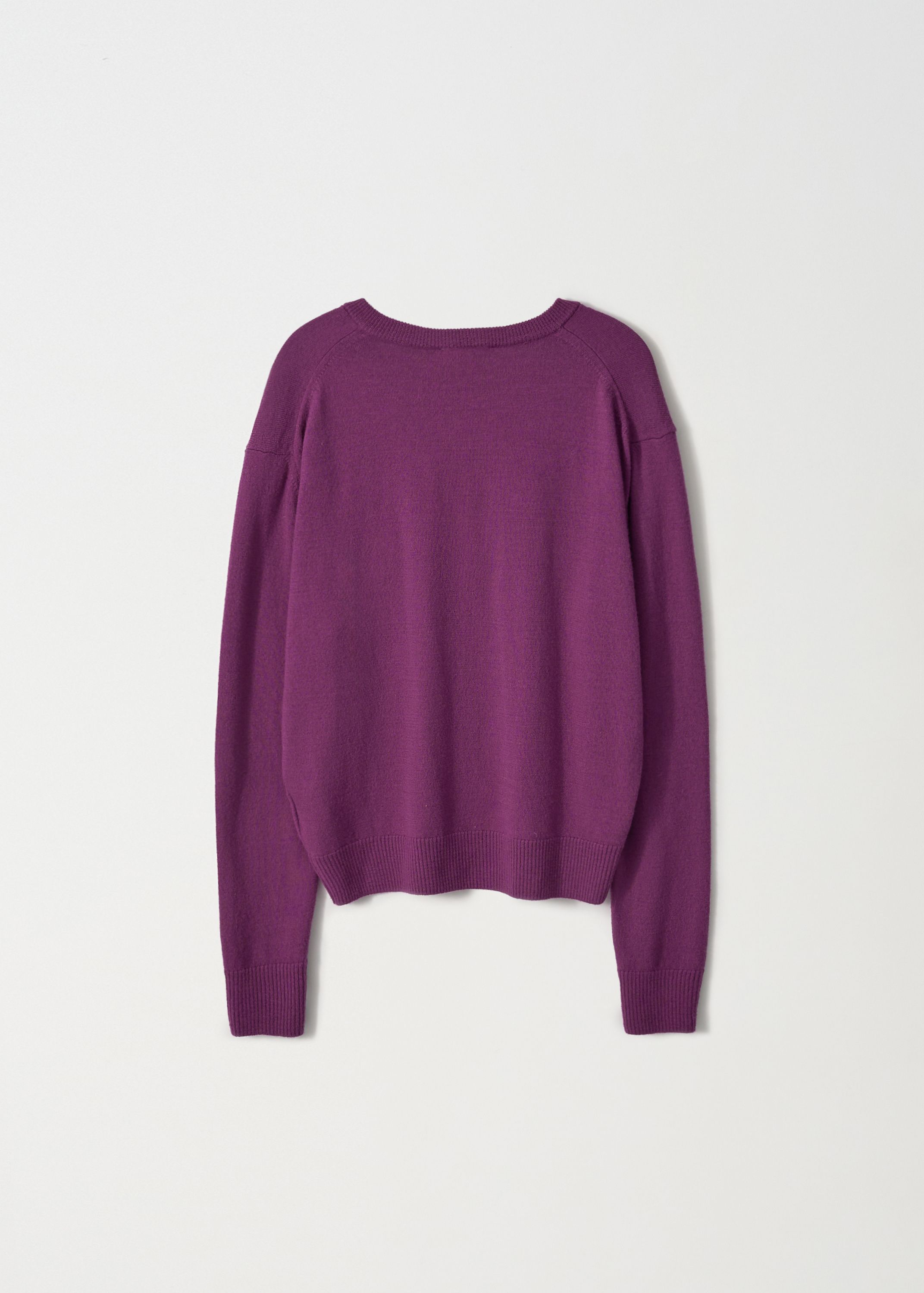 ネック・袖・裾は厚みのあるリブ組織で仕上げて形を安定的に整え、リブのテンションで快適な着用感を保ちます。Silver Gray・Powder Sky・Purple・Red の4色構成で、デニムからスラックス、スカートまで幅広く合わせられ、季節の変わり目に活躍するベーシックニットとしてご提案します。