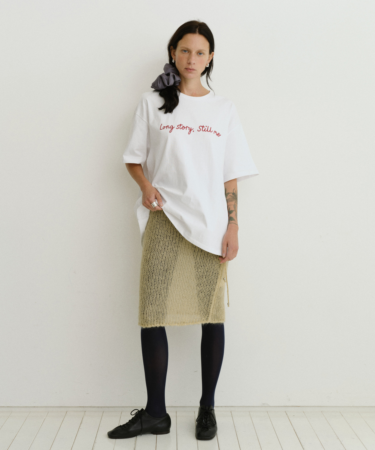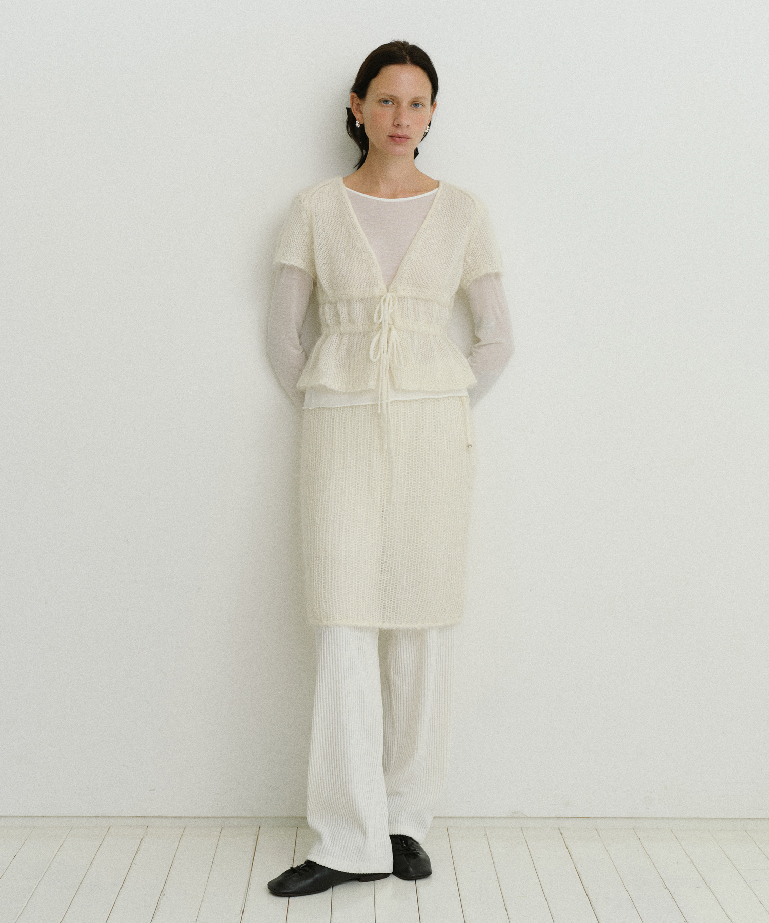 -ゆるく編まれた編地は自然な雰囲気と軽やかな着心地を提供し、ウエスト部分にはスリットが入っており、体型を問わず快適に着用できます。