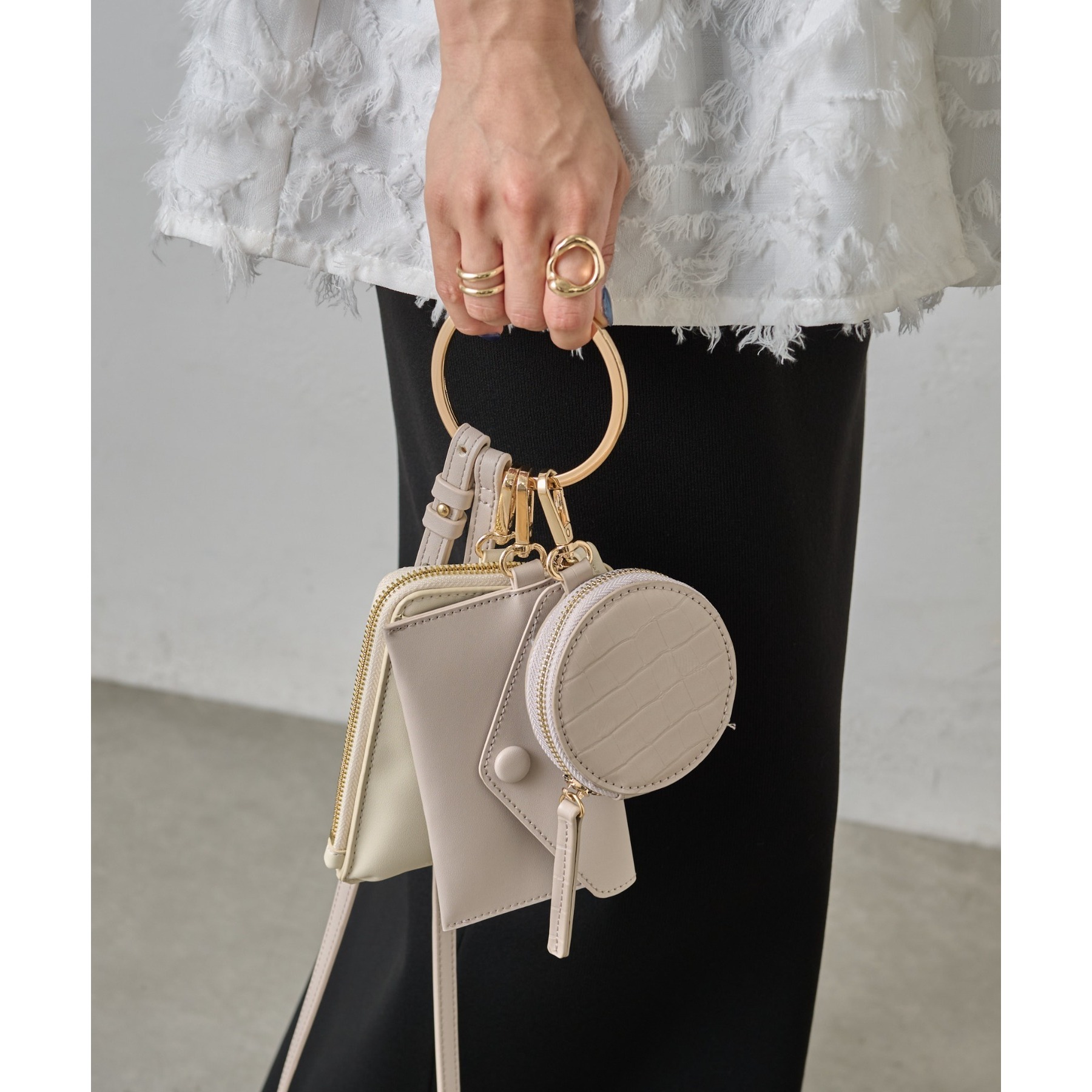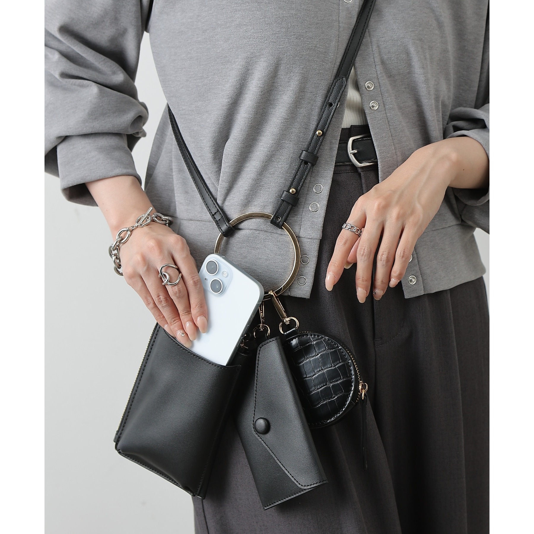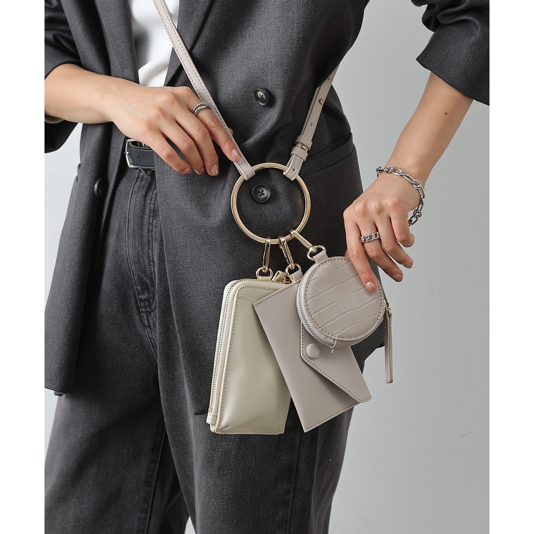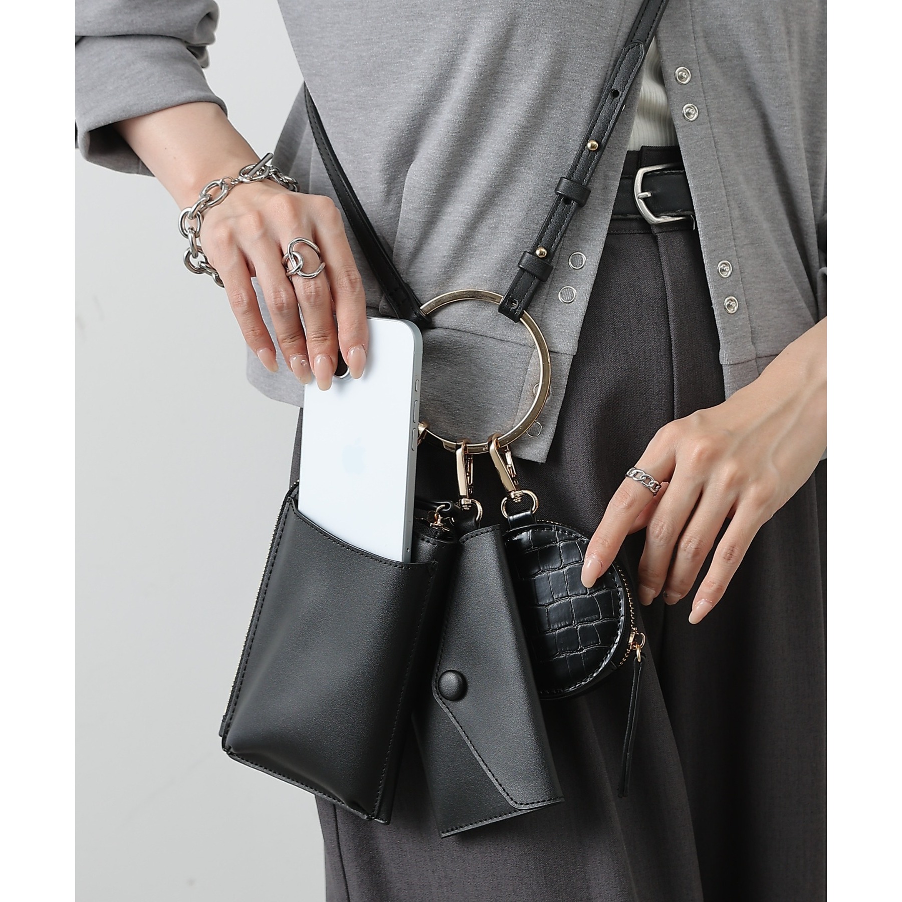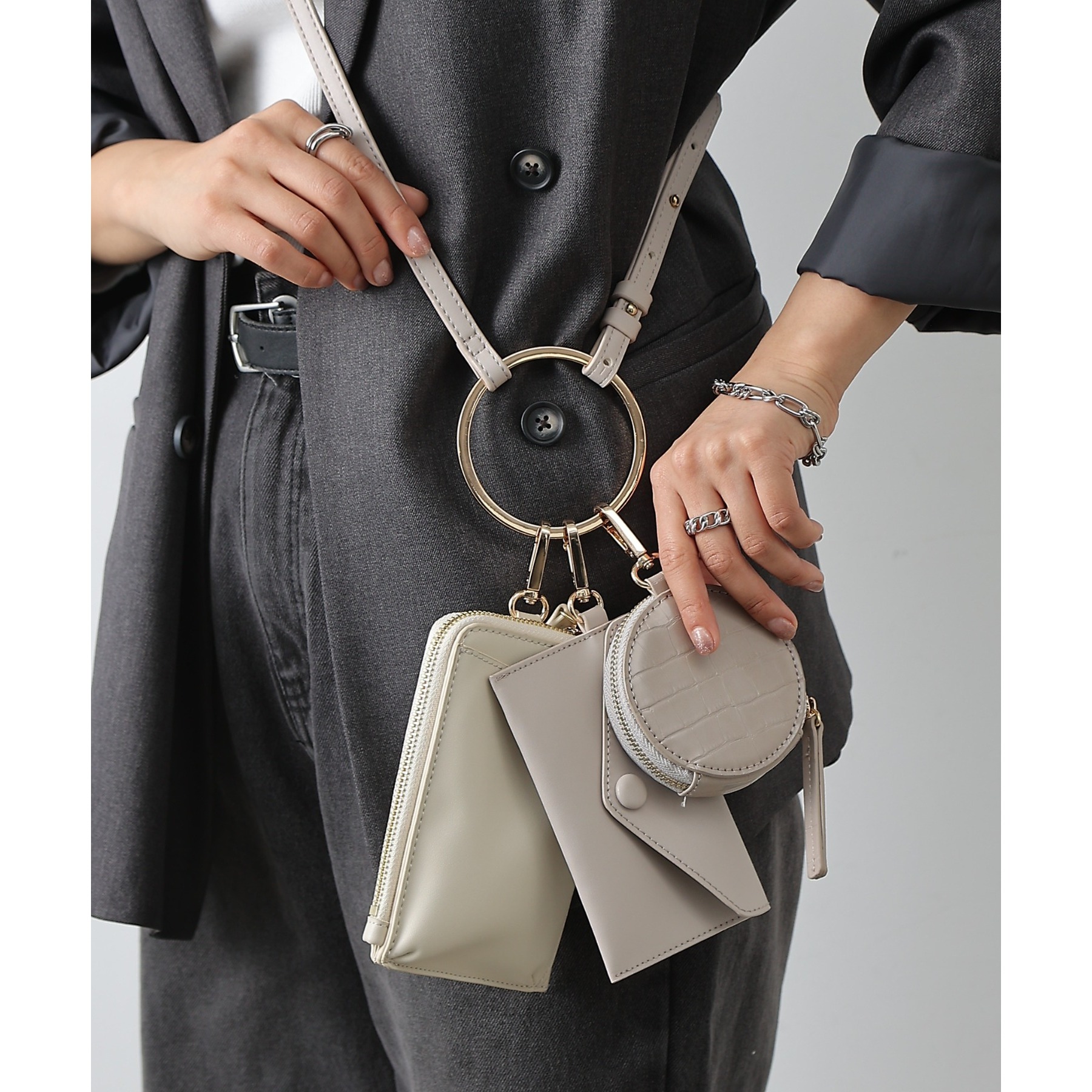 スマホカードケース、レター型ポーチ、丸型ミニポーチがリングに装着でき、ショルダーバッグとして使える3連バッグ。