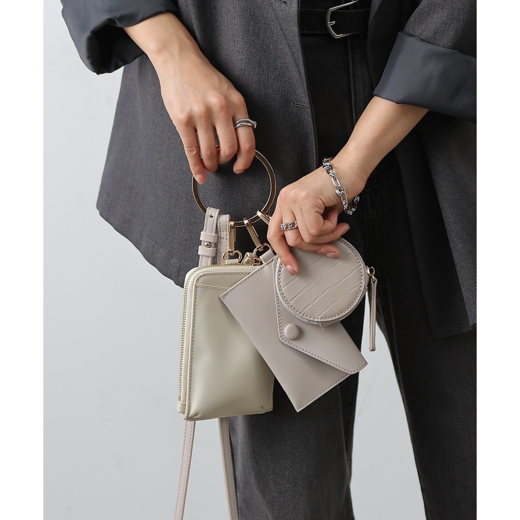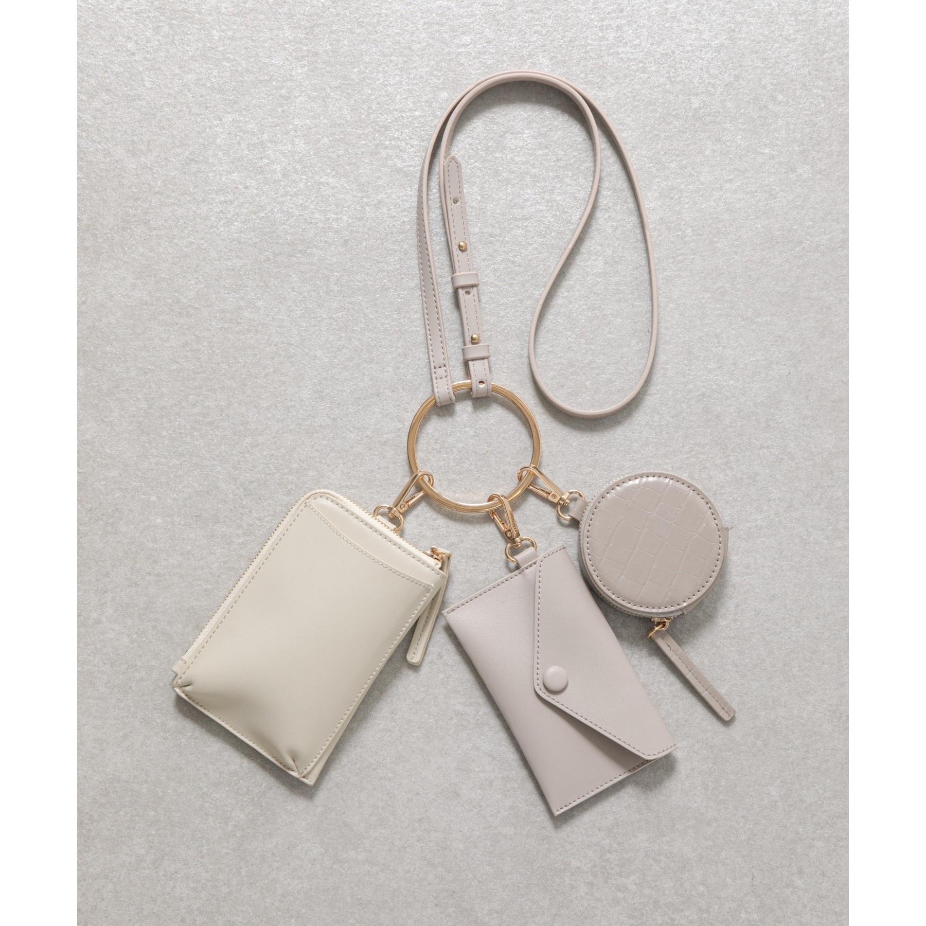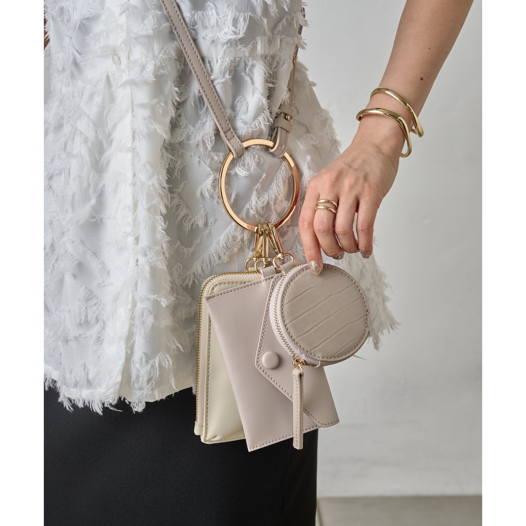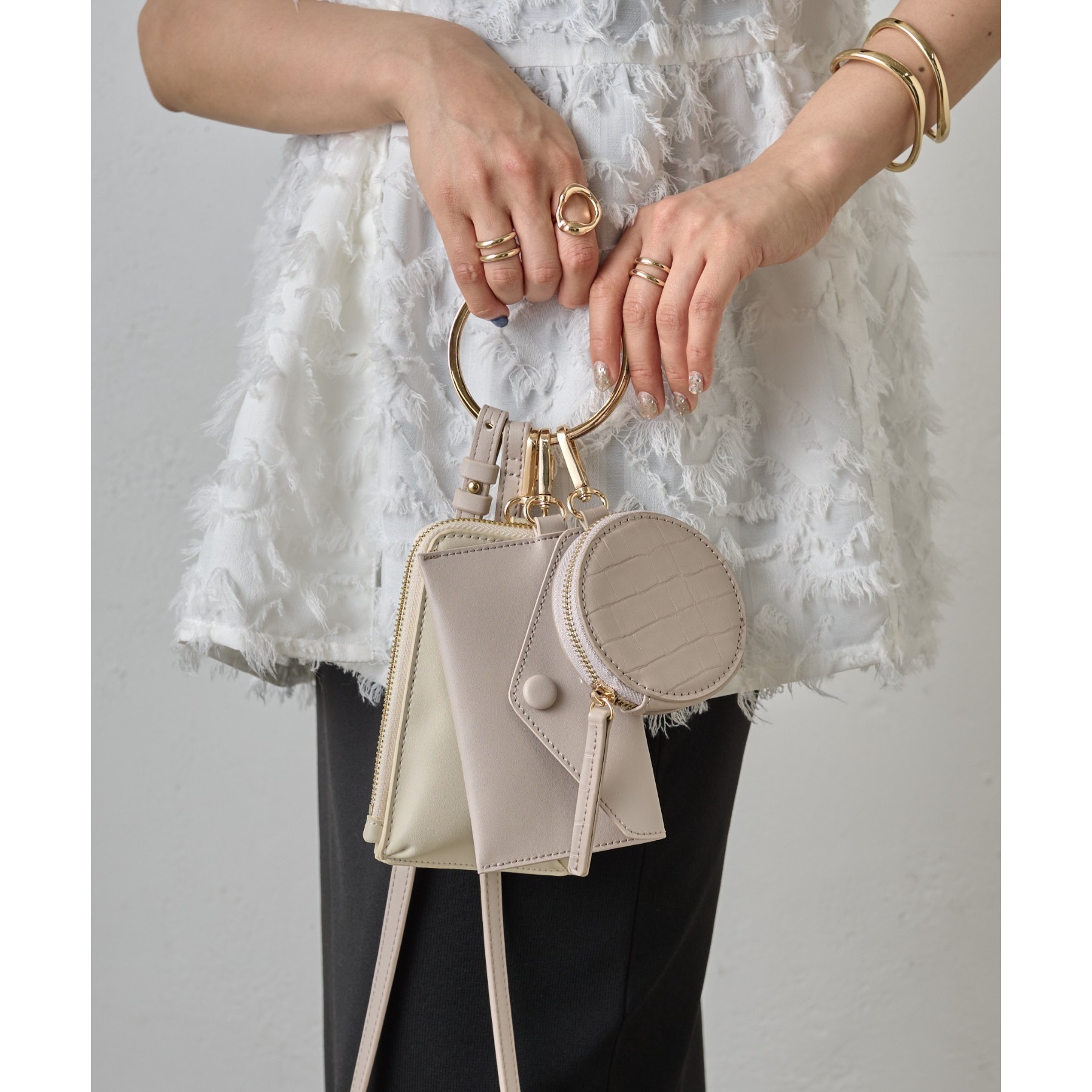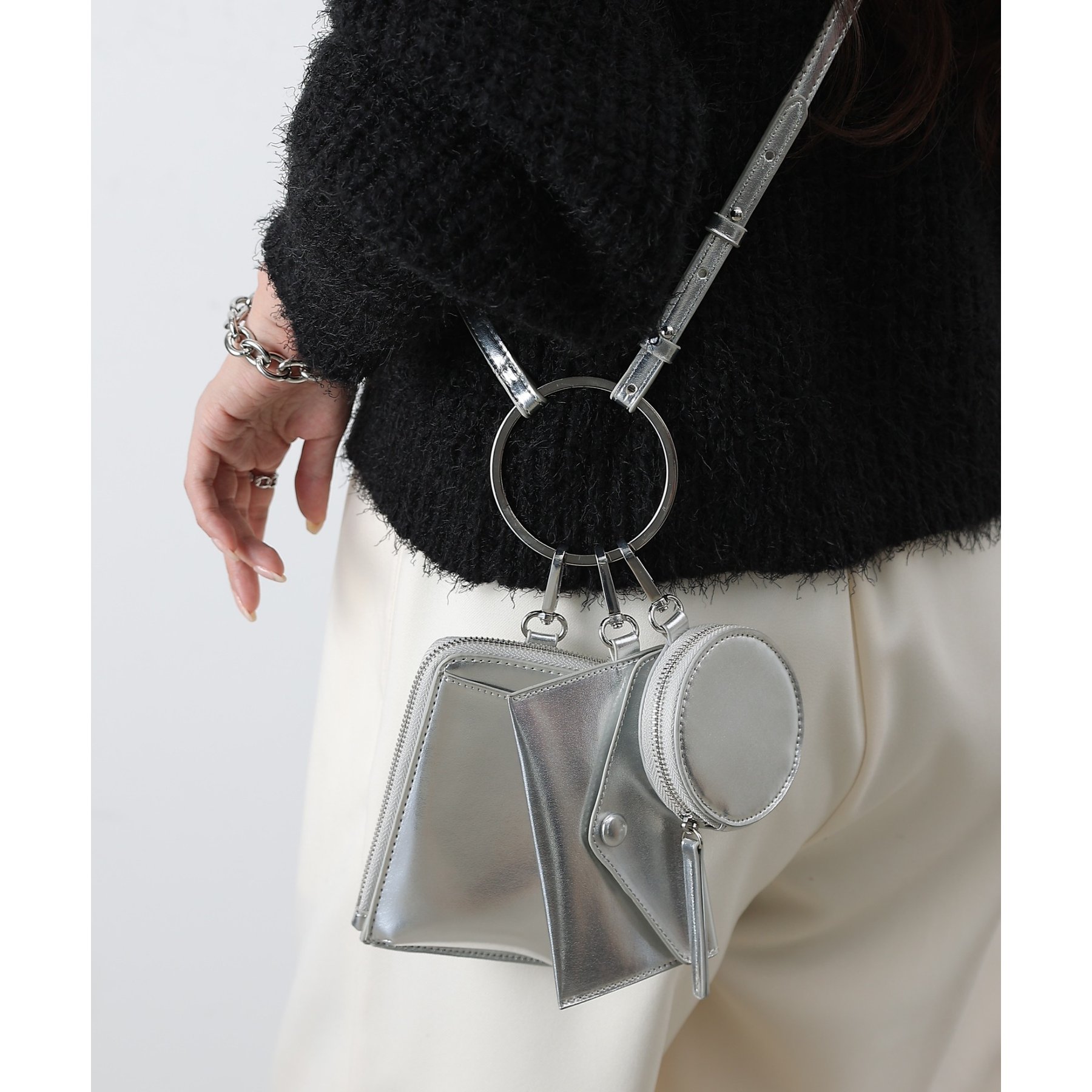 スマホカードケース、レター型ポーチ、丸型ミニポーチがリングに装着でき、ショルダーバッグとして使える3連バッグ。