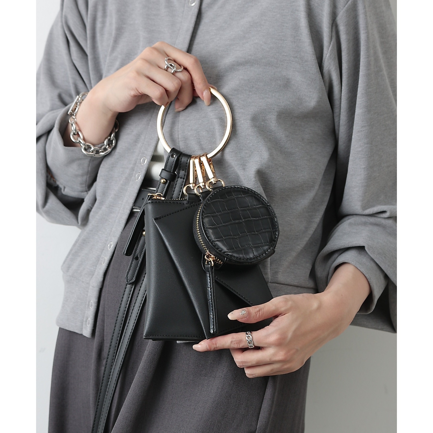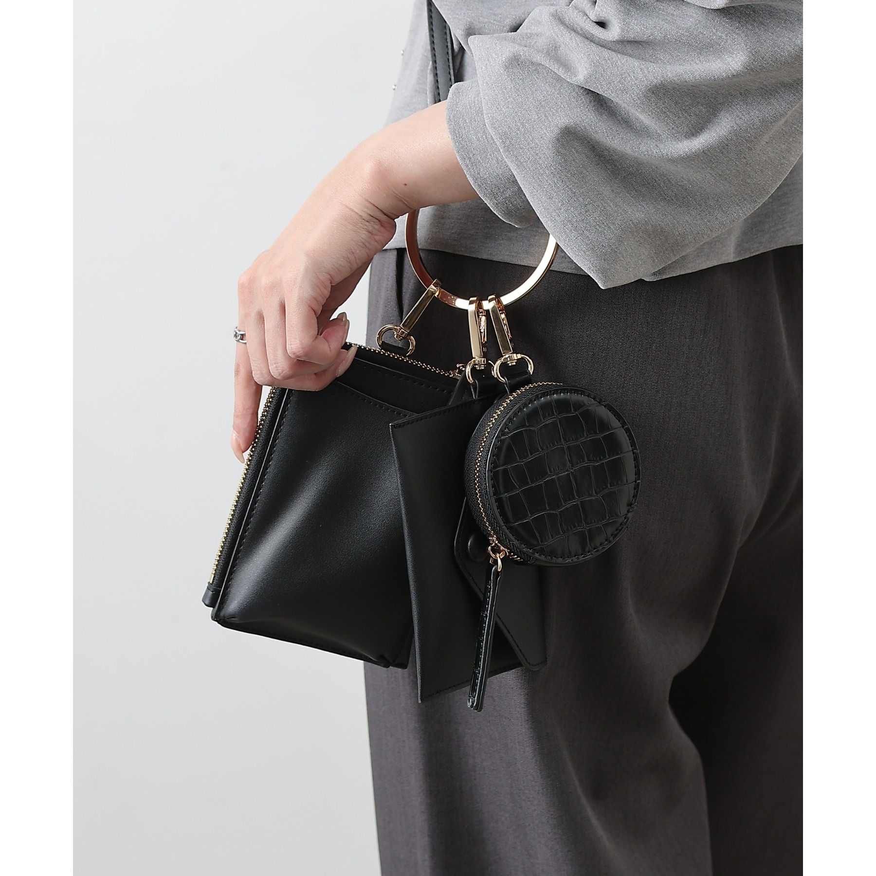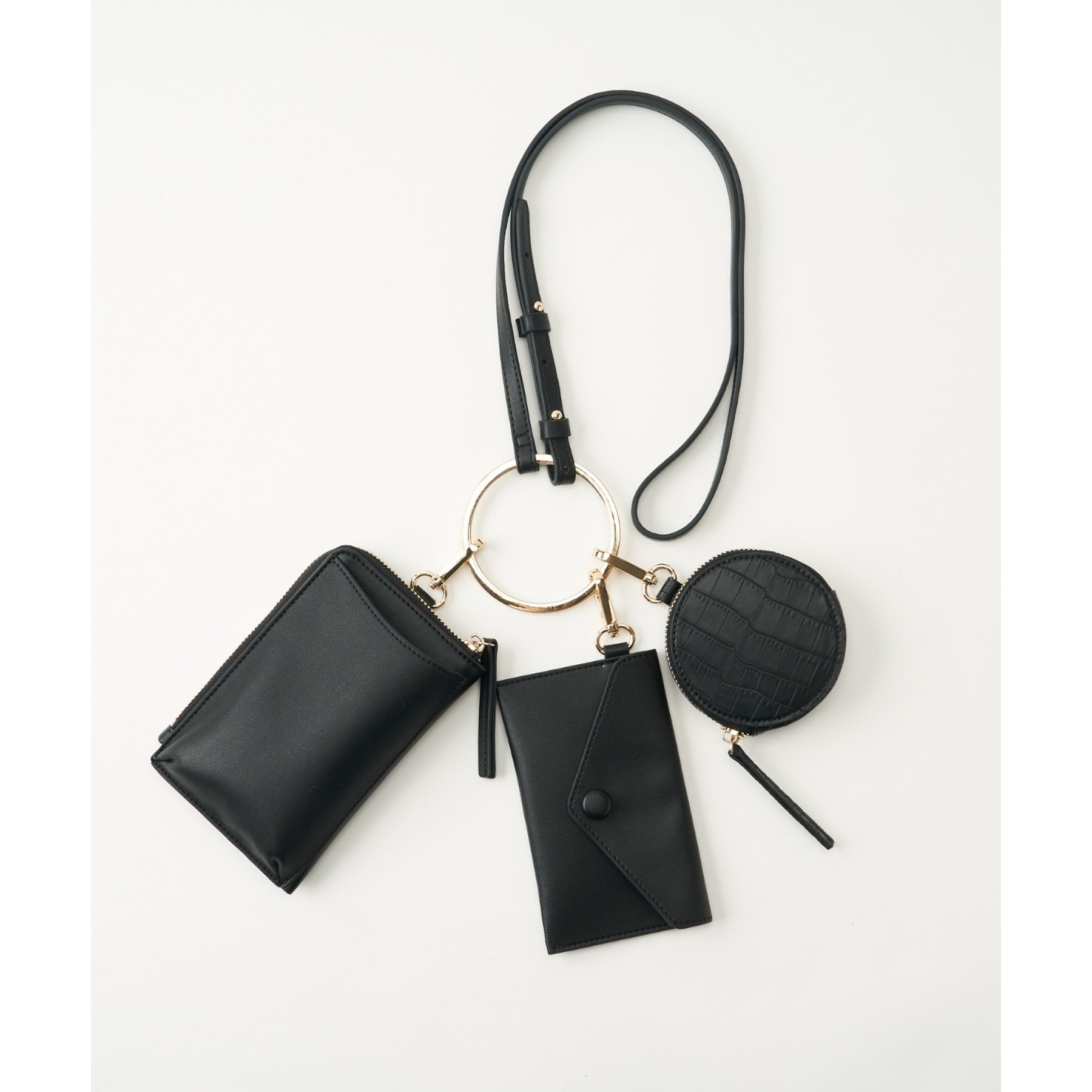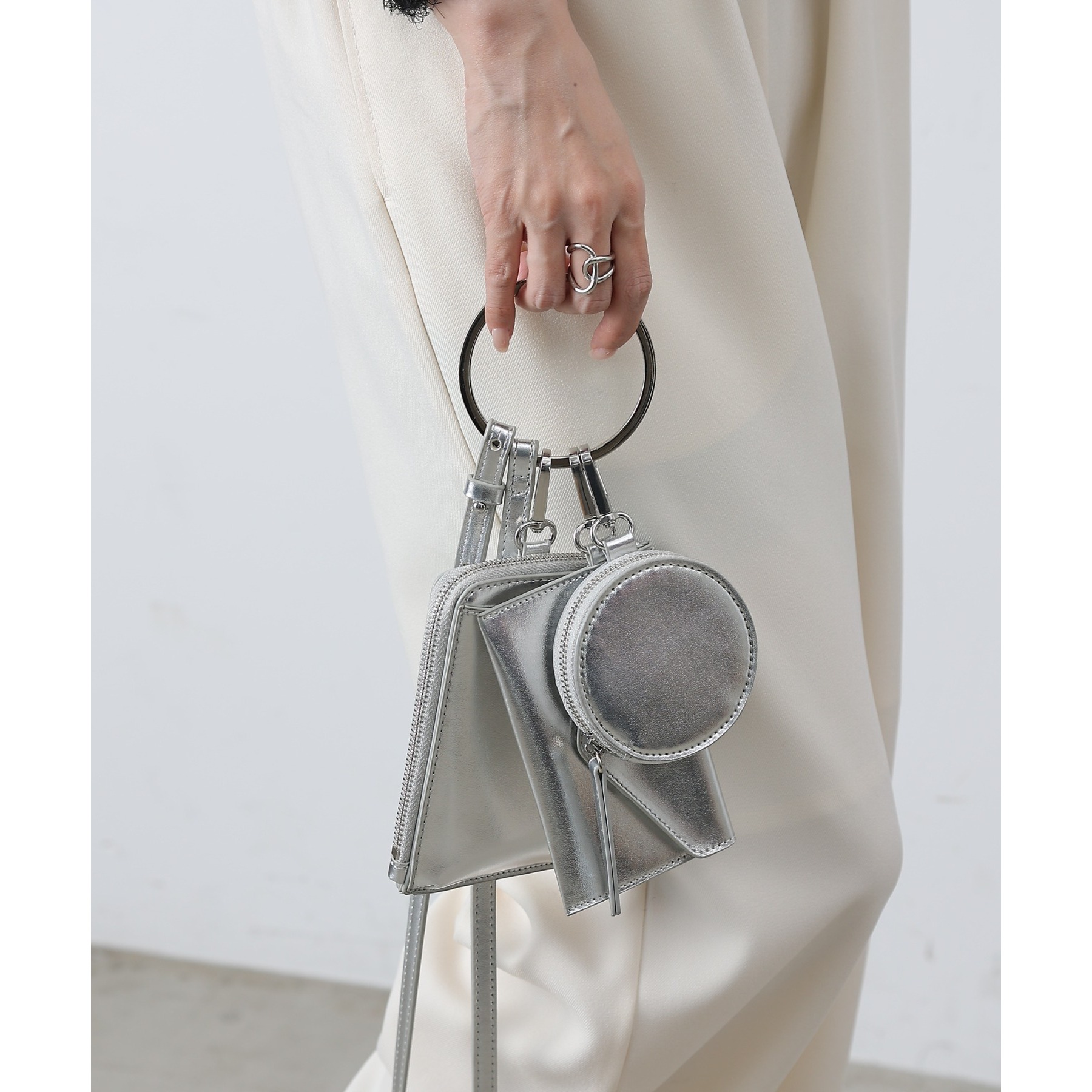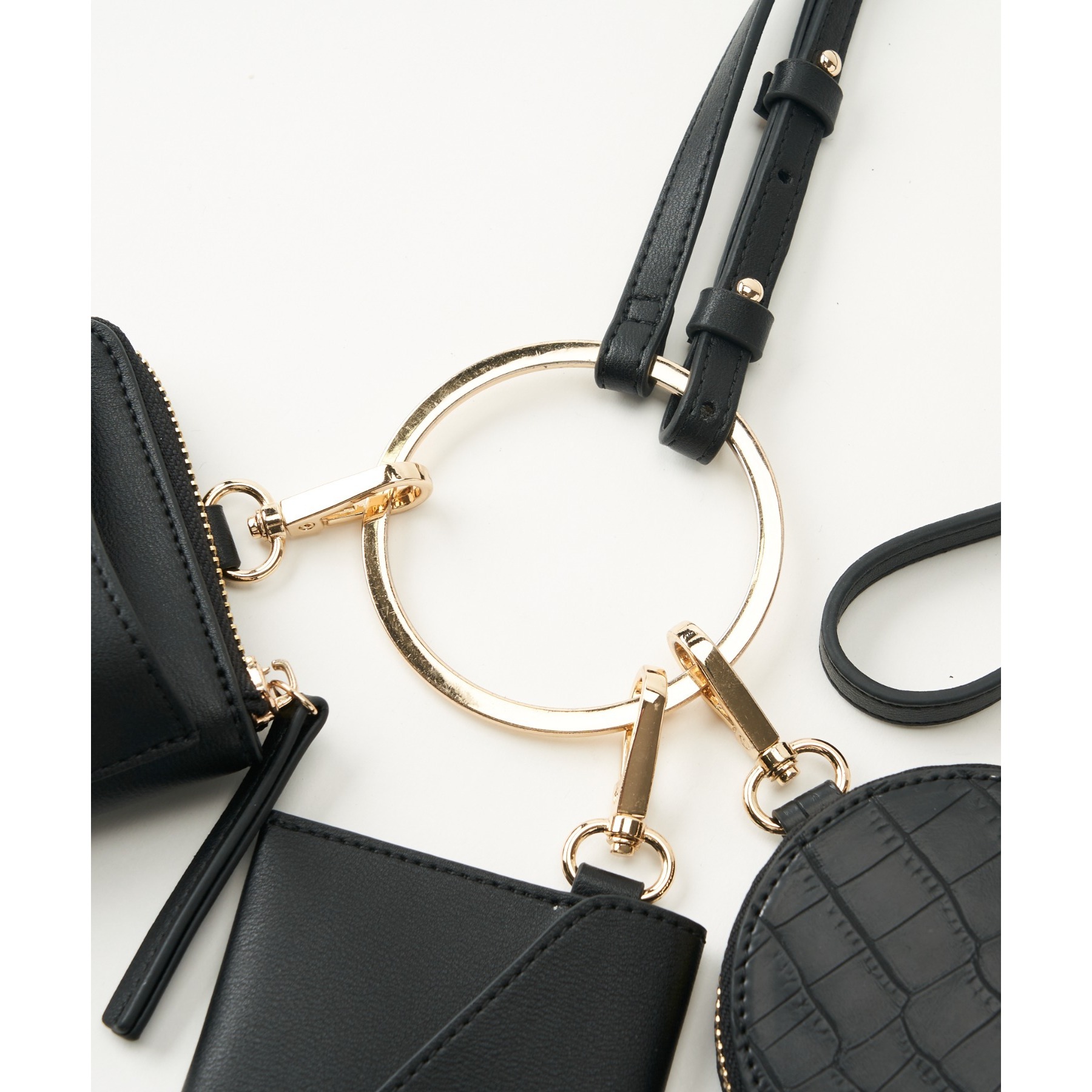 スマホカードケース、レター型ポーチ、丸型ミニポーチがリングに装着でき、ショルダーバッグとして使える3連バッグ。