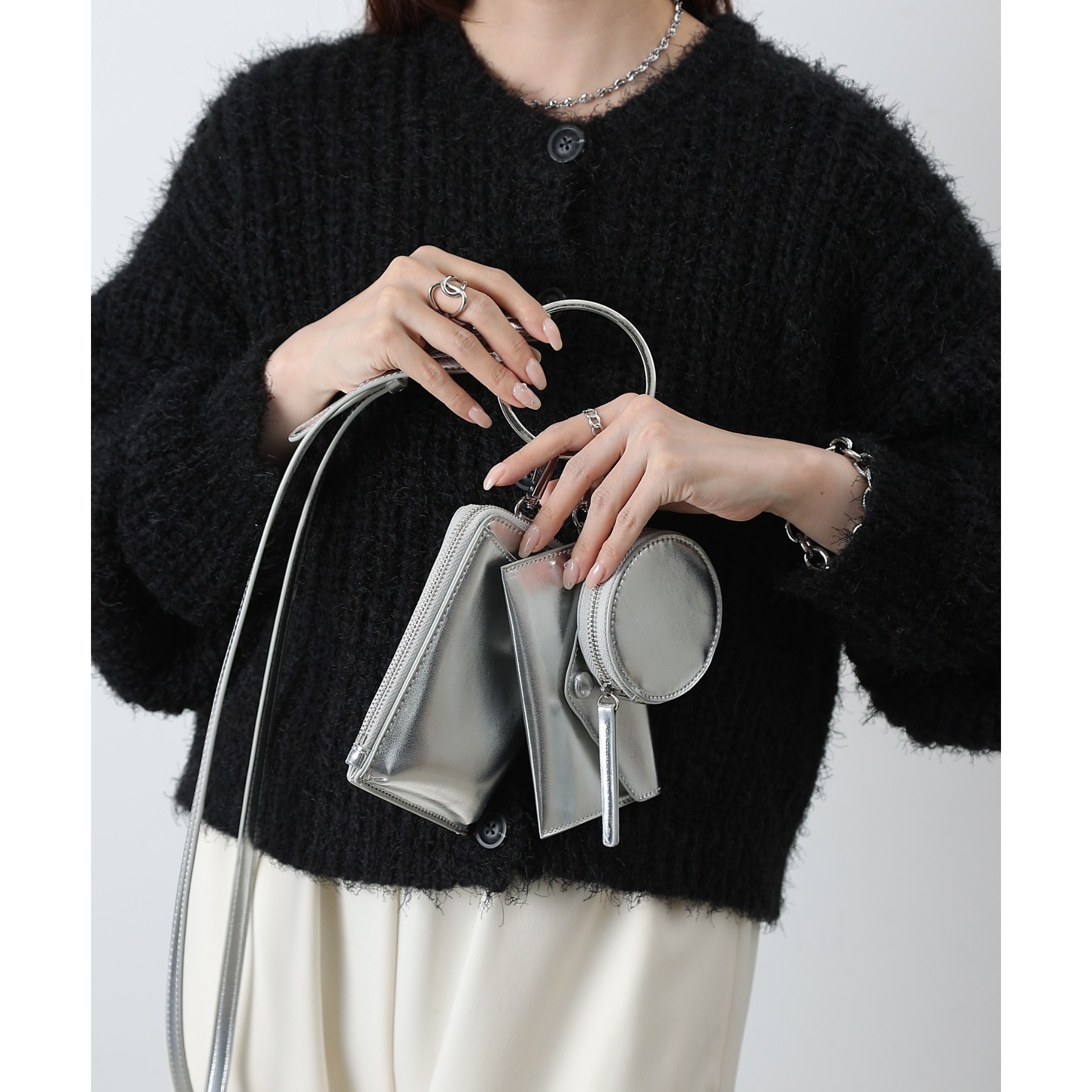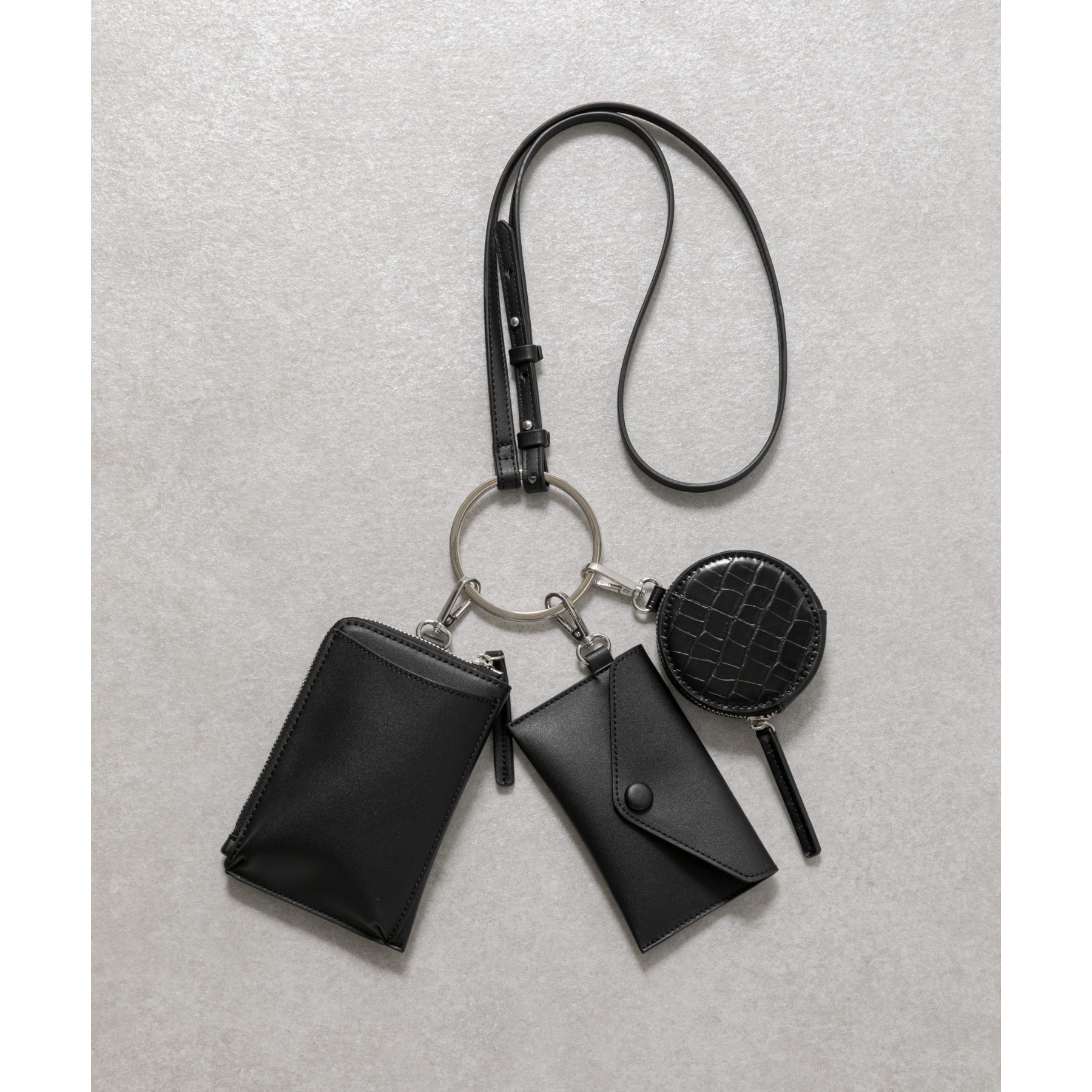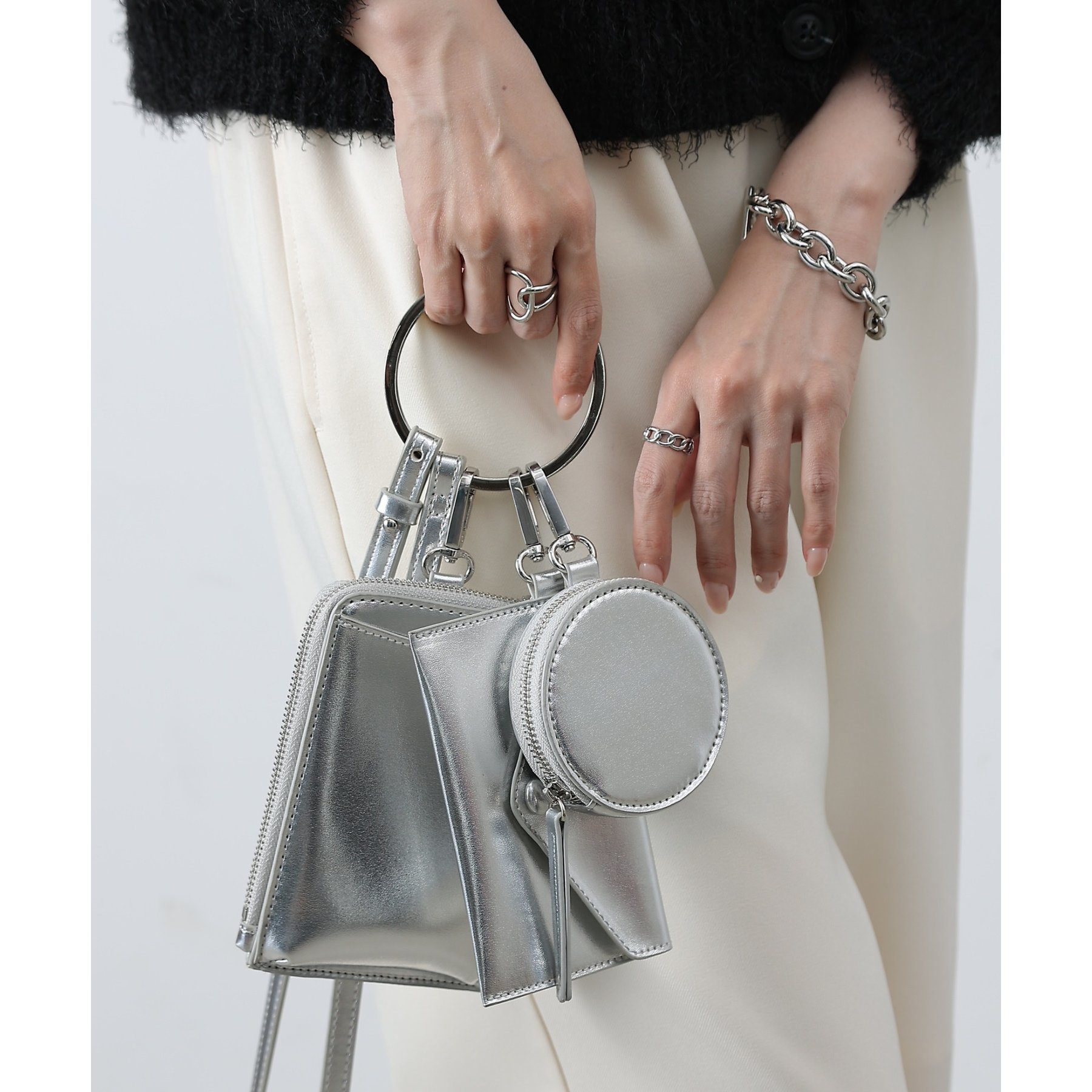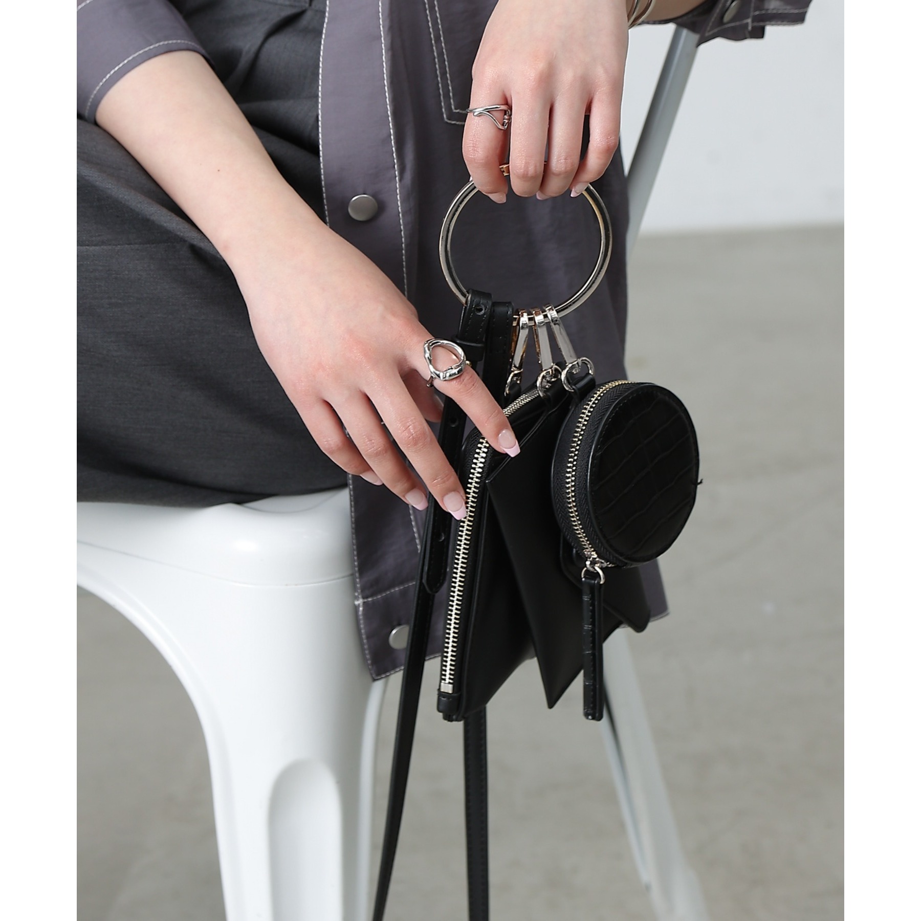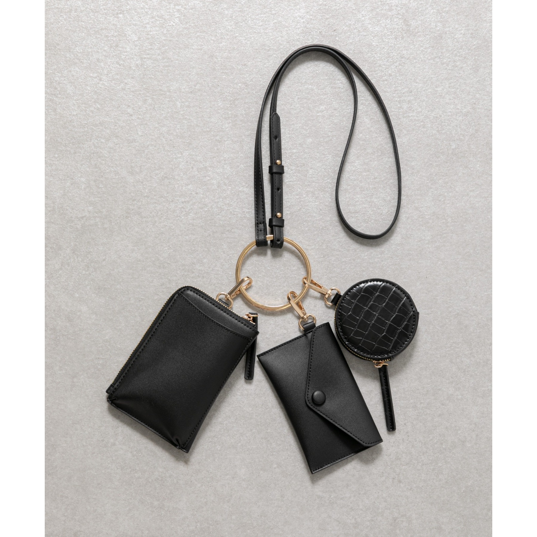 スマホカードケース、レター型ポーチ、丸型ミニポーチがリングに装着でき、ショルダーバッグとして使える3連バッグ。