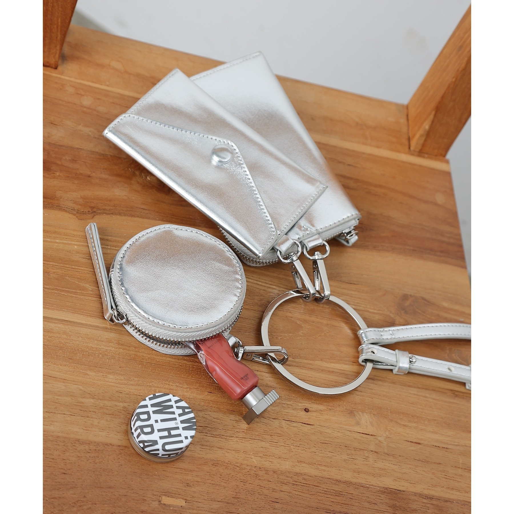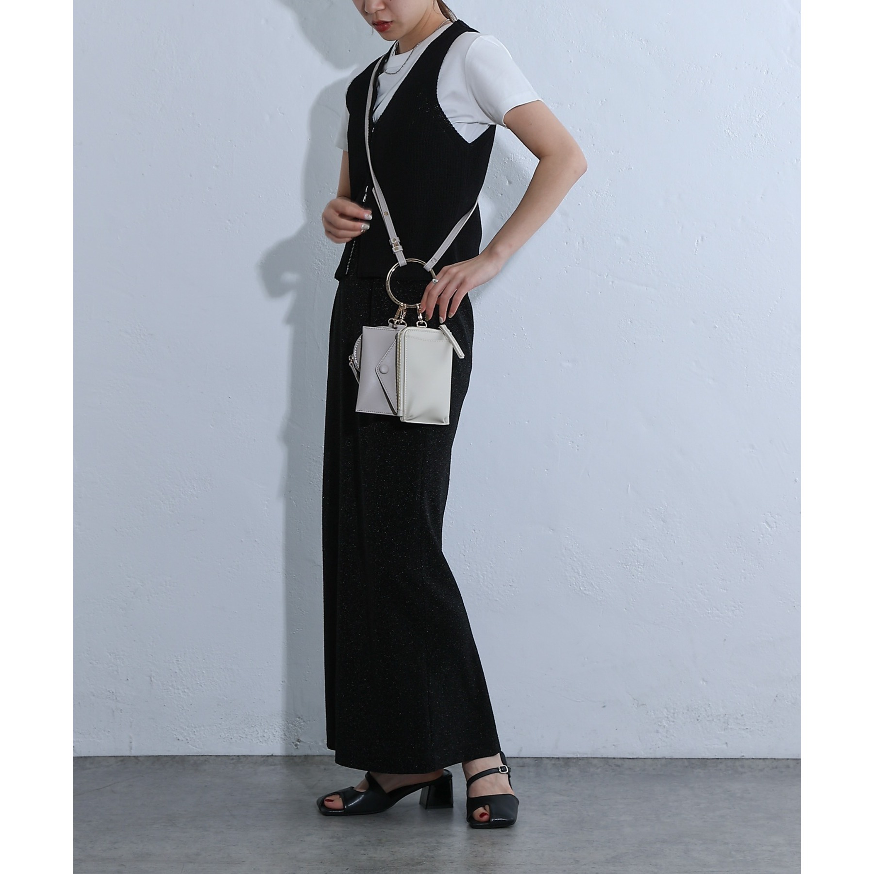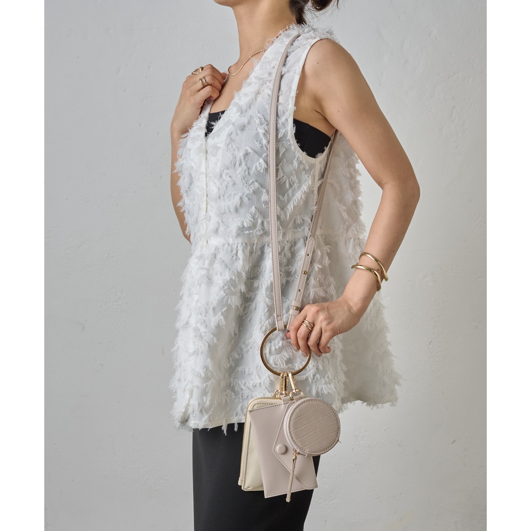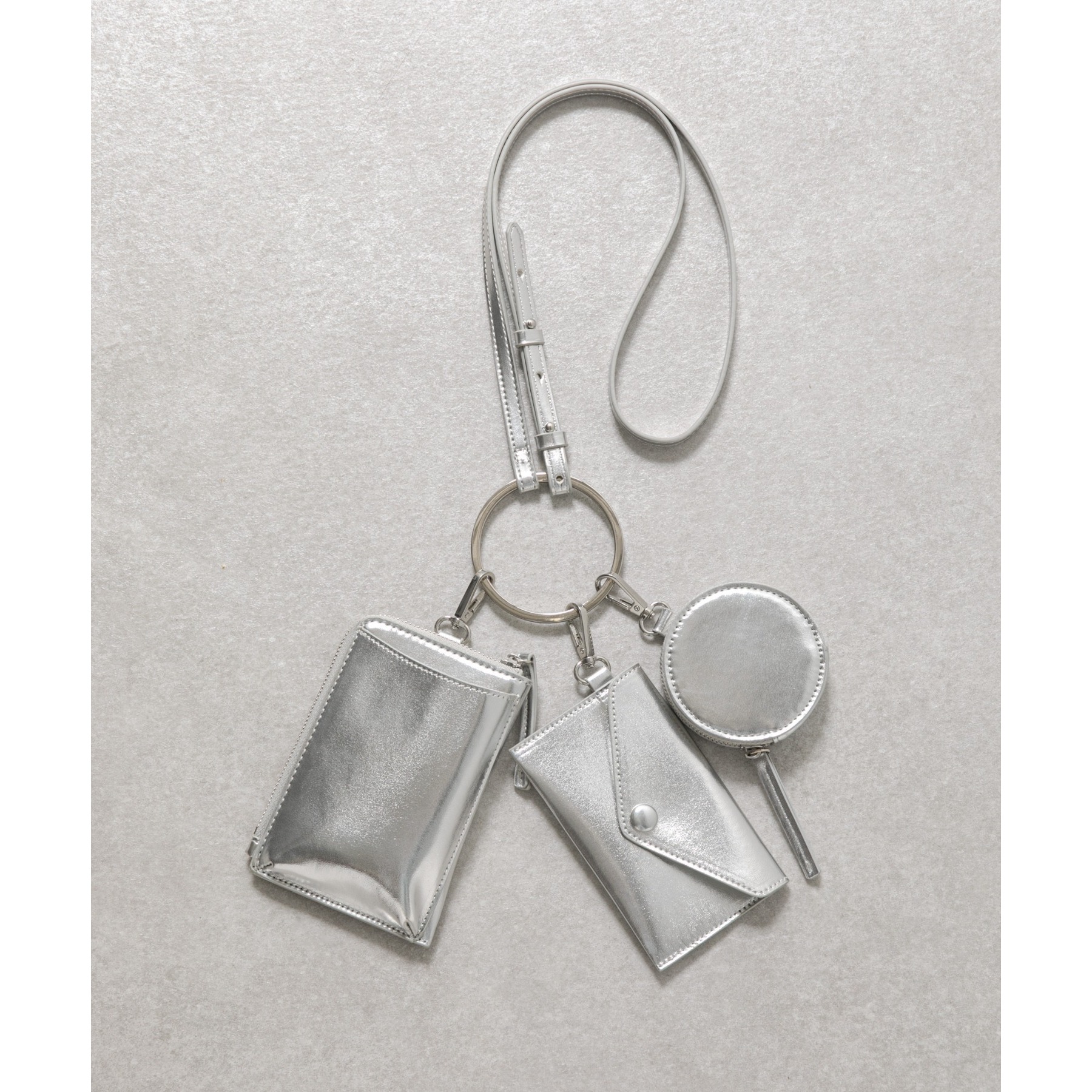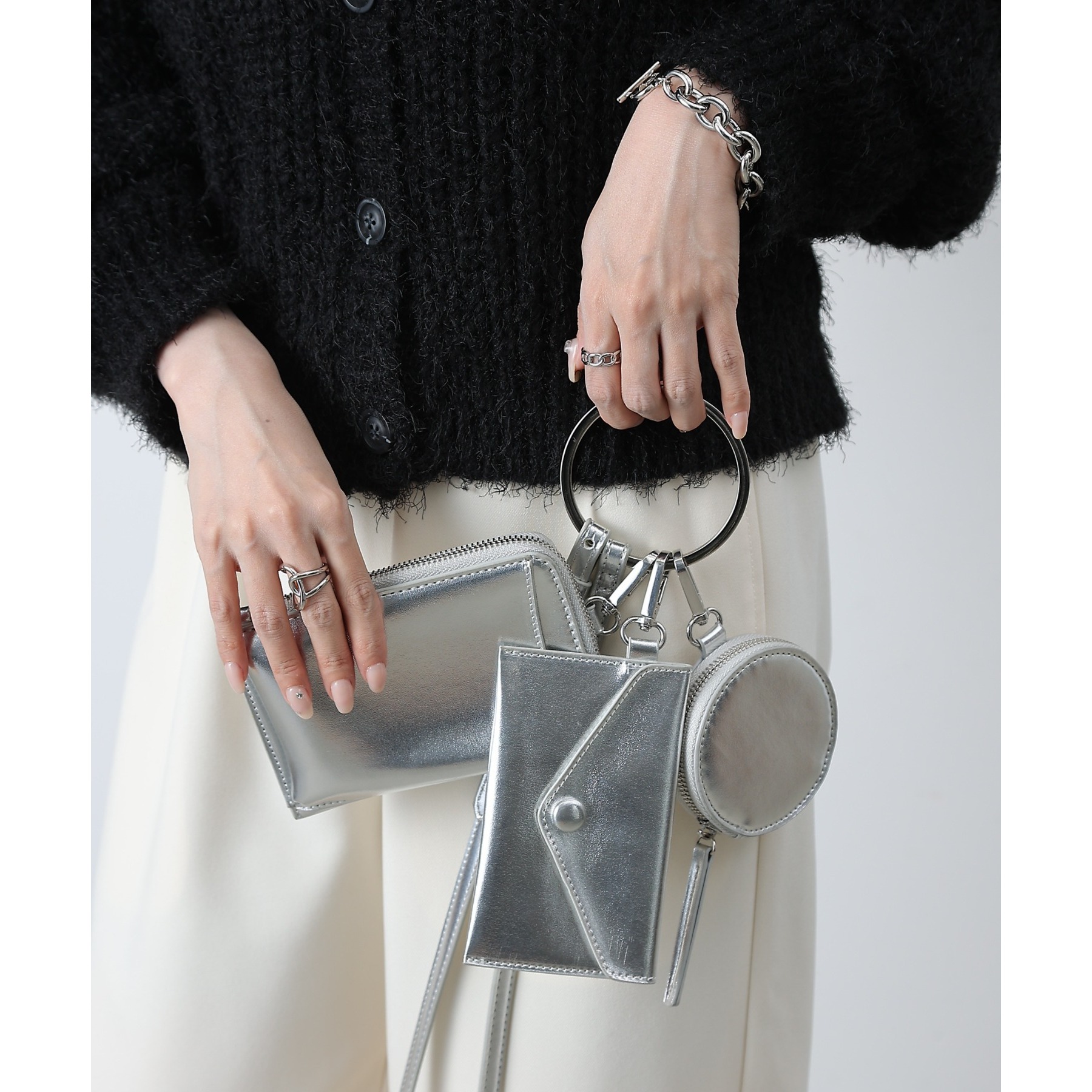 スマホカードケース、レター型ポーチ、丸型ミニポーチがリングに装着でき、ショルダーバッグとして使える3連バッグ。
