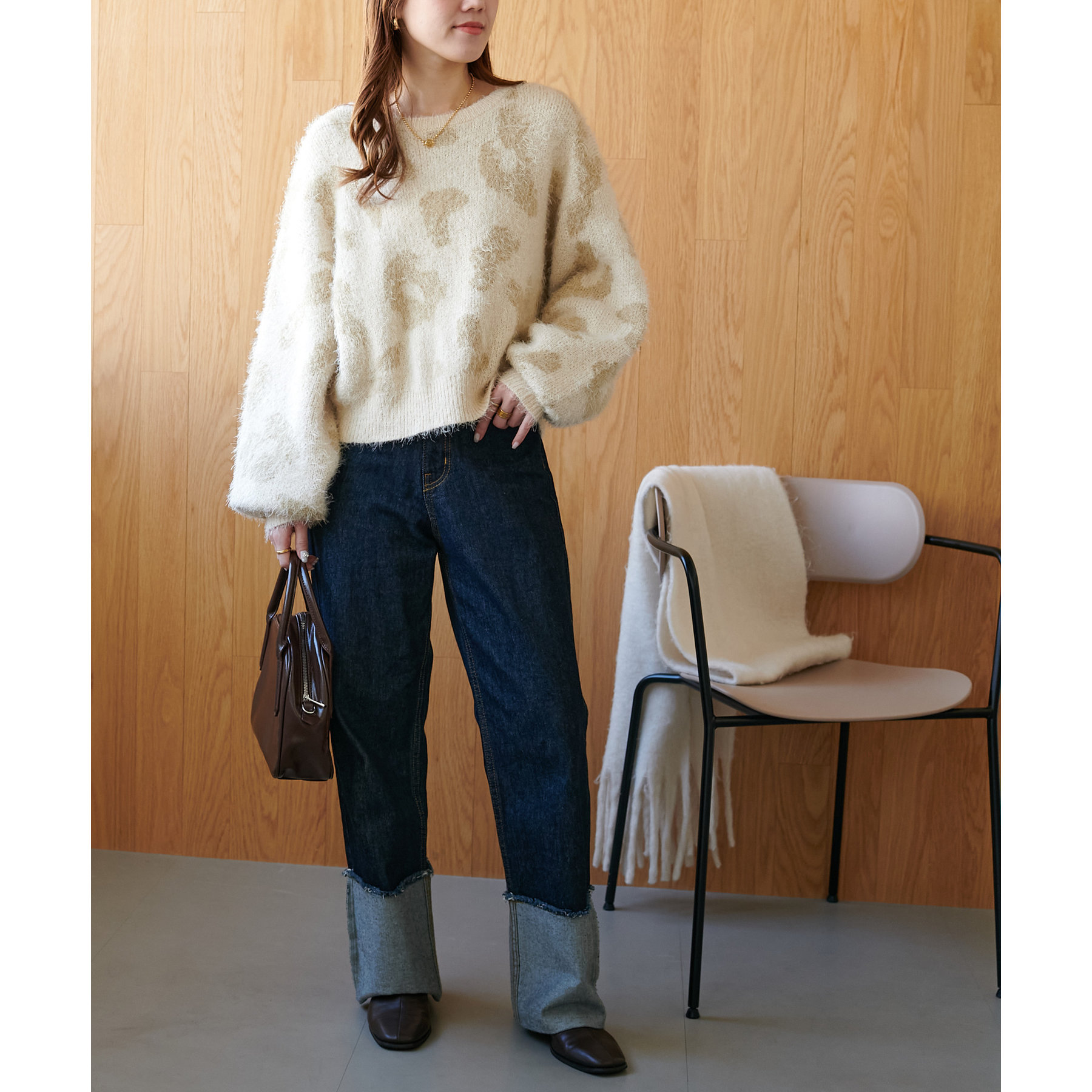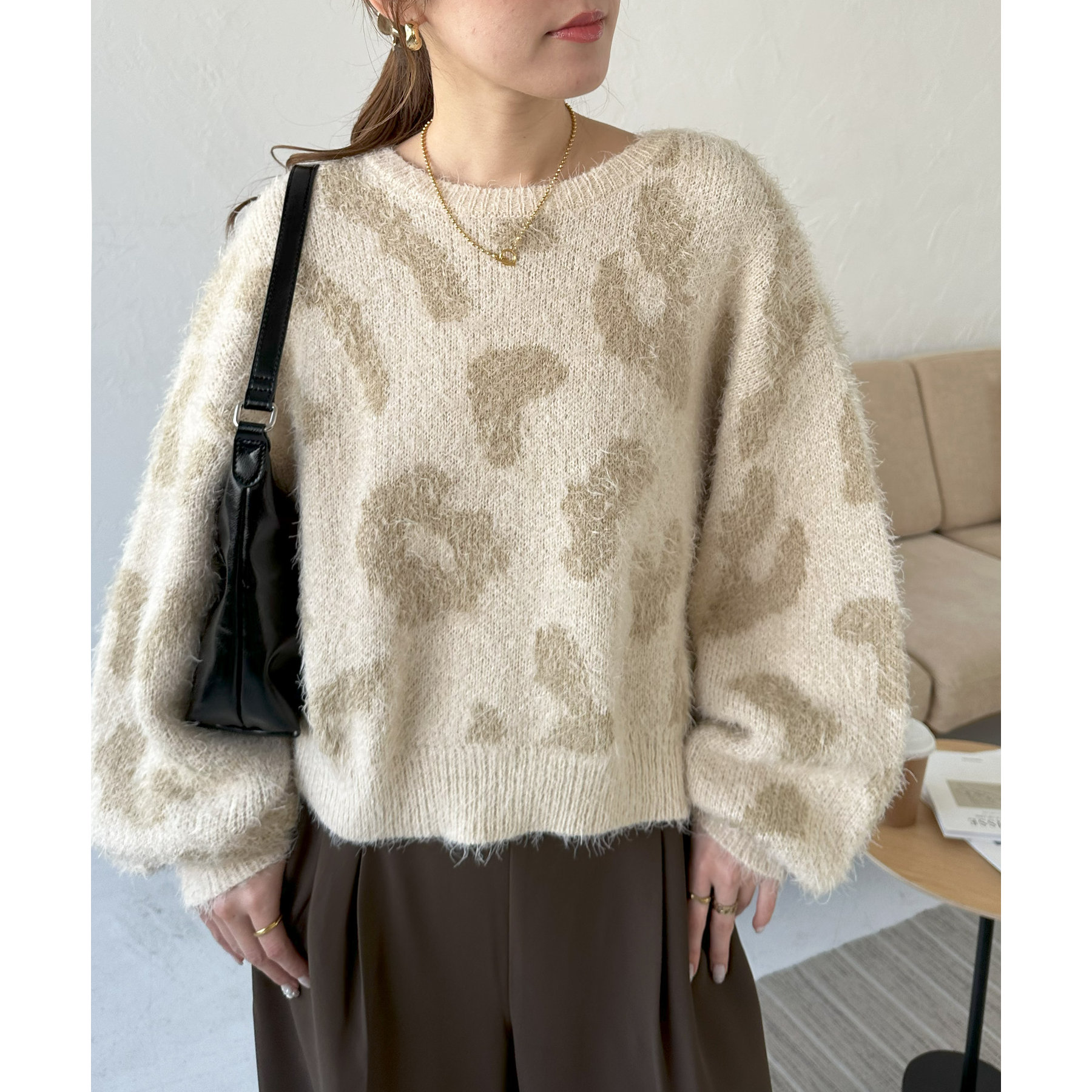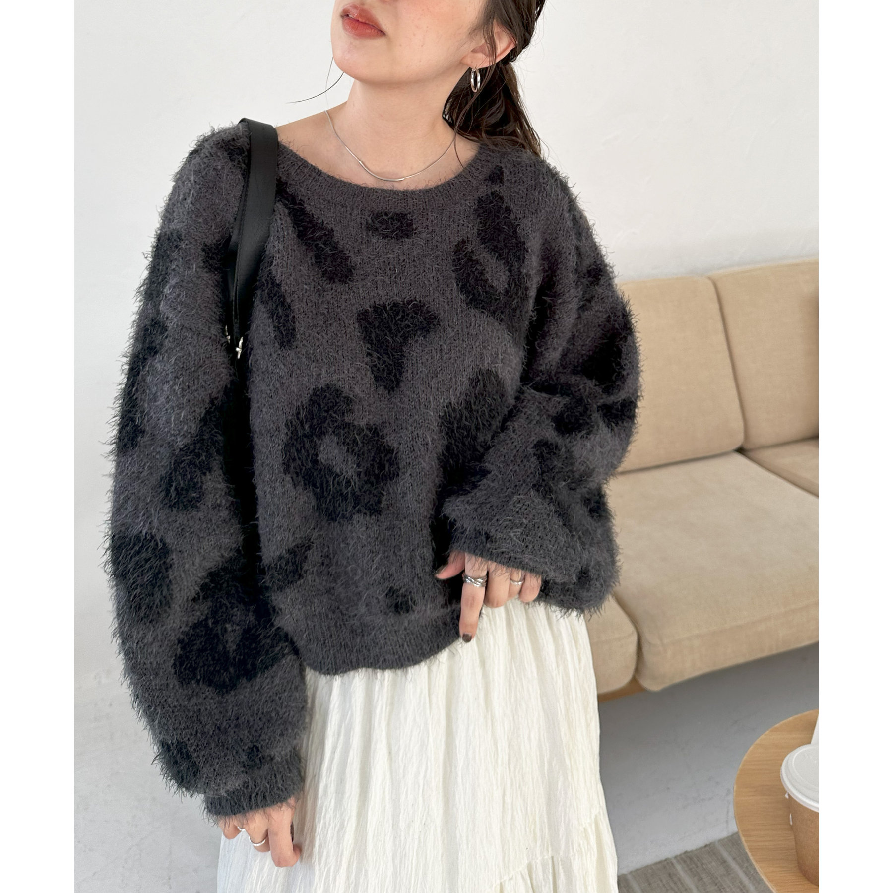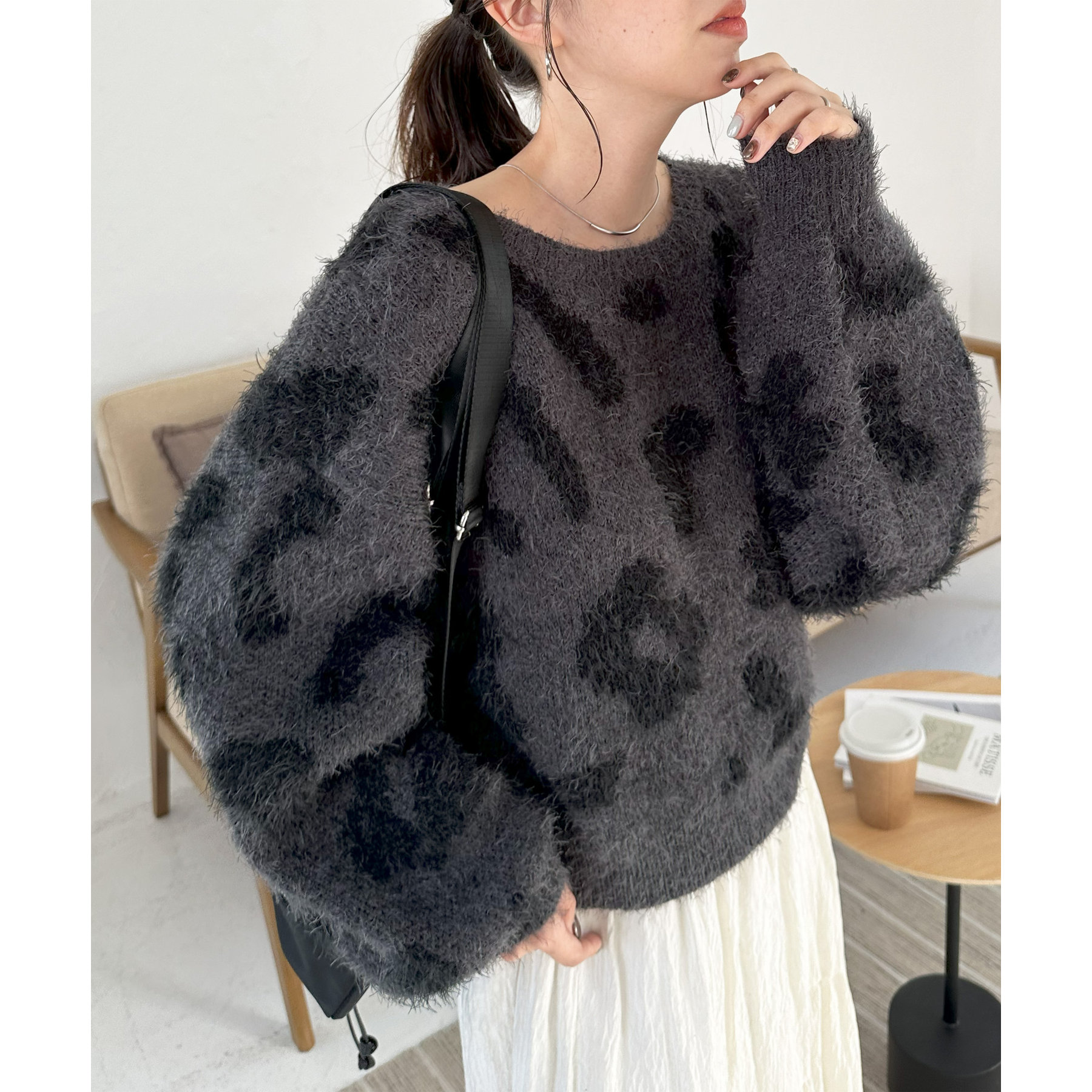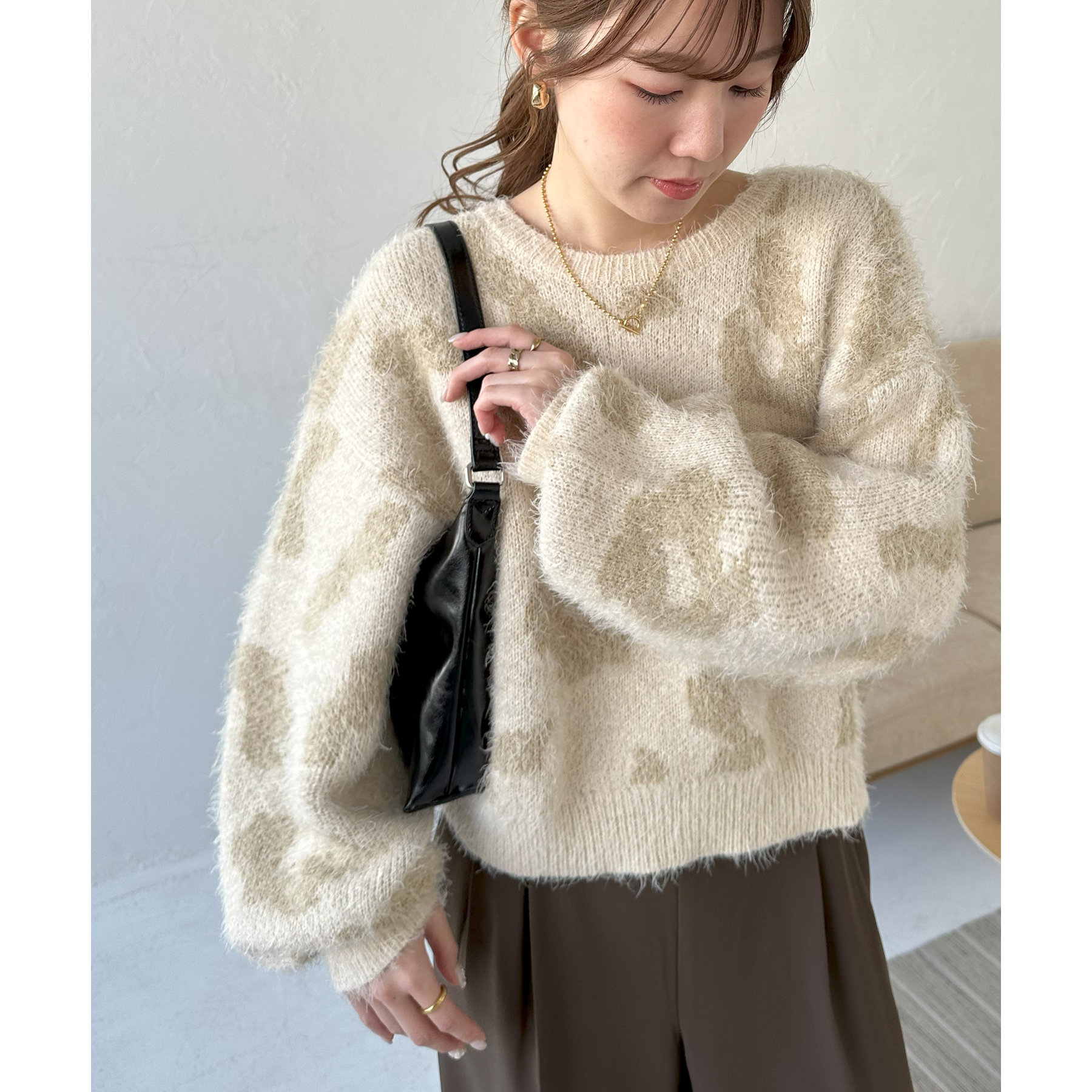 165cmスタッフ:レオパードといえばカジュアルな印象でしたが、フェザーヤーン素材にしたことで柔らかな印象になり甘目のアイテムとも合わせられます!