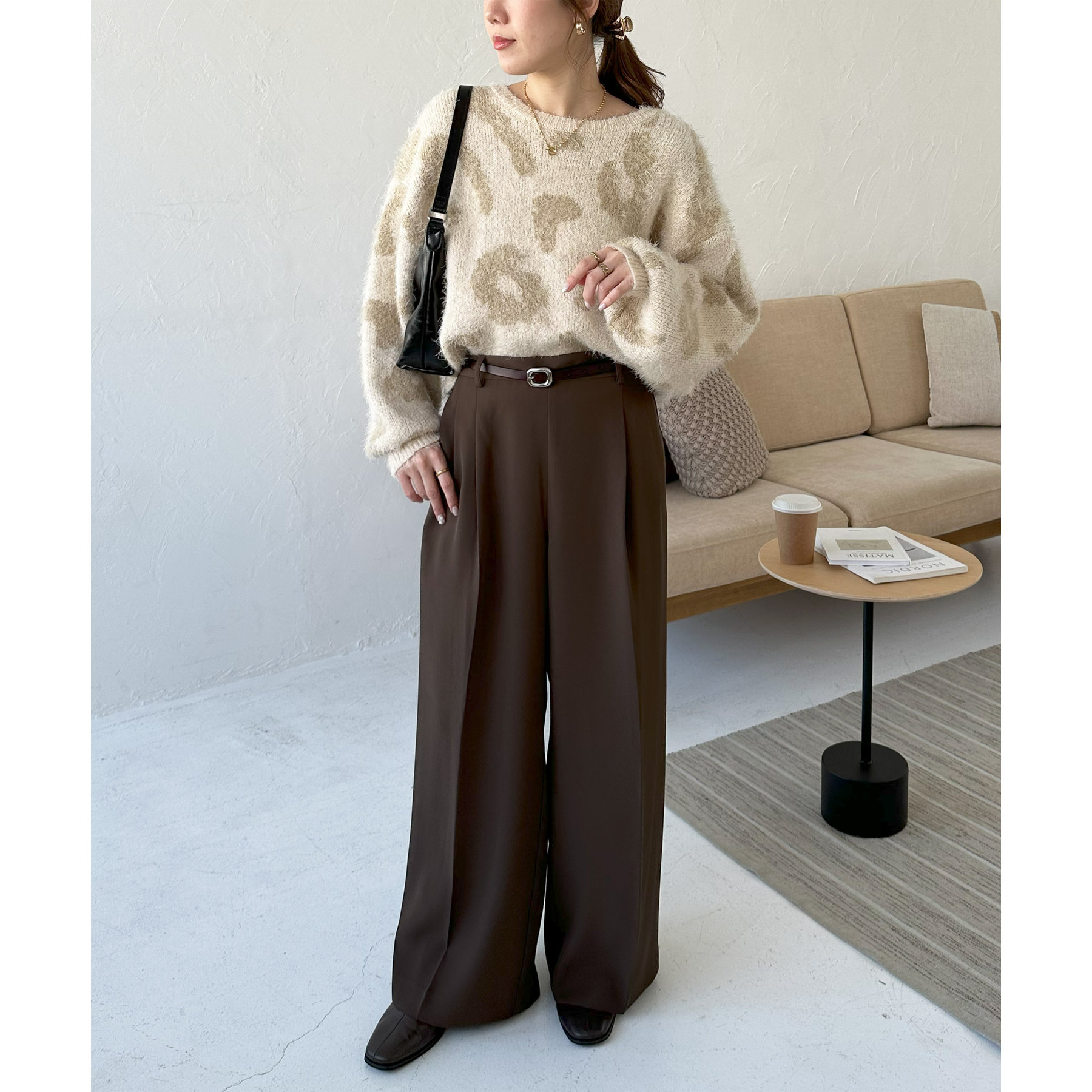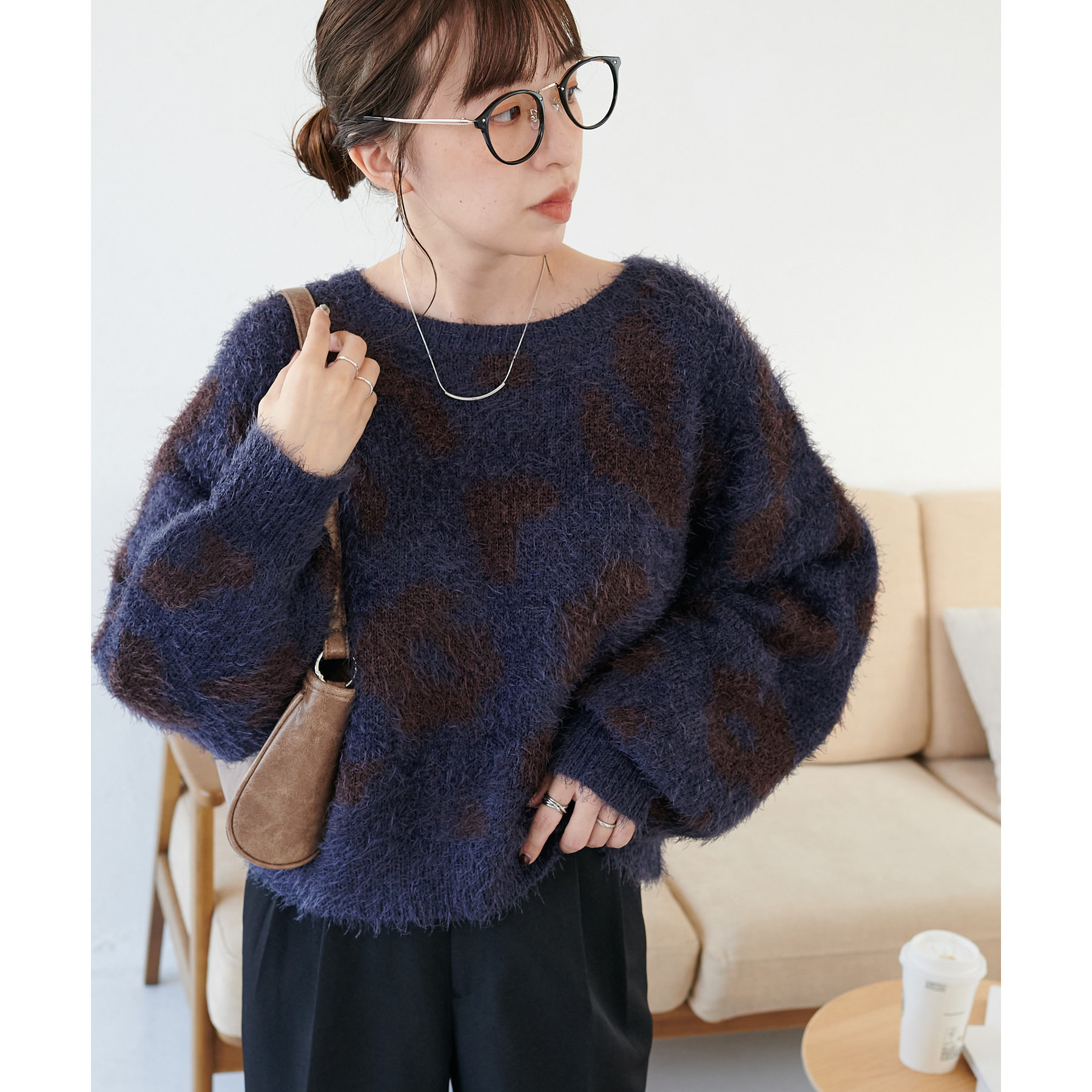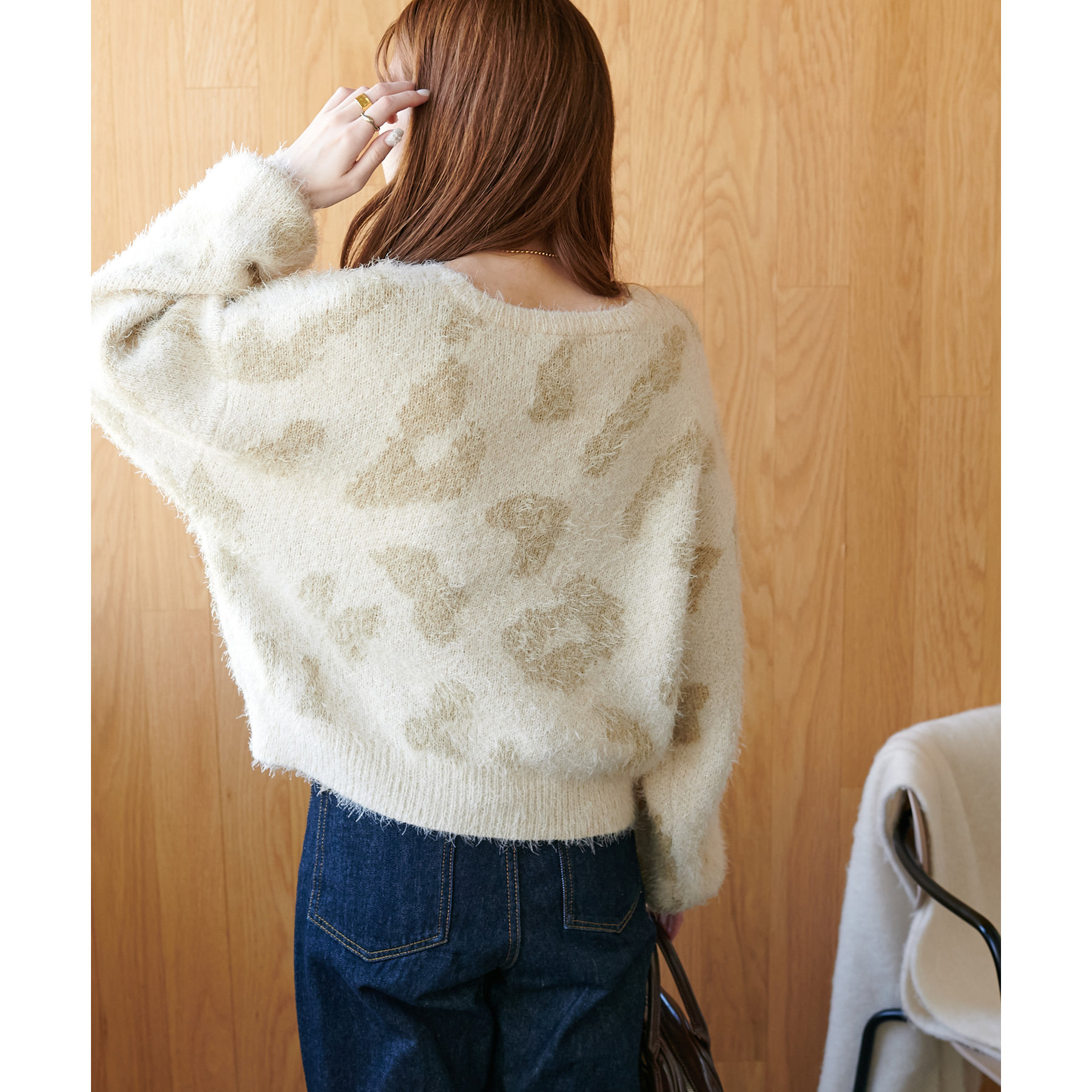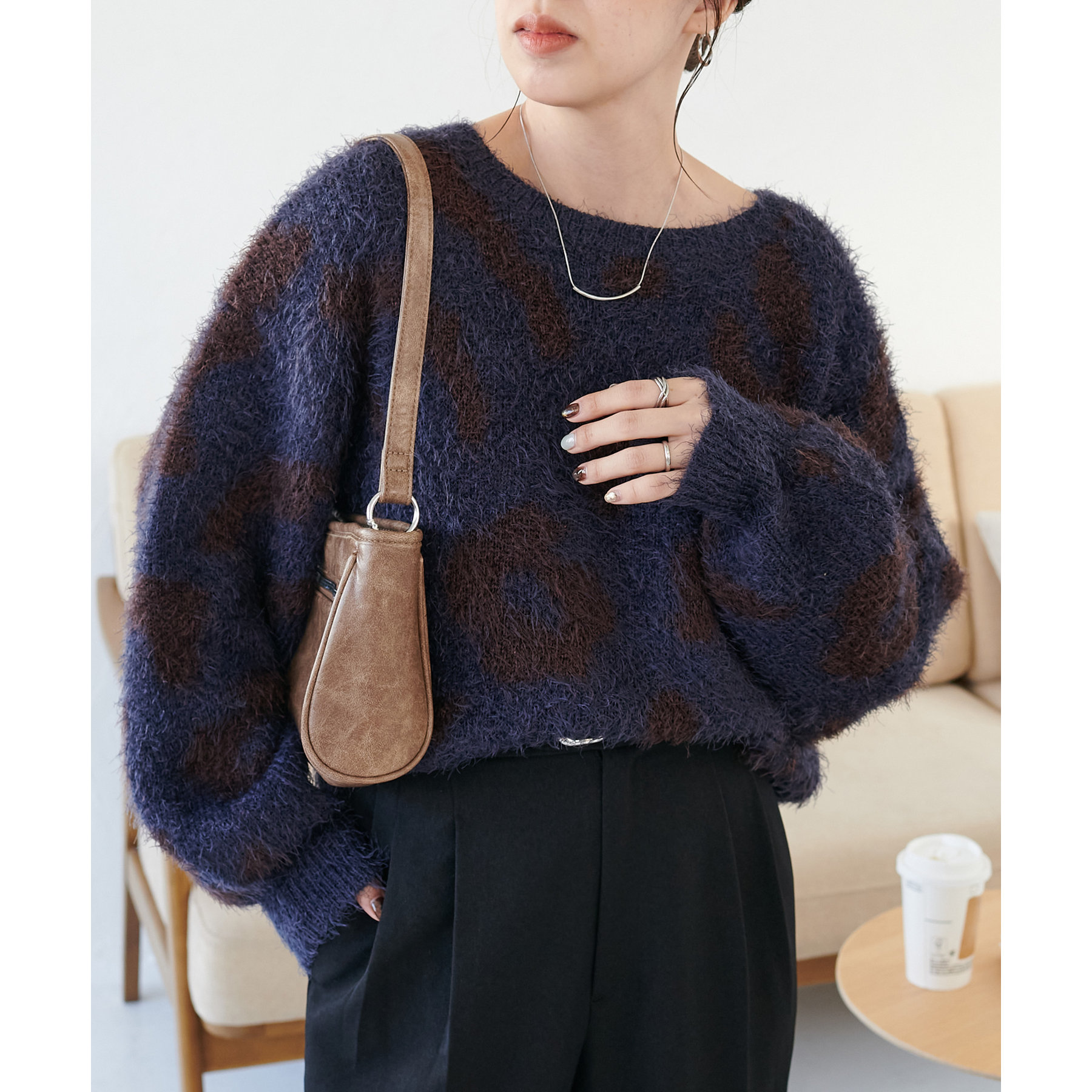 165cmスタッフ:レオパードといえばカジュアルな印象でしたが、フェザーヤーン素材にしたことで柔らかな印象になり甘目のアイテムとも合わせられます!