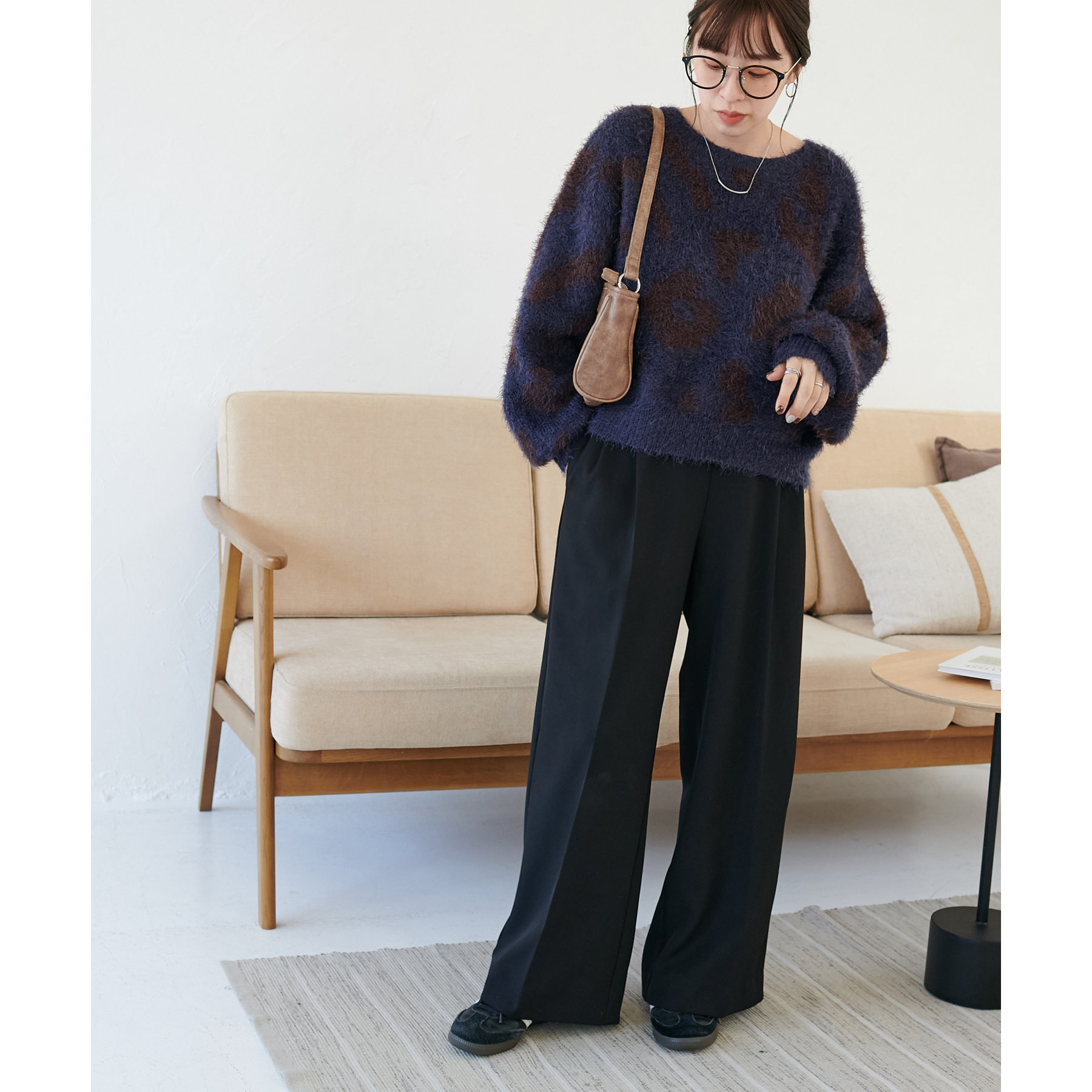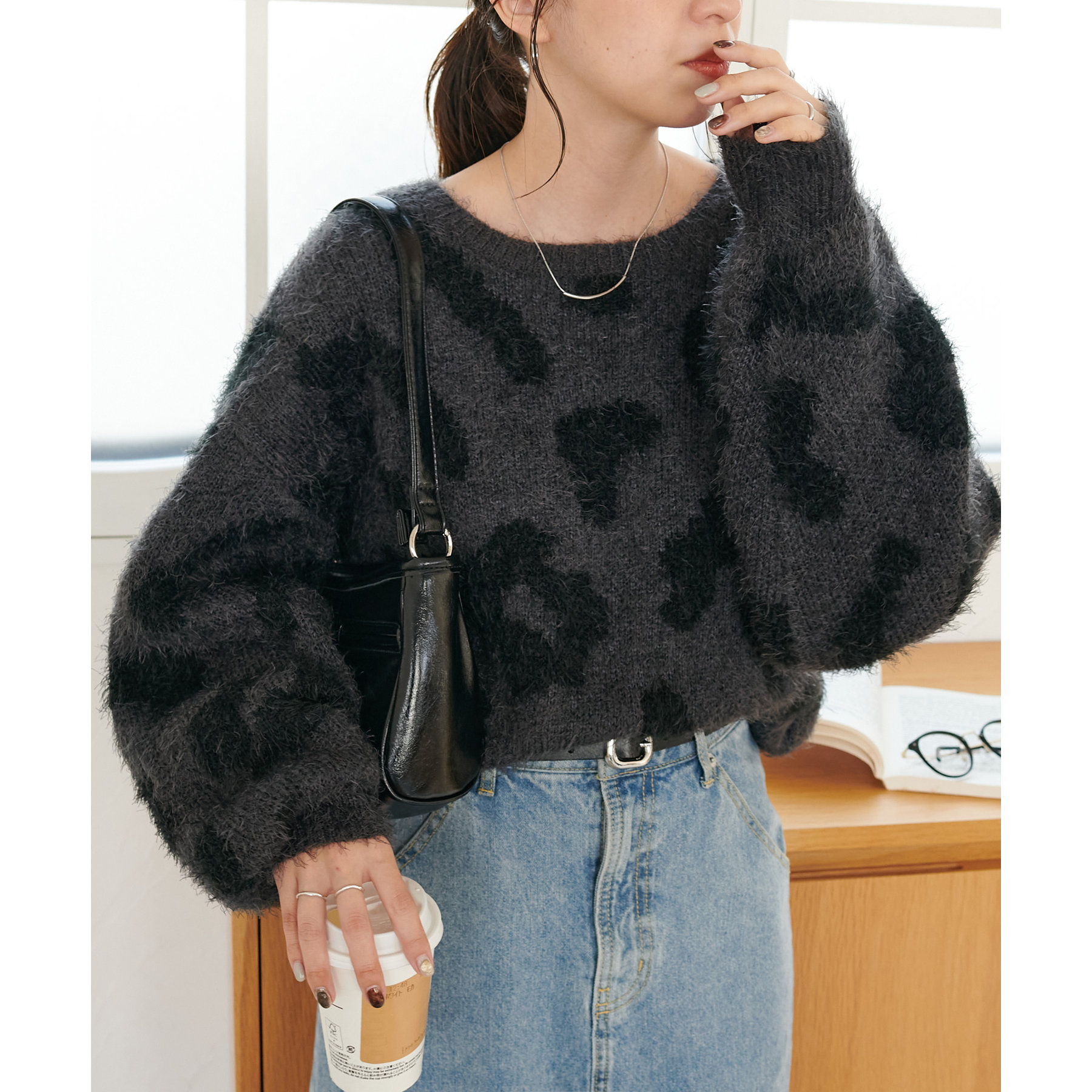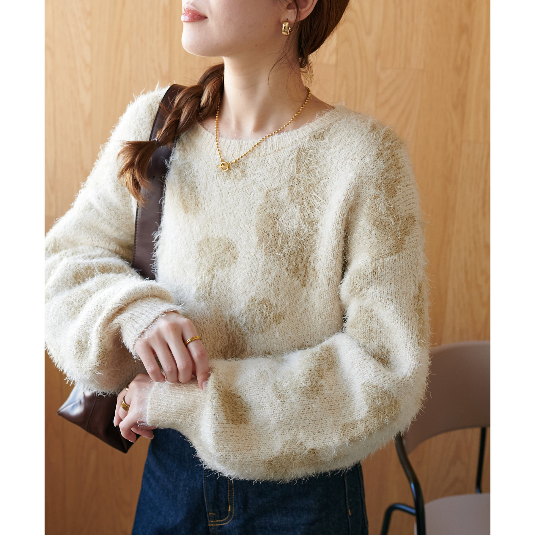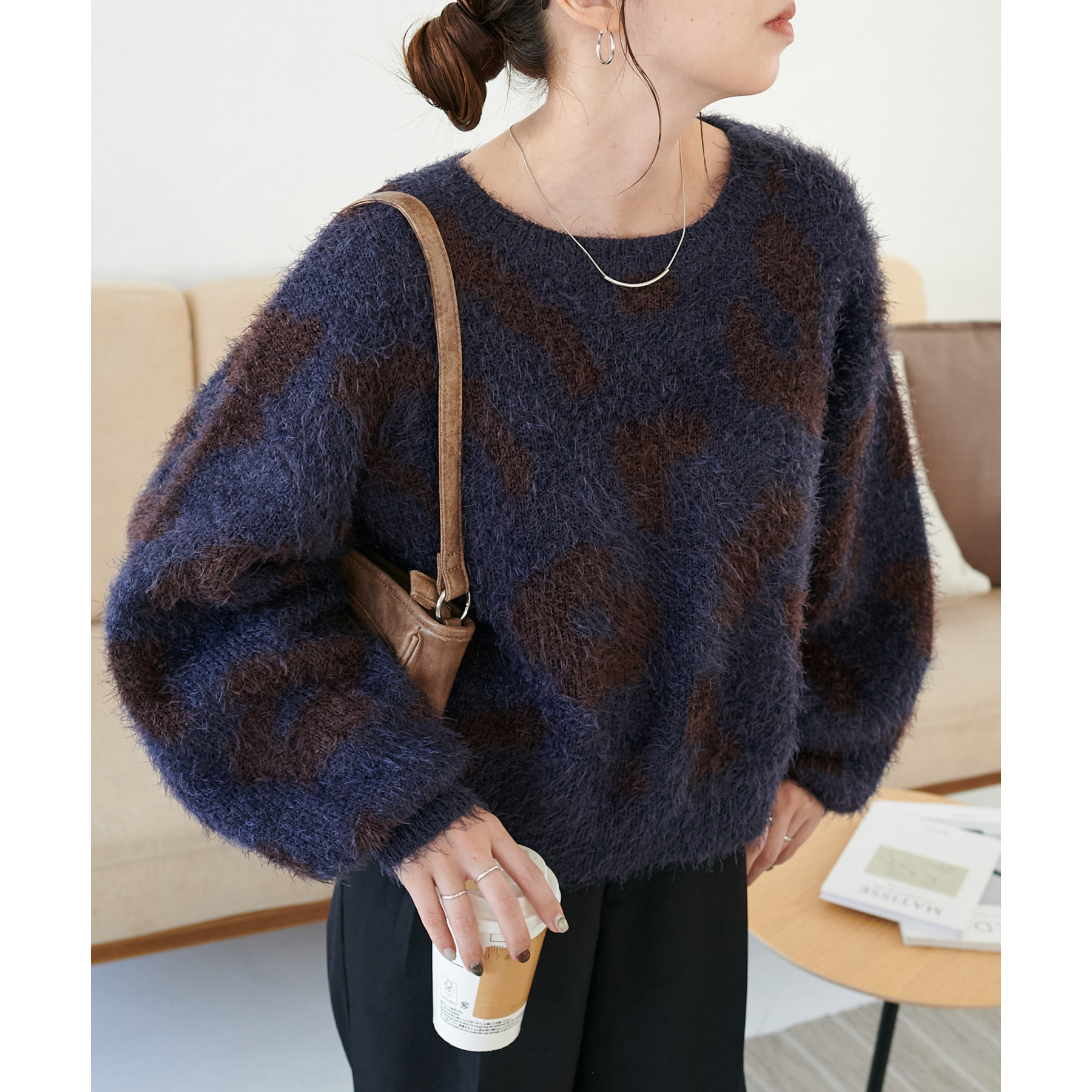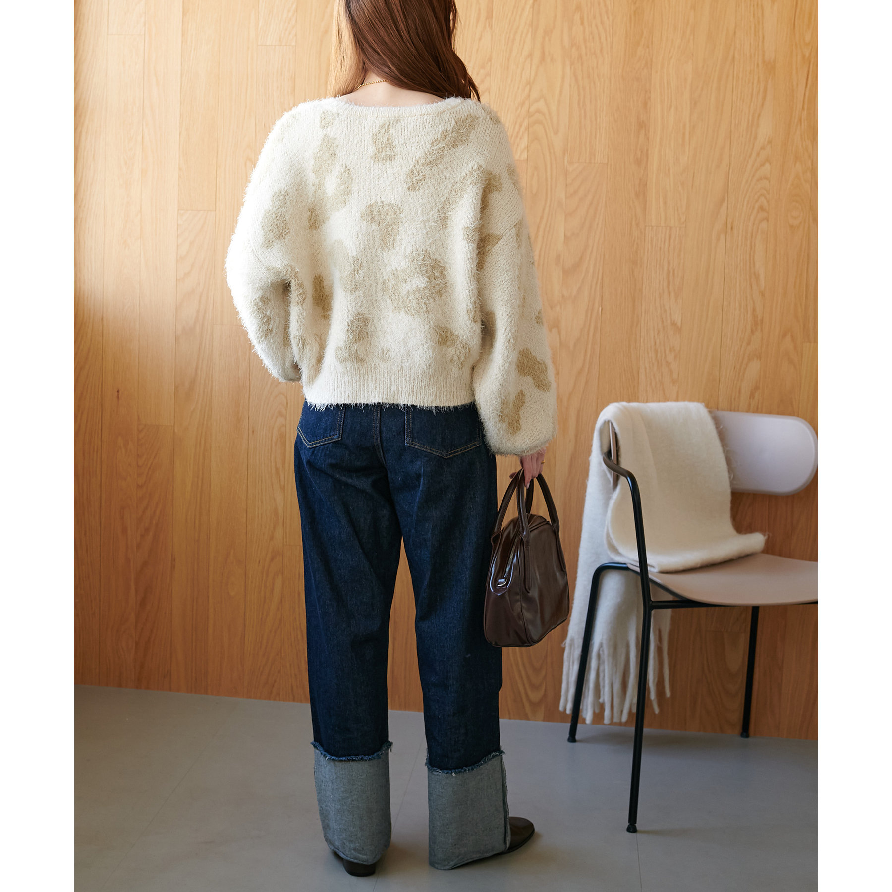 165cmスタッフ:レオパードといえばカジュアルな印象でしたが、フェザーヤーン素材にしたことで柔らかな印象になり甘目のアイテムとも合わせられます!