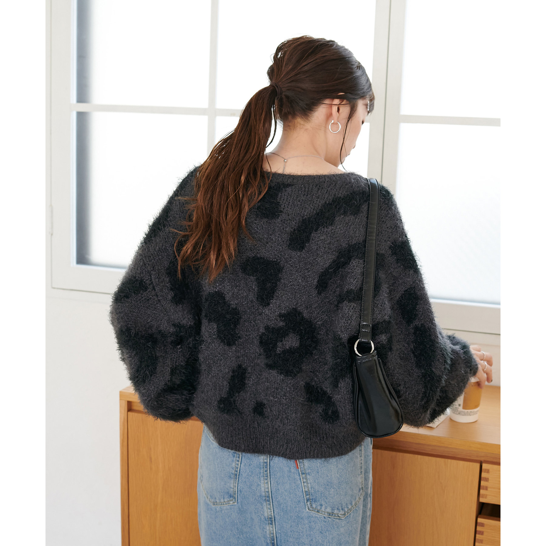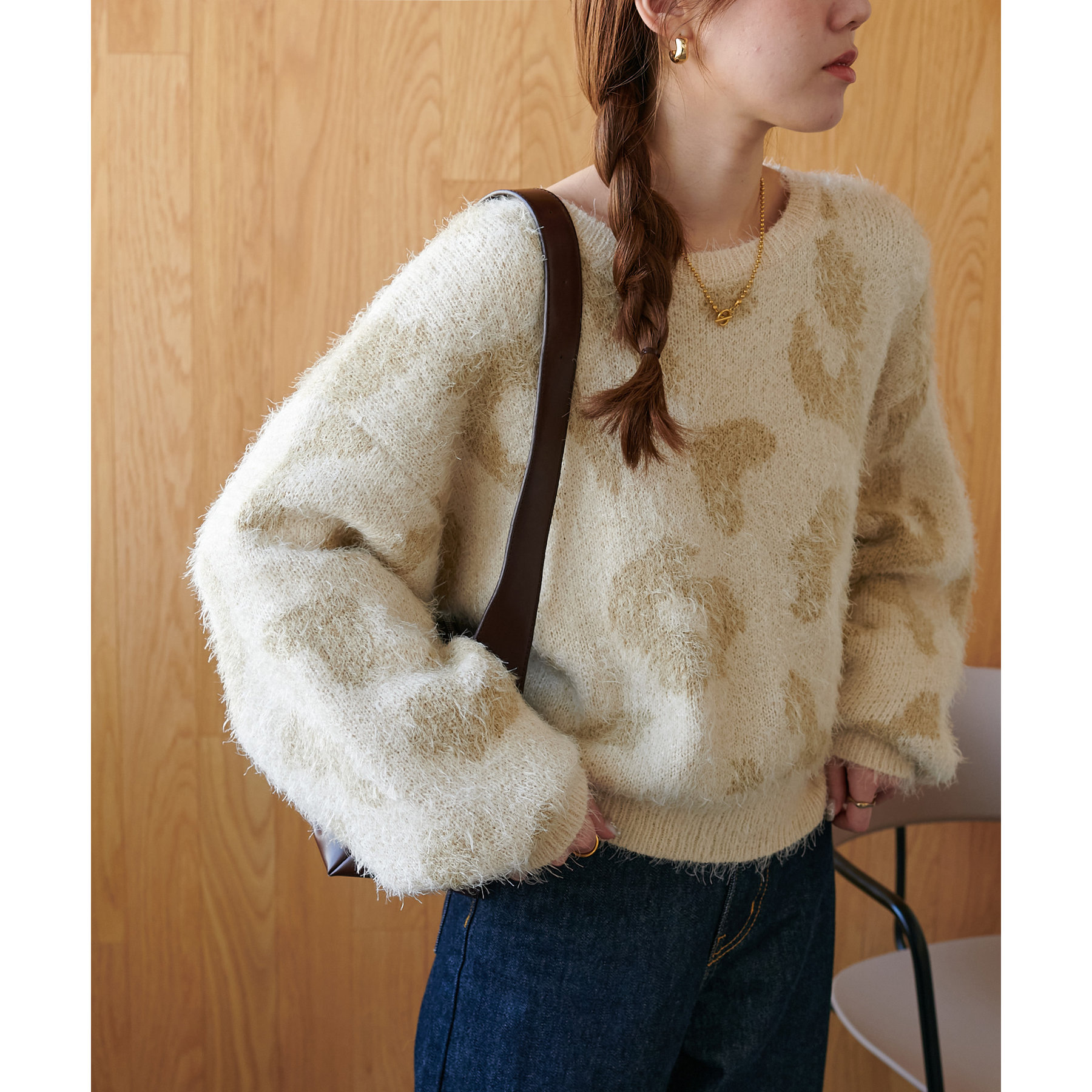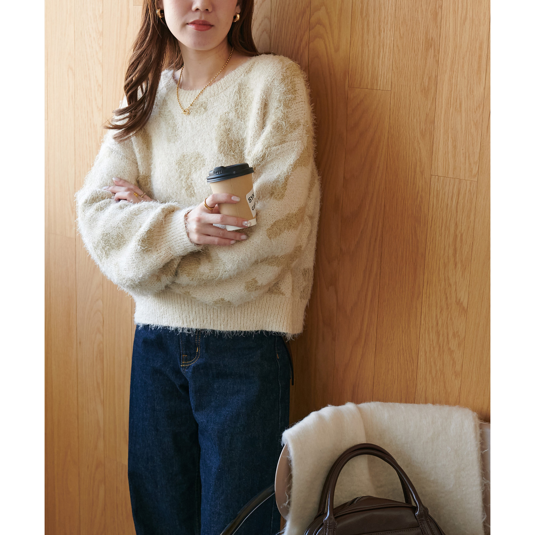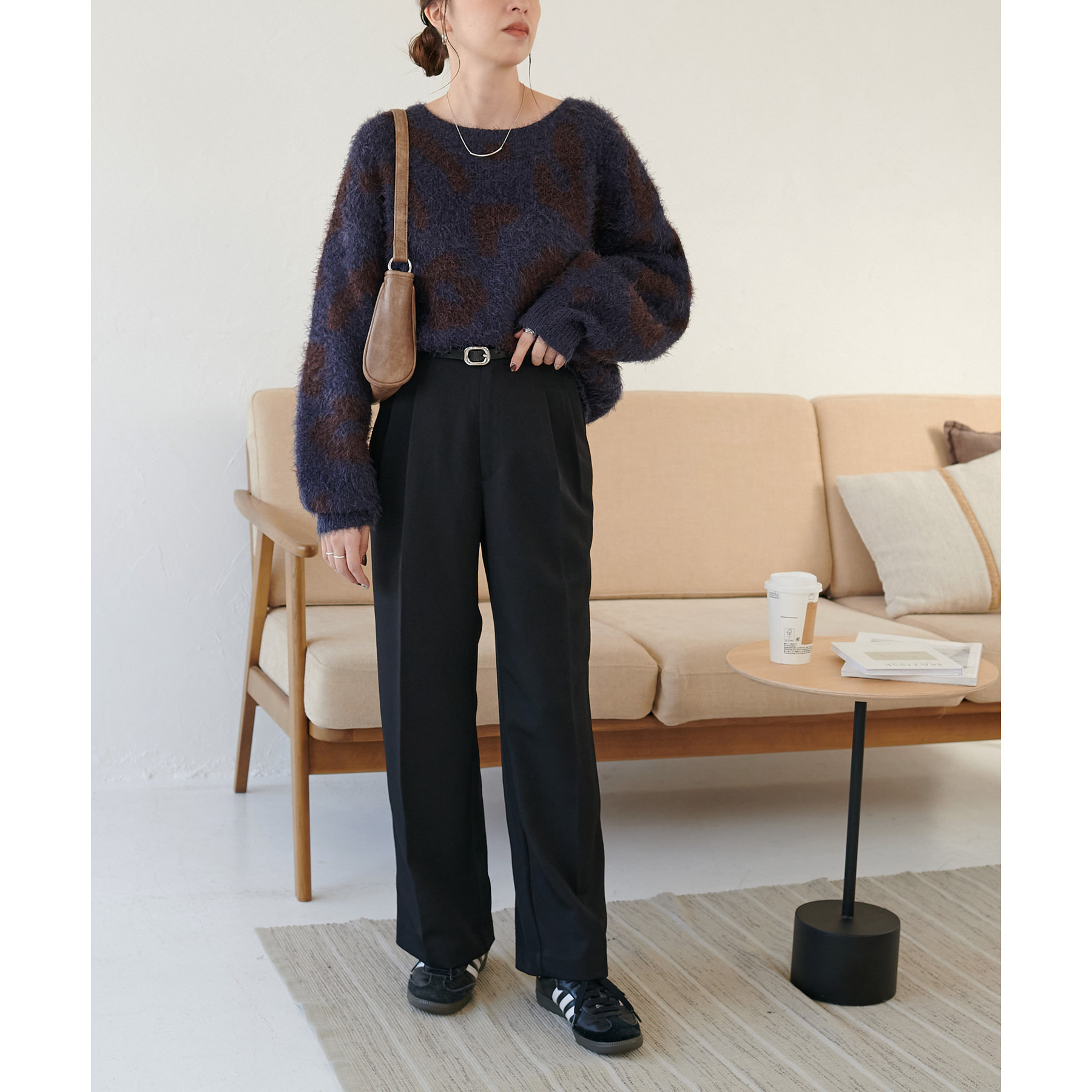 165cmスタッフ:レオパードといえばカジュアルな印象でしたが、フェザーヤーン素材にしたことで柔らかな印象になり甘目のアイテムとも合わせられます!