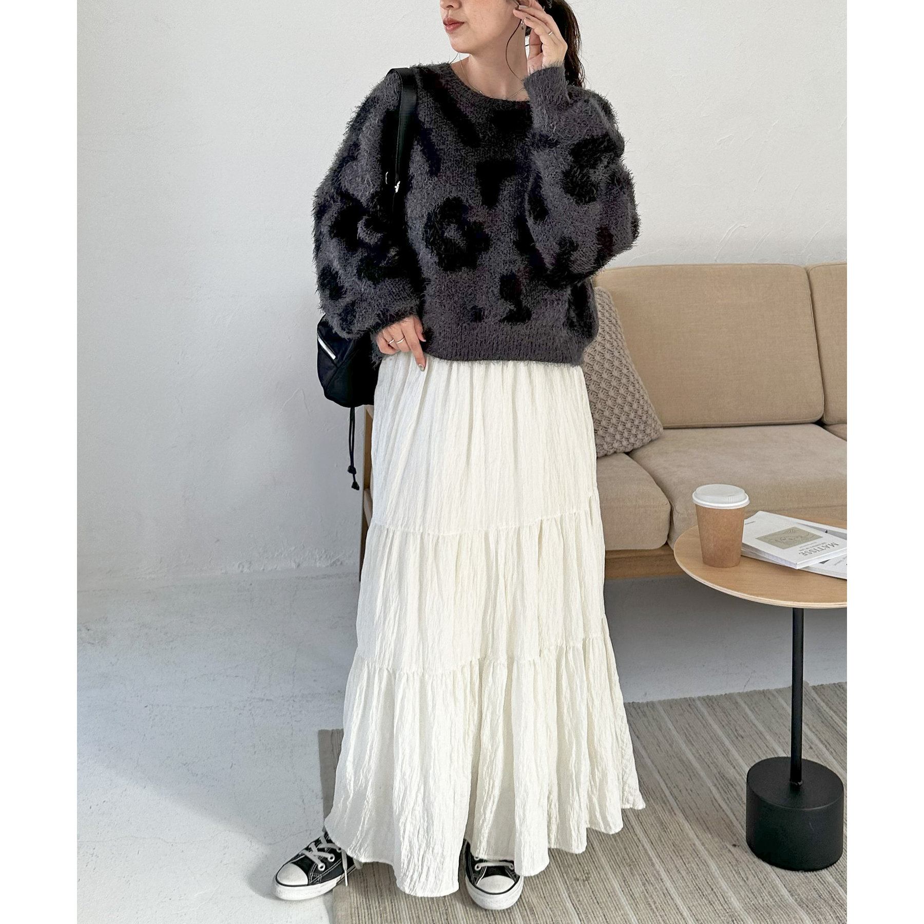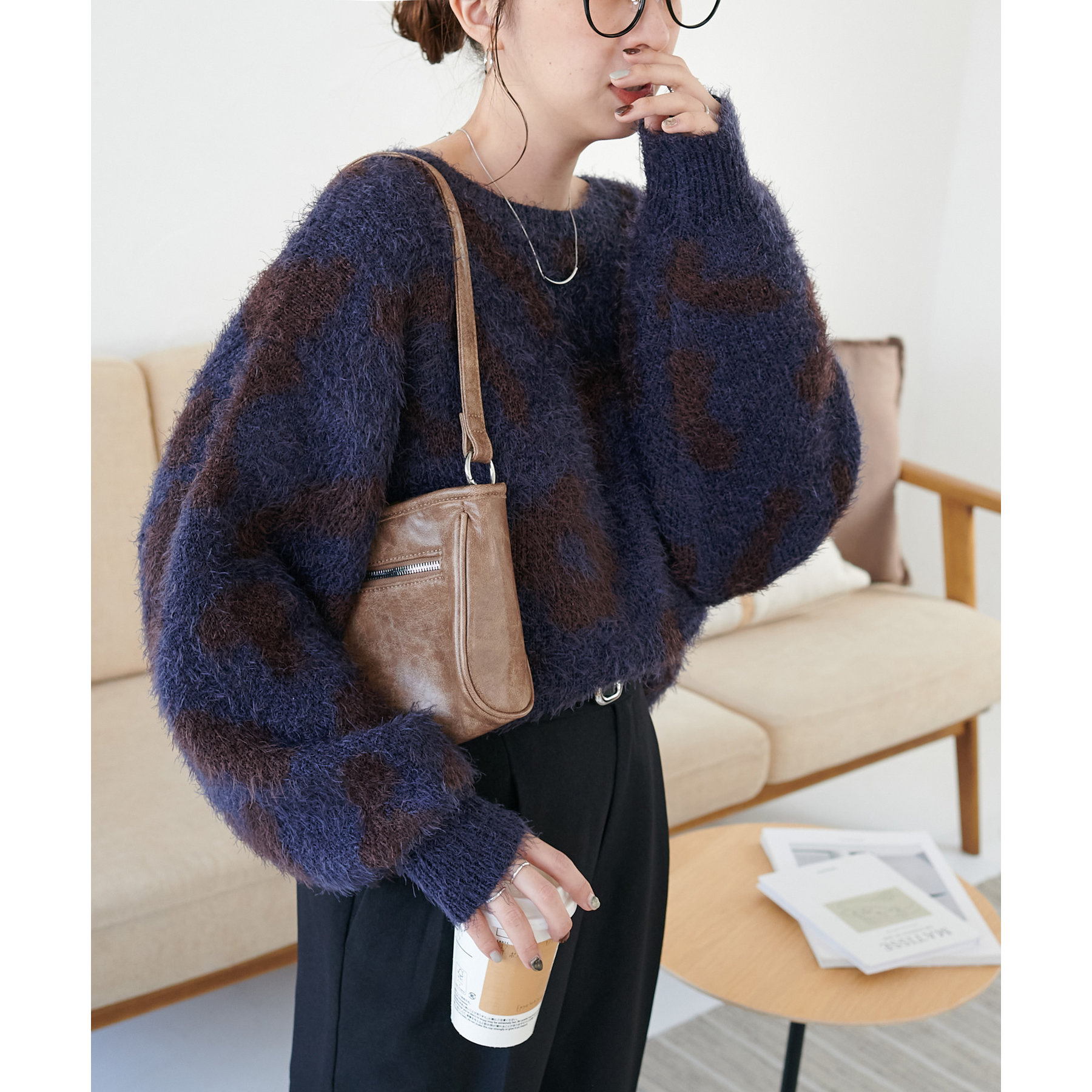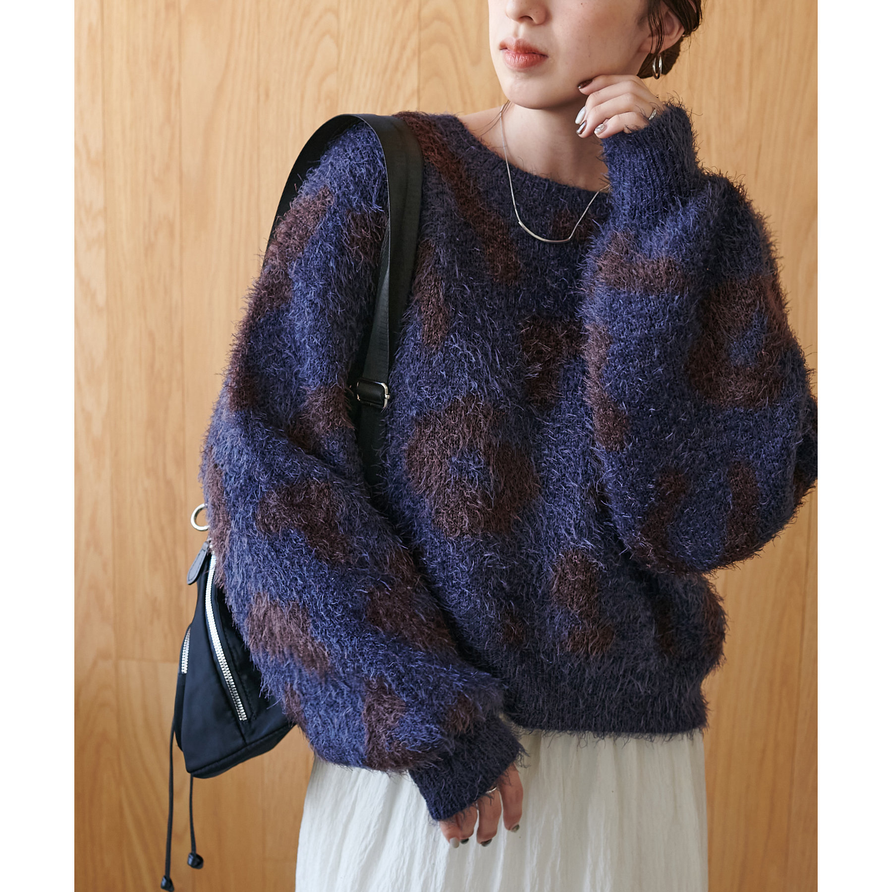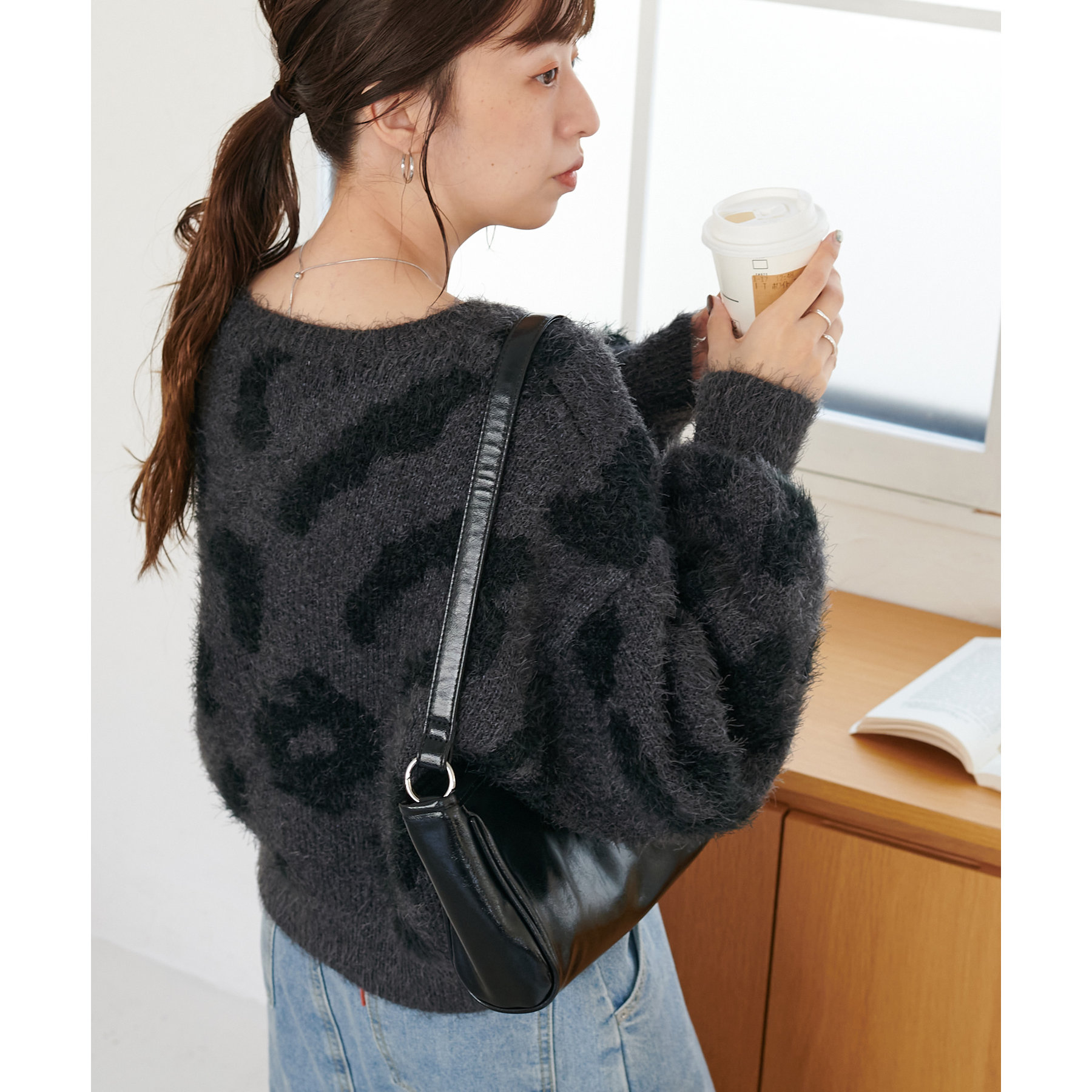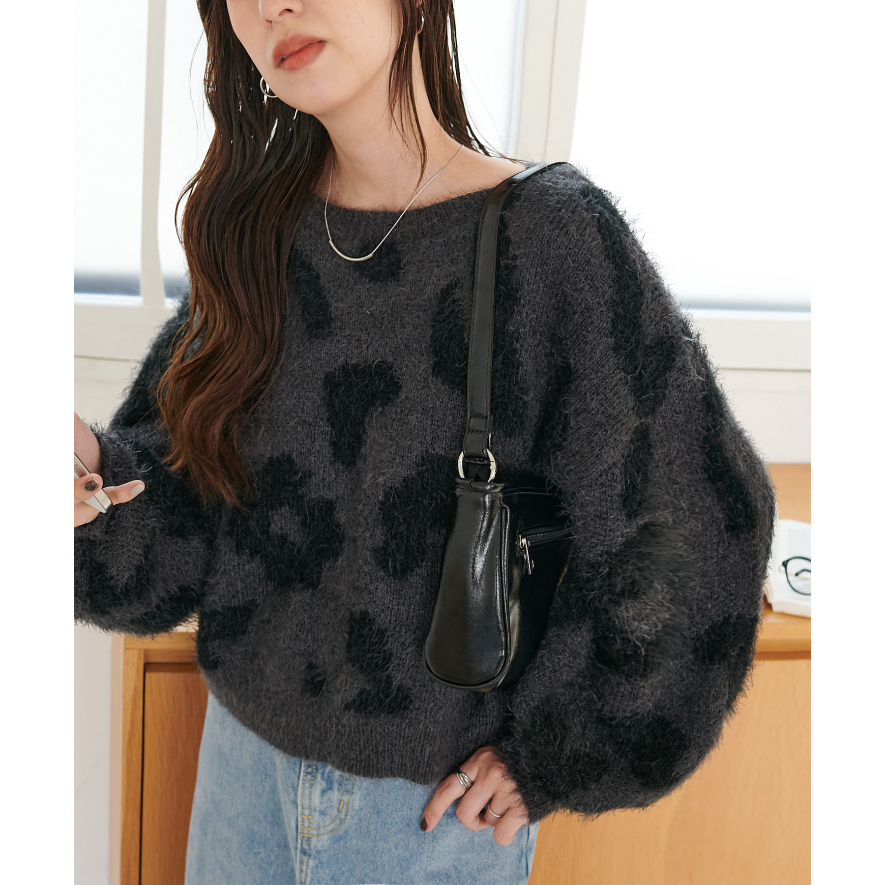 165cmスタッフ:レオパードといえばカジュアルな印象でしたが、フェザーヤーン素材にしたことで柔らかな印象になり甘目のアイテムとも合わせられます!