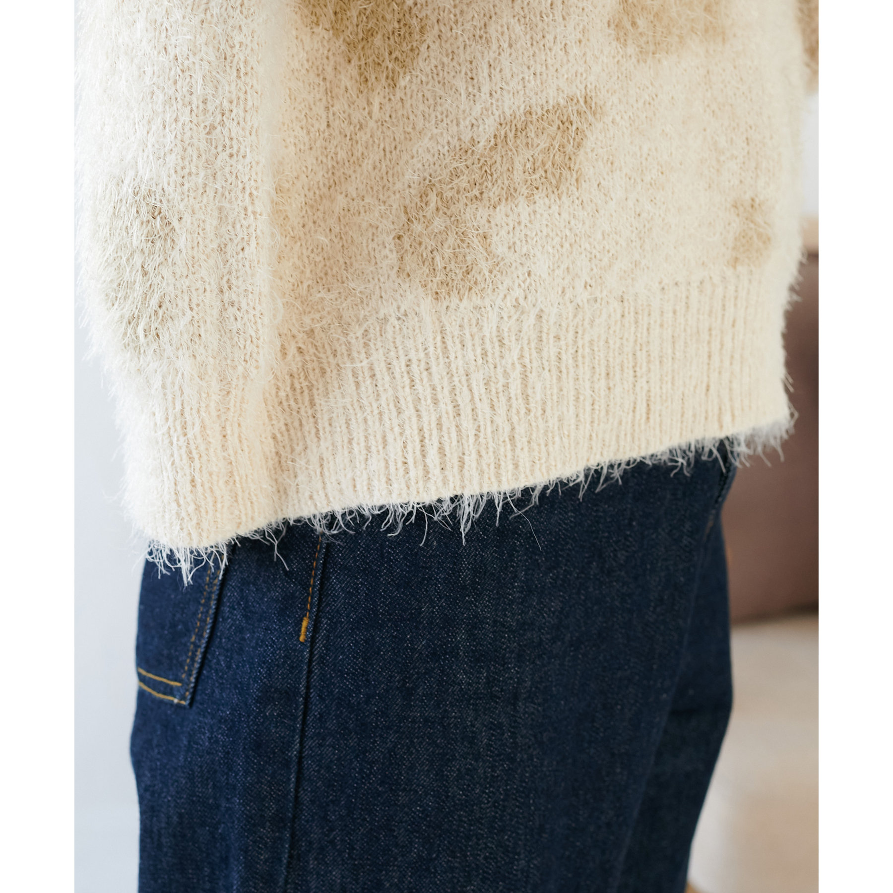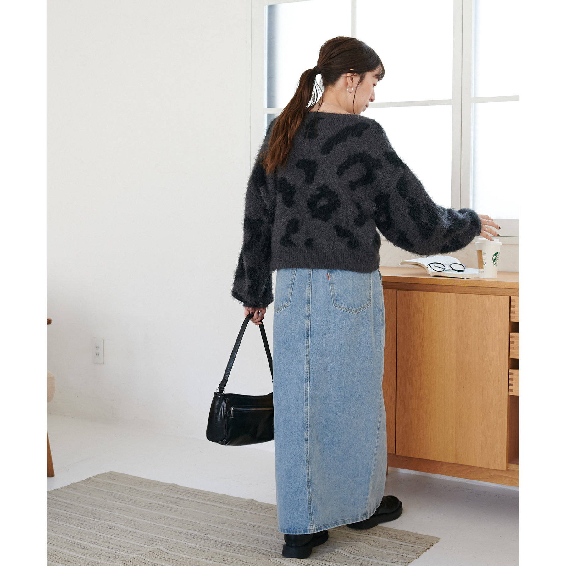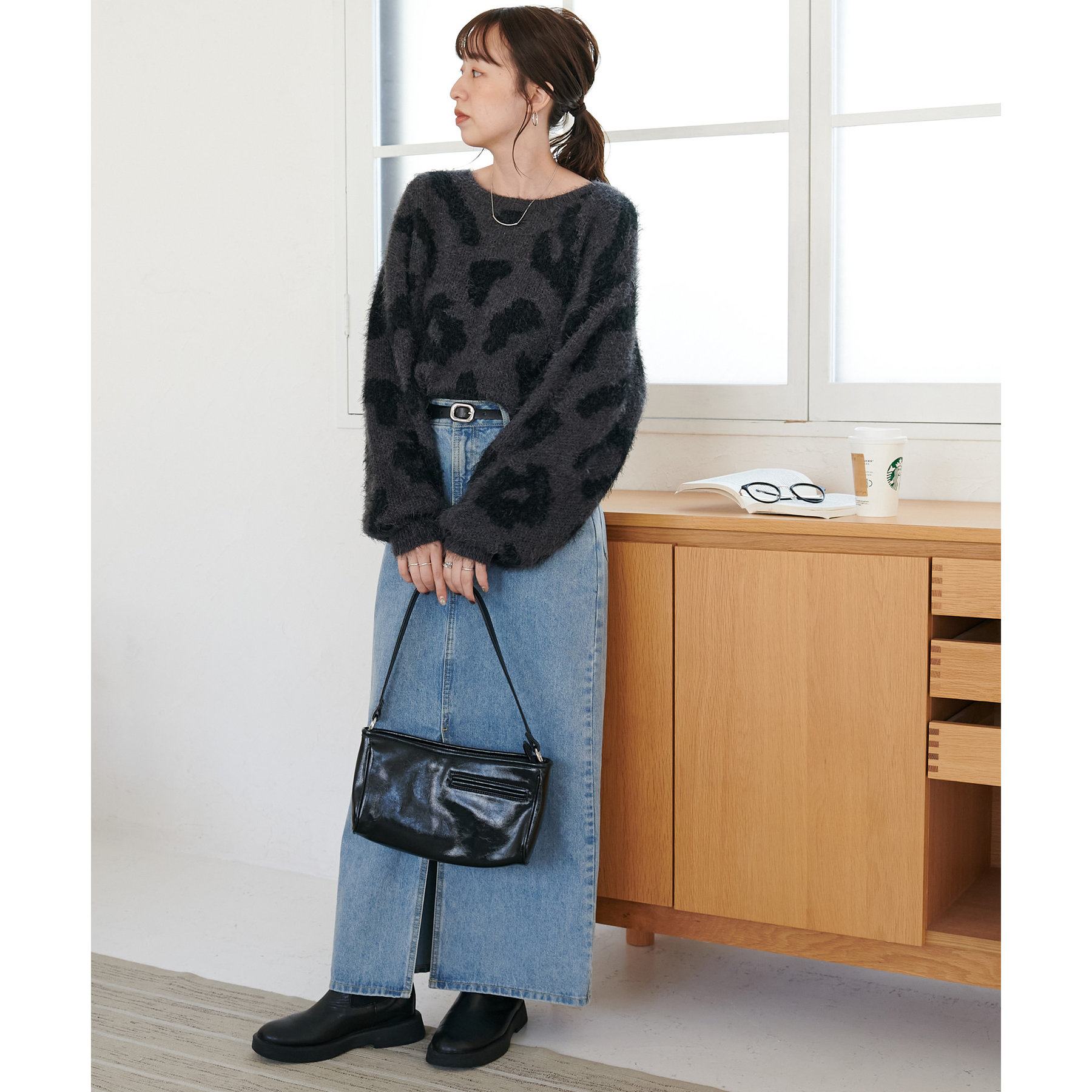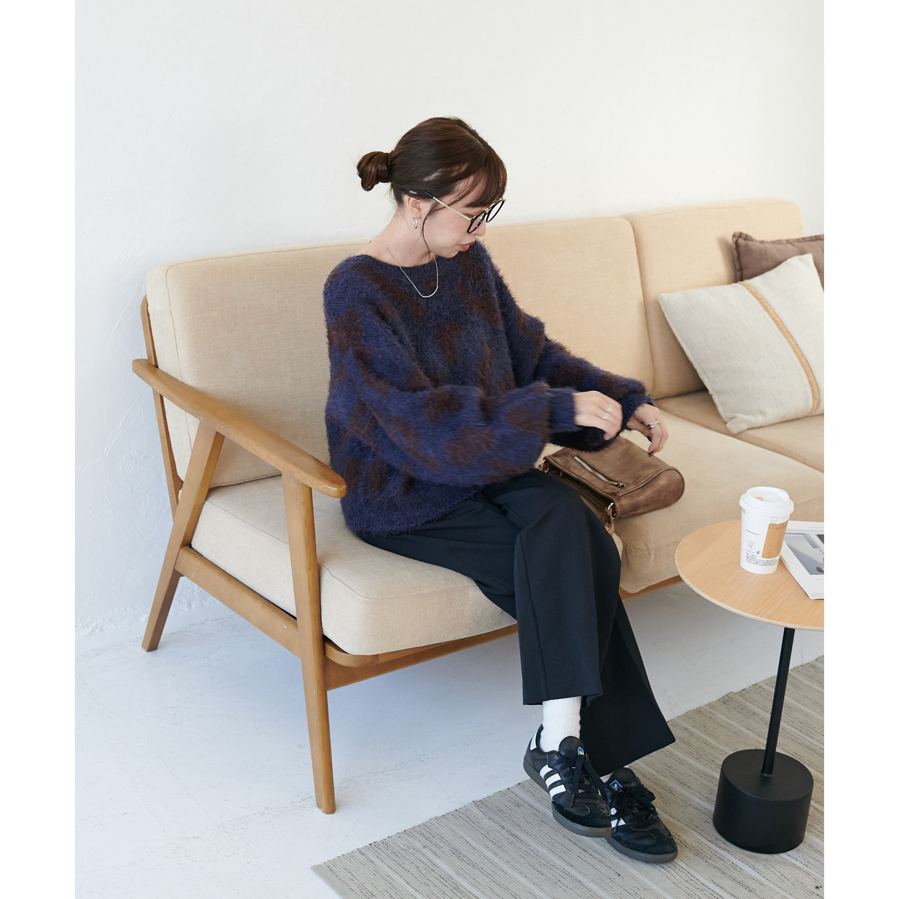165cmスタッフ:レオパードといえばカジュアルな印象でしたが、フェザーヤーン素材にしたことで柔らかな印象になり甘目のアイテムとも合わせられます!