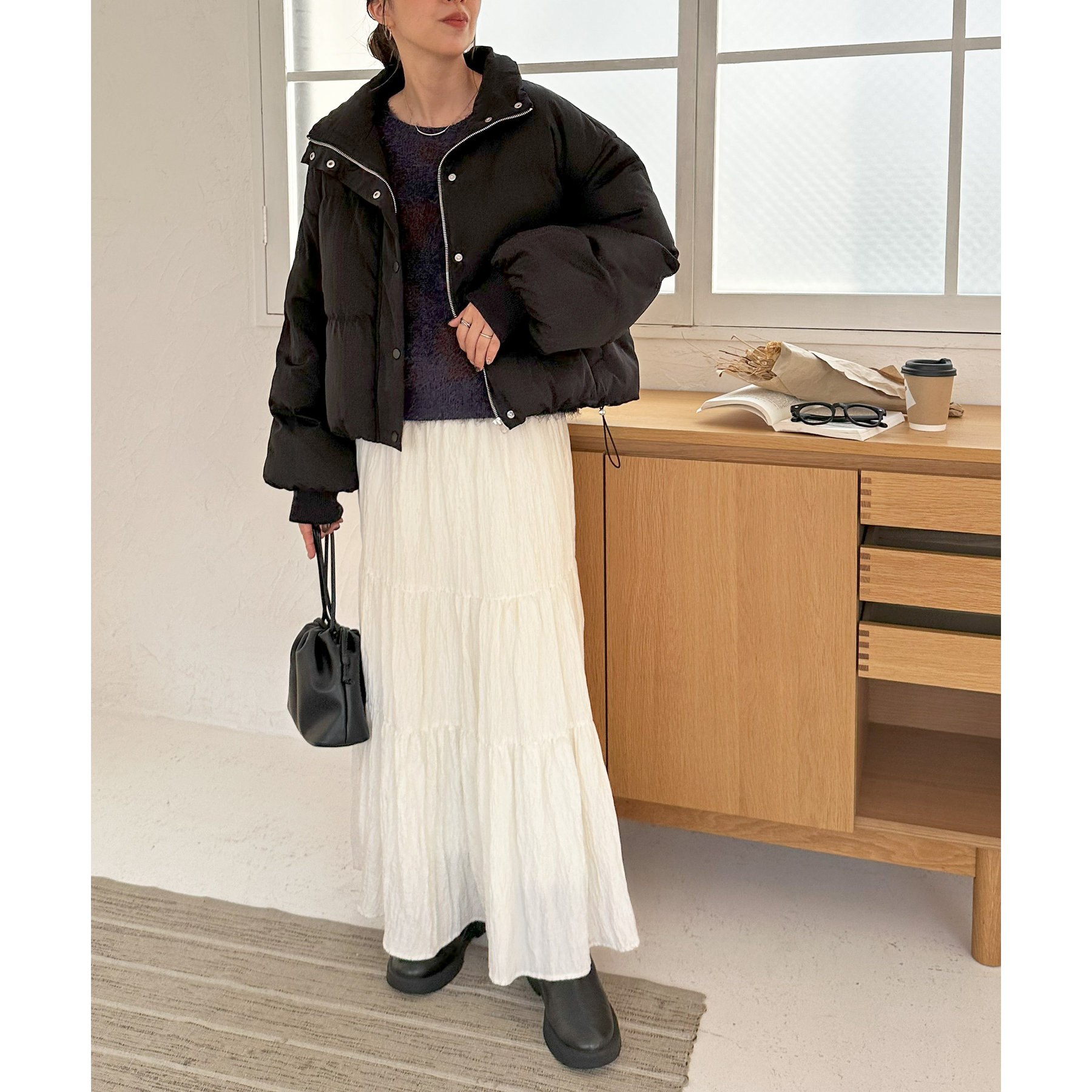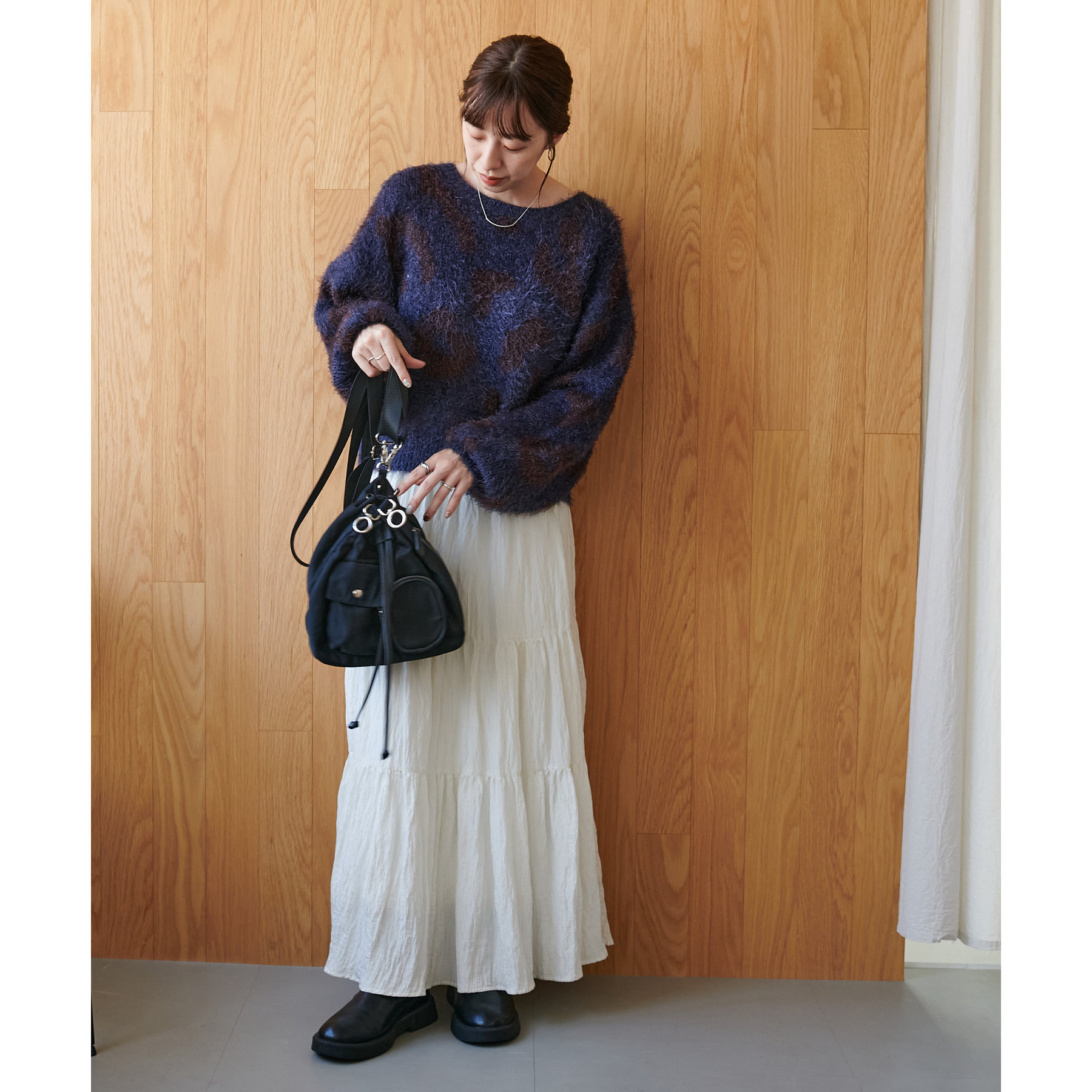 柔らかな生地感なので、スカートと合わせてフェミニンなコーデにも活躍します〇