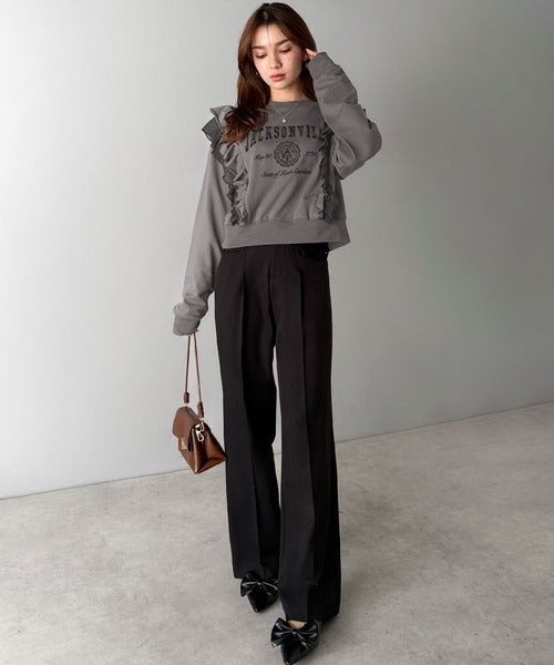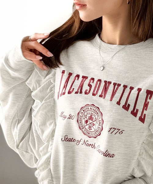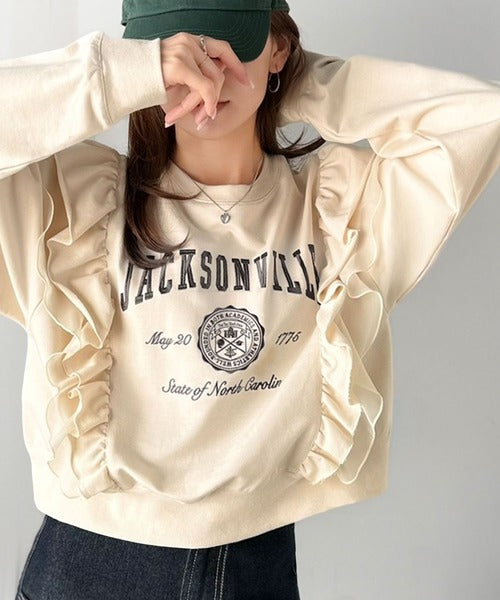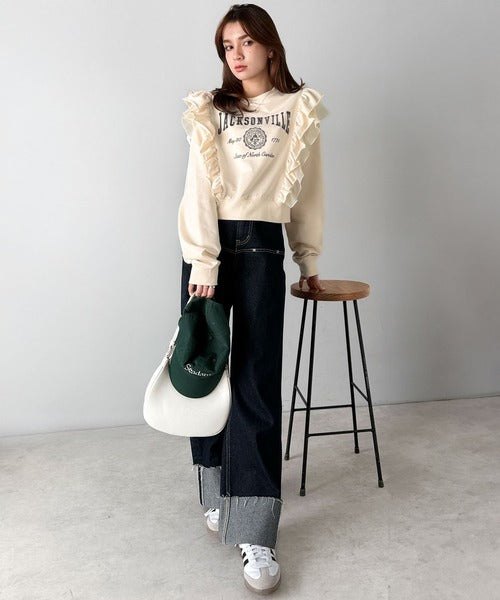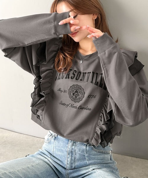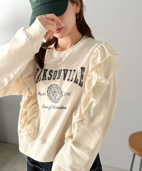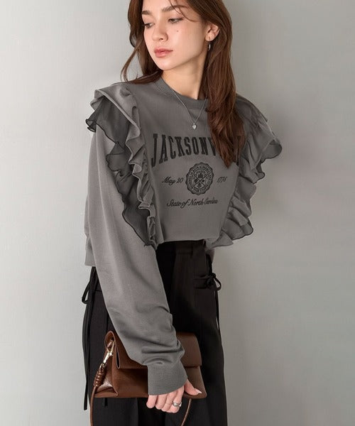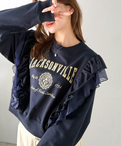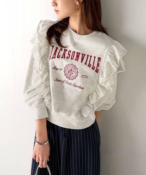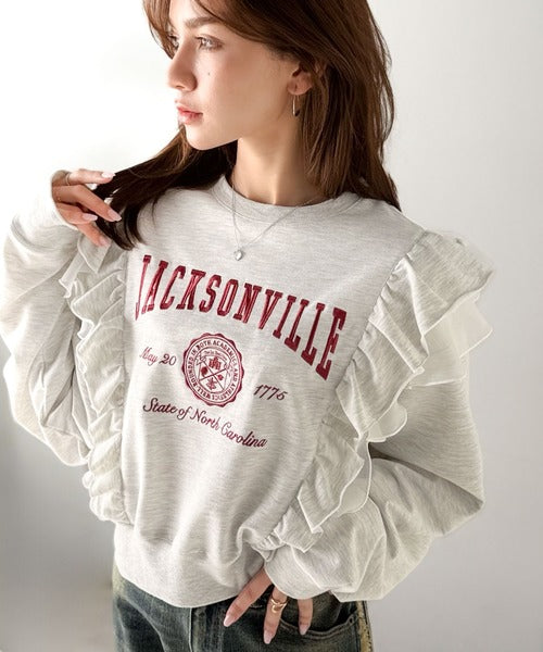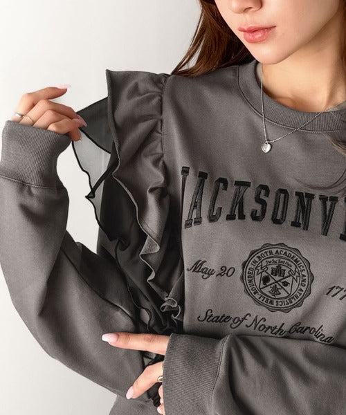 【mily bilet】チュールとフリルで甘く着る。ダブルフリルカレッジロゴ刺繍スウェット mi1329080