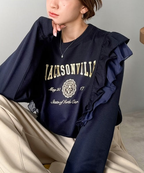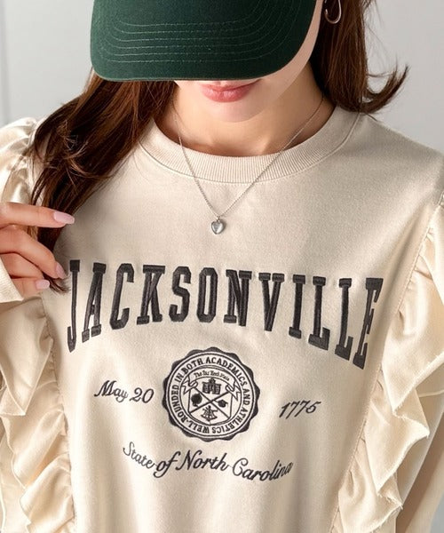 カレッジロゴの刺繍とダブルフリルで、カジュアルさと女性らしさを両立した一着です♪