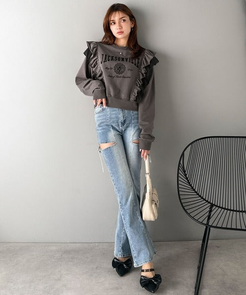 カジュアルなのにフェミニン。ダブルフリルが魅力の柔らかなスウェットトップス。