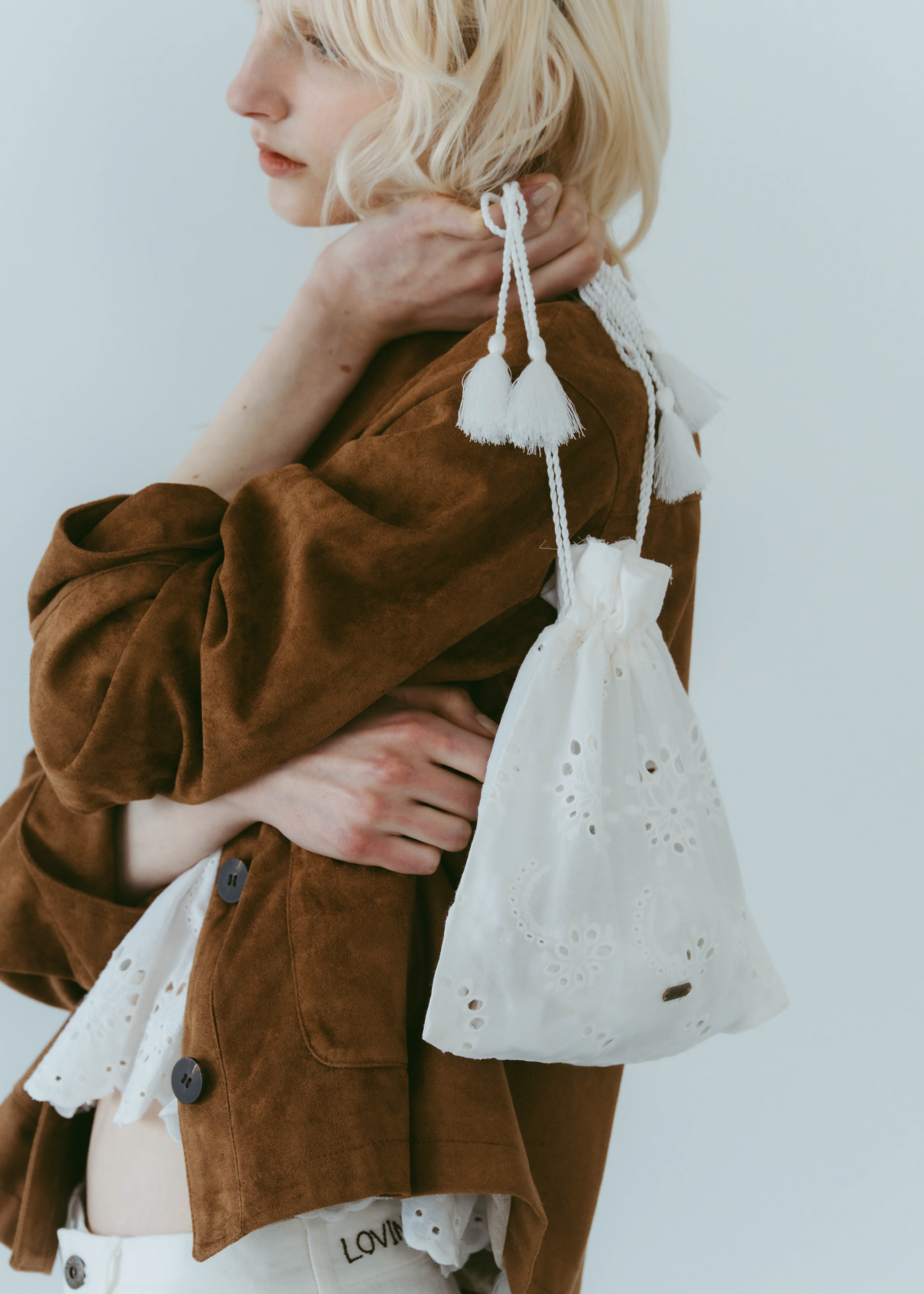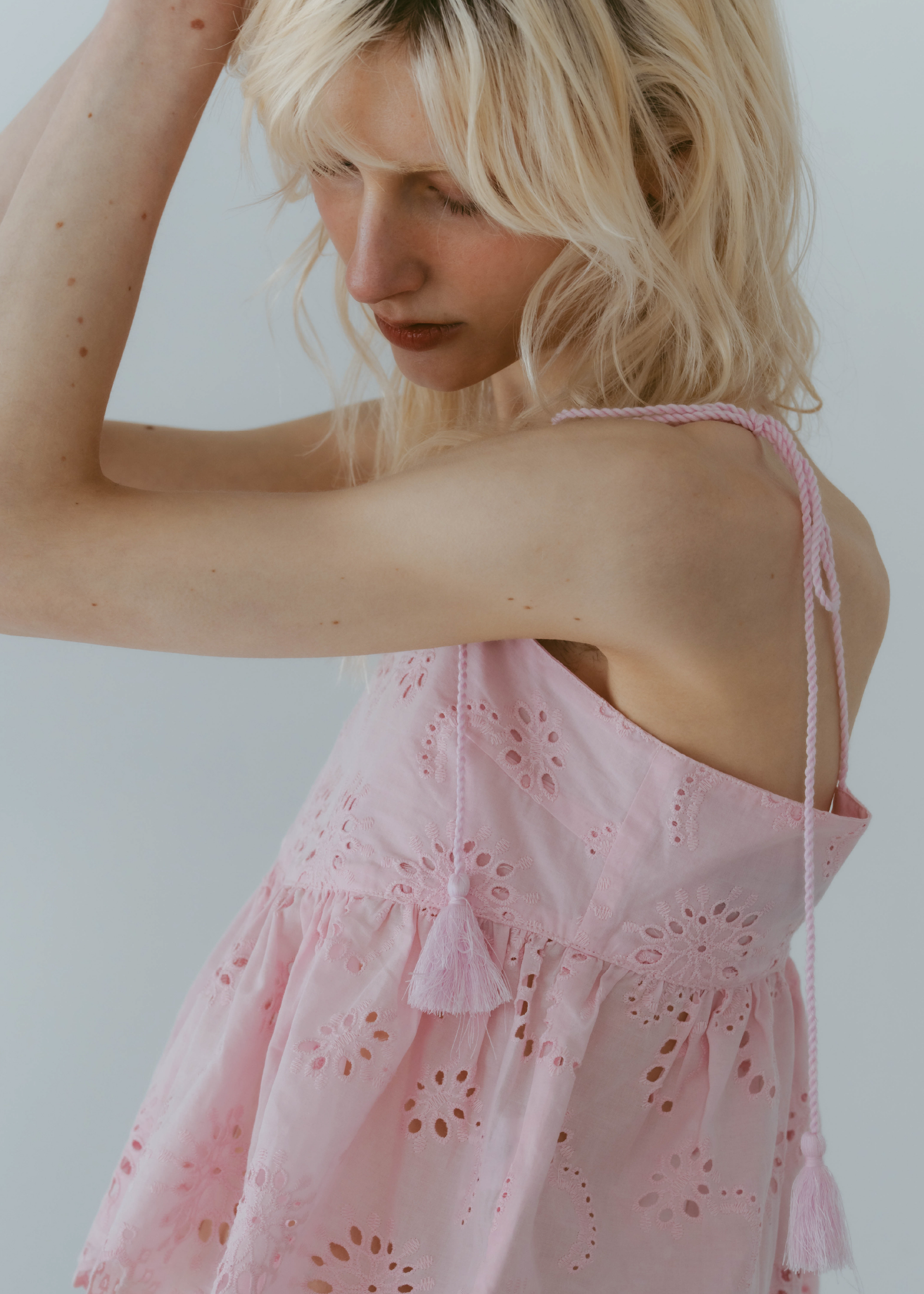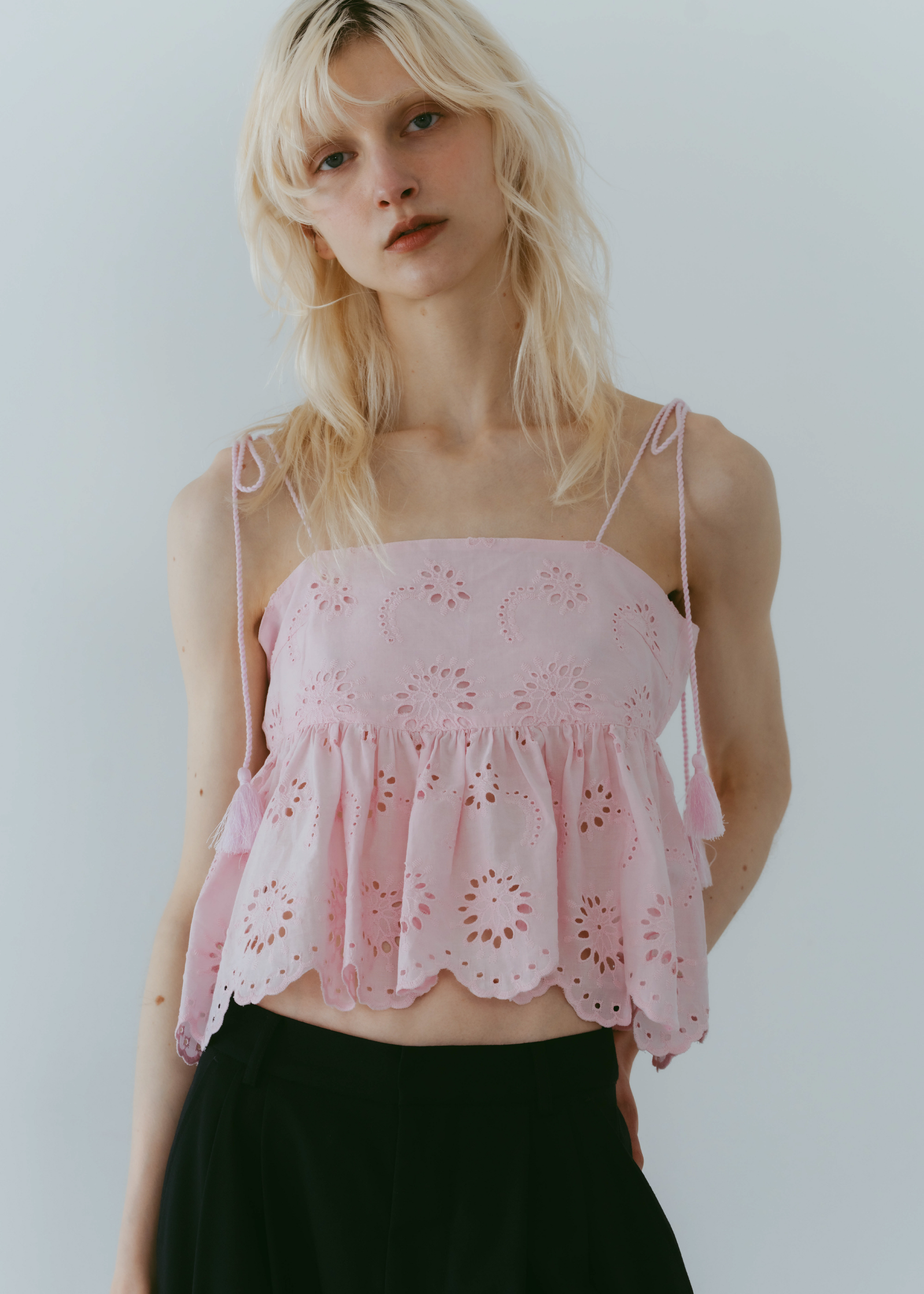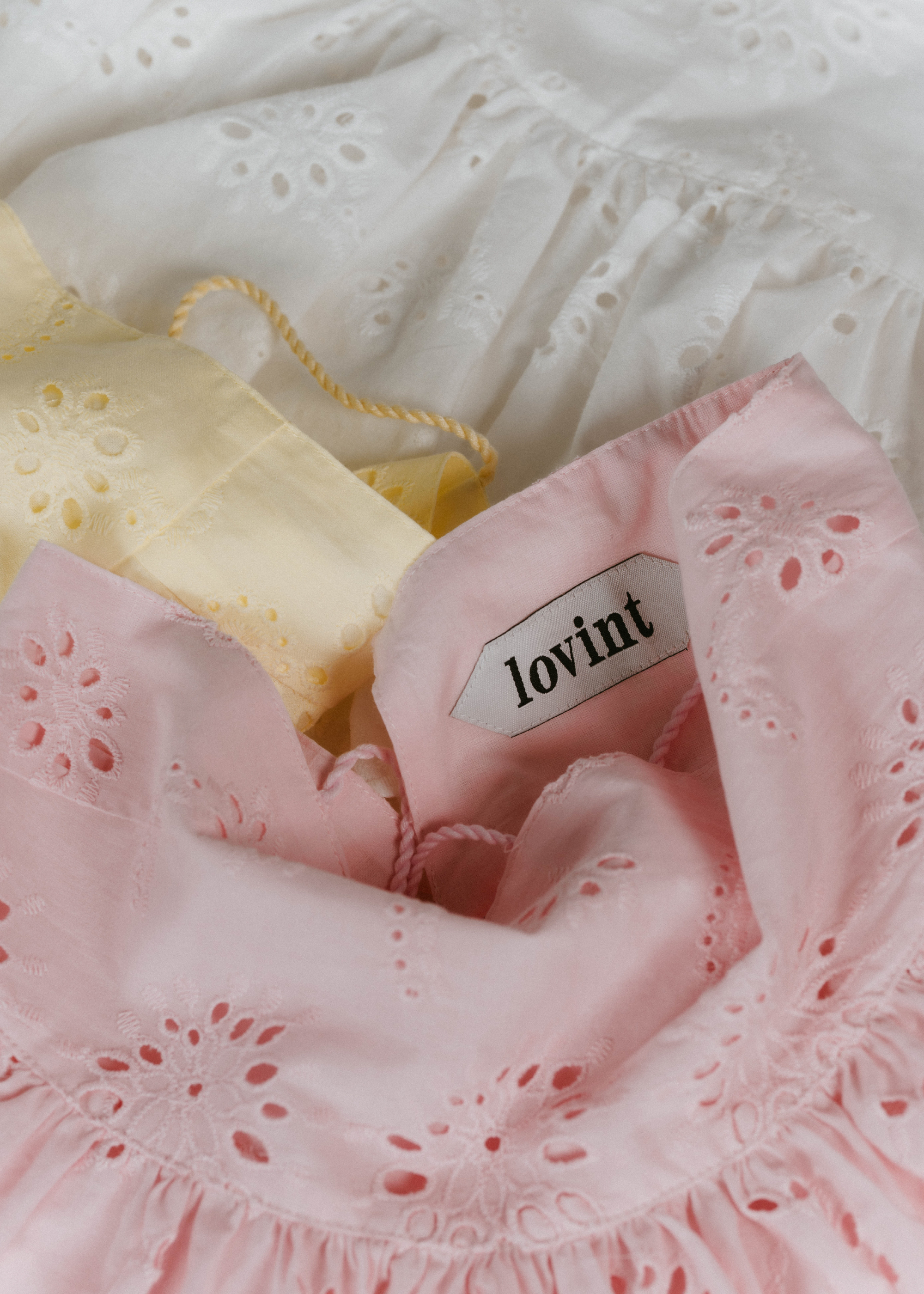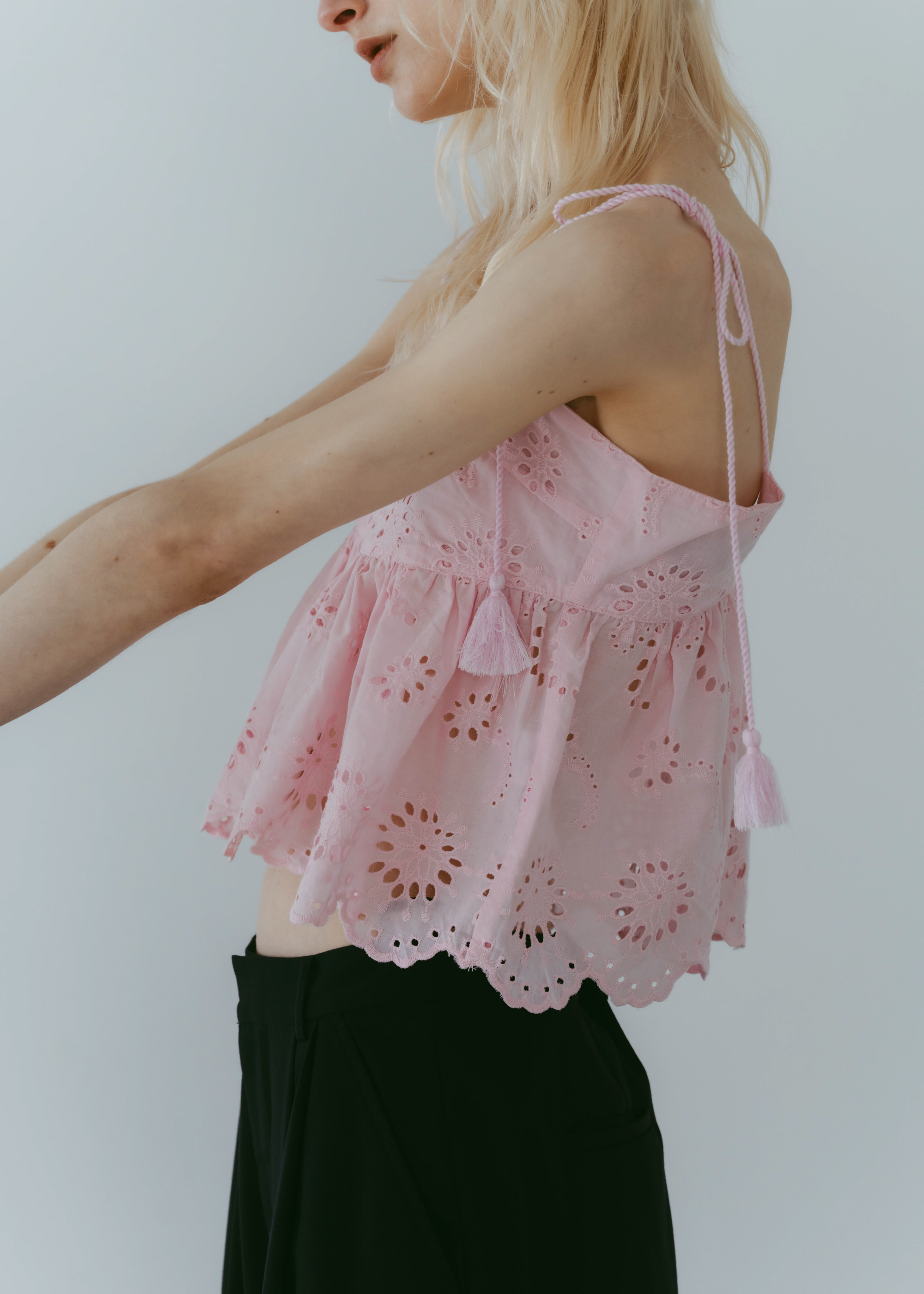 lovintのシグネチャーアイテム EMBRROIDERY CAMISOLE 共生地で作られたポーチとSETでの販売となります。 ※キャミソール単品での販売はございません。 BINK/YELLOWは生地から丁寧に染め上げられ 刺繍生地ならではの表情を生み出します。 キャミソールには生地端からしか取ることの出来ない スカラップを贅沢に使い、主役になるトップスです。 フリンジ付きのストラップは色々な着方でお楽しみいただけます。 クロスしたり、後ろで括ったり、ホルターネックにしたり。