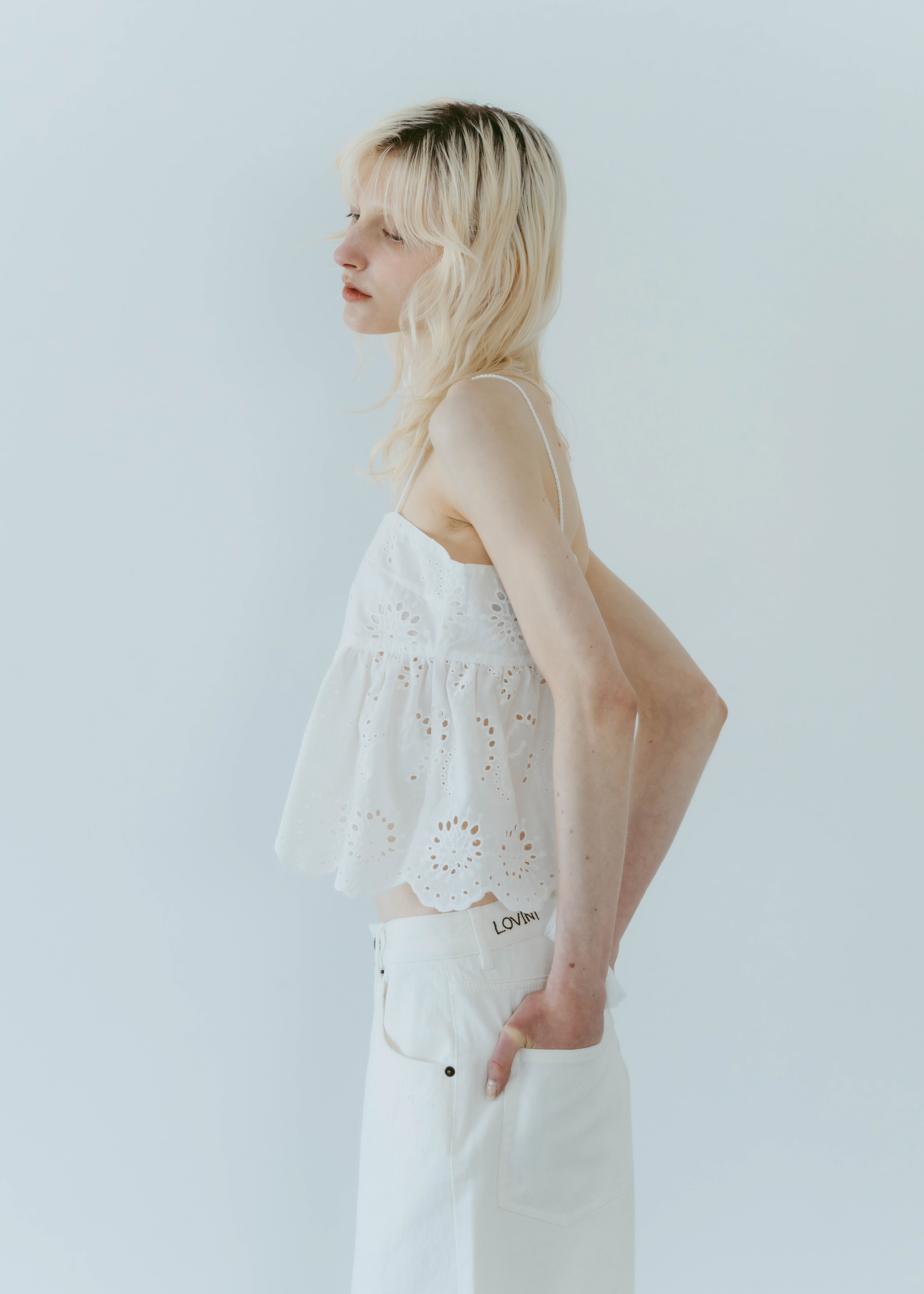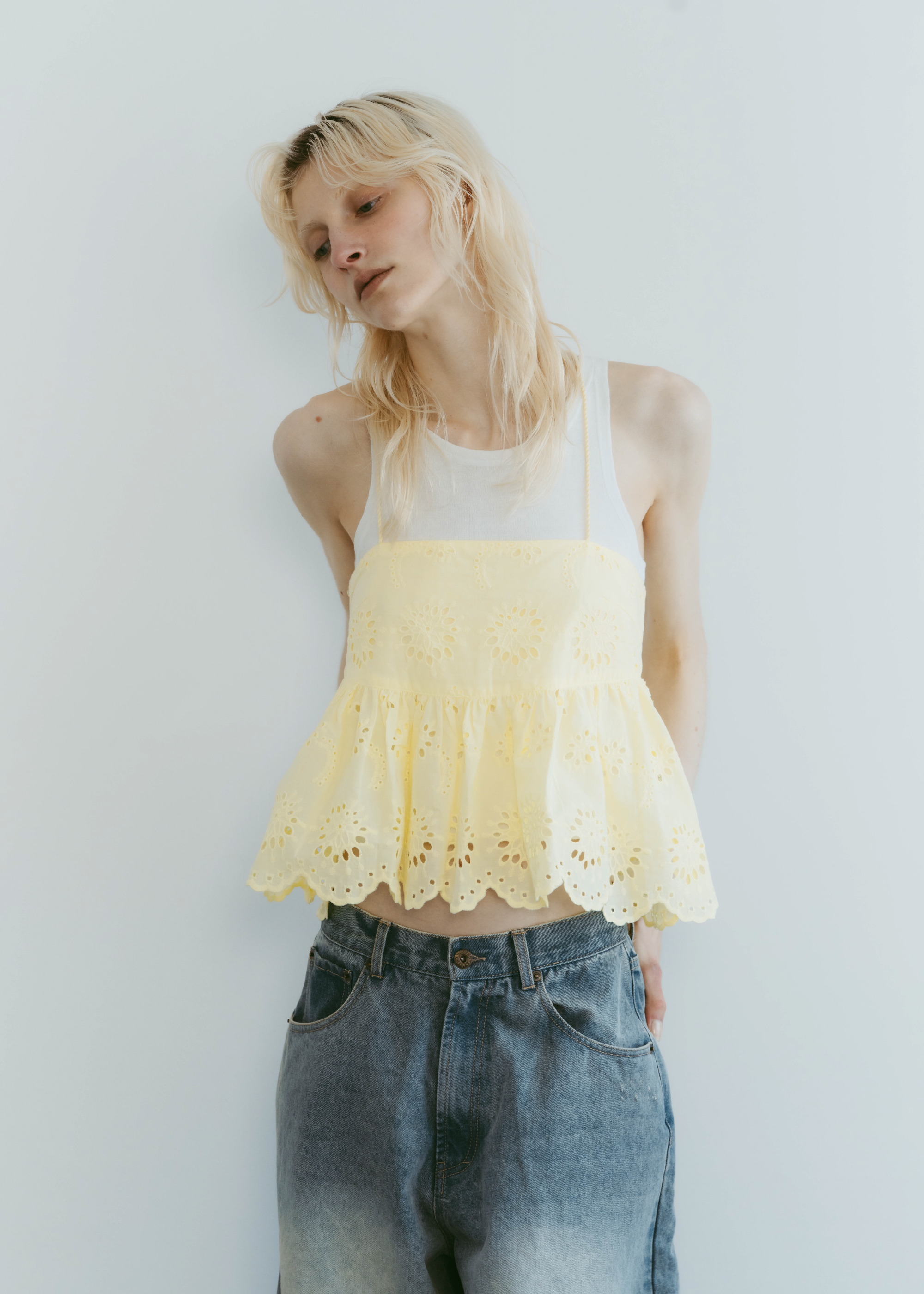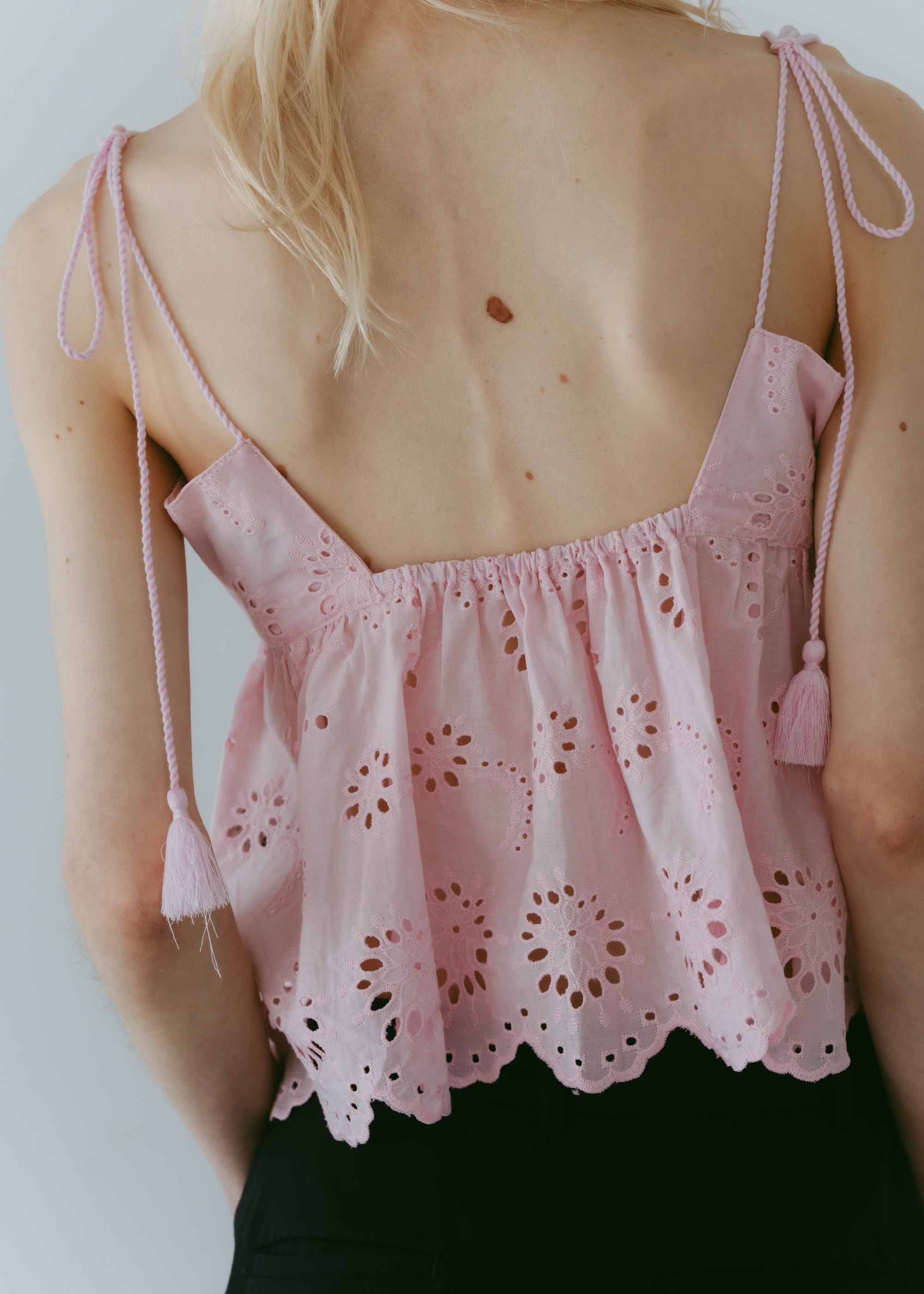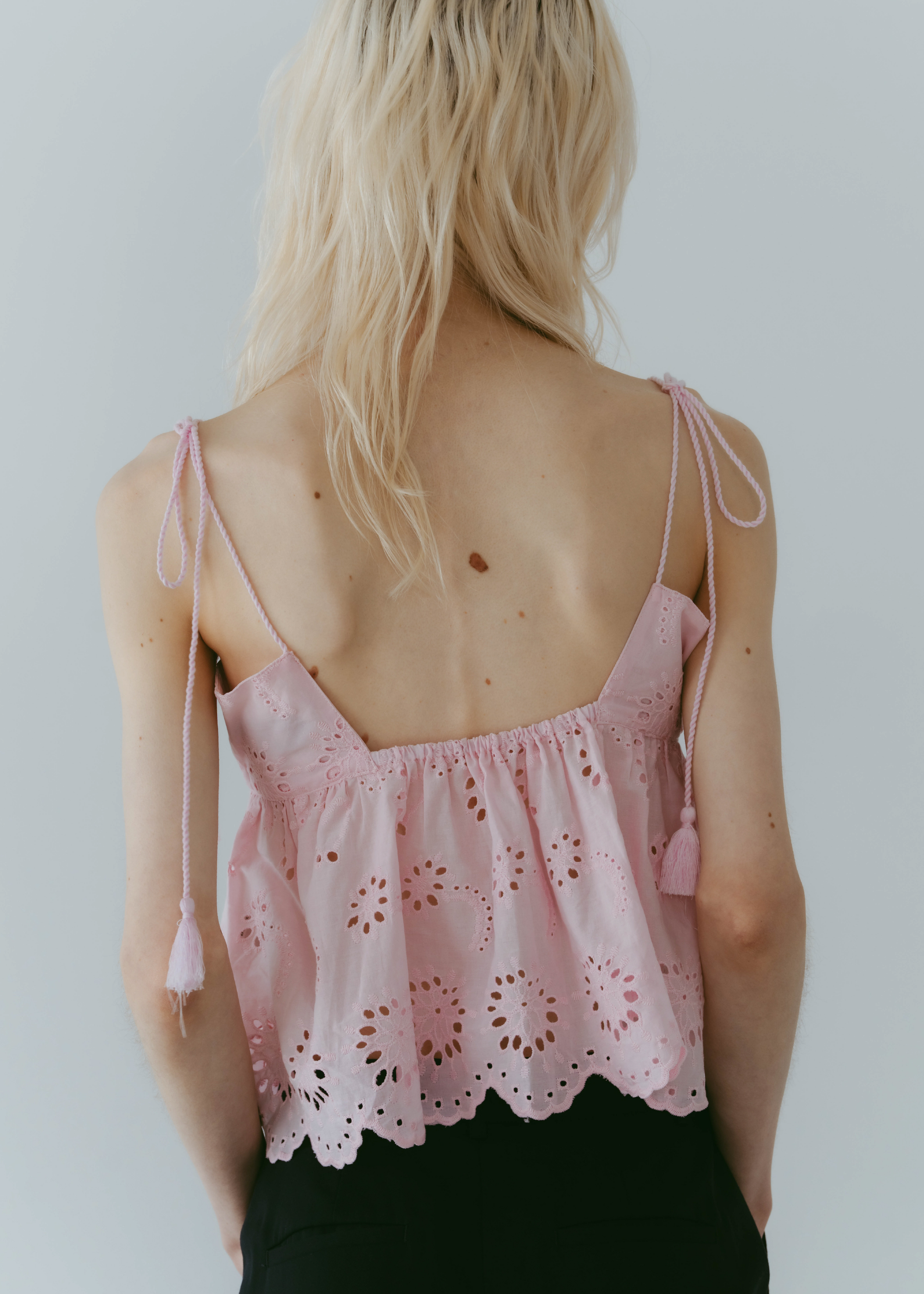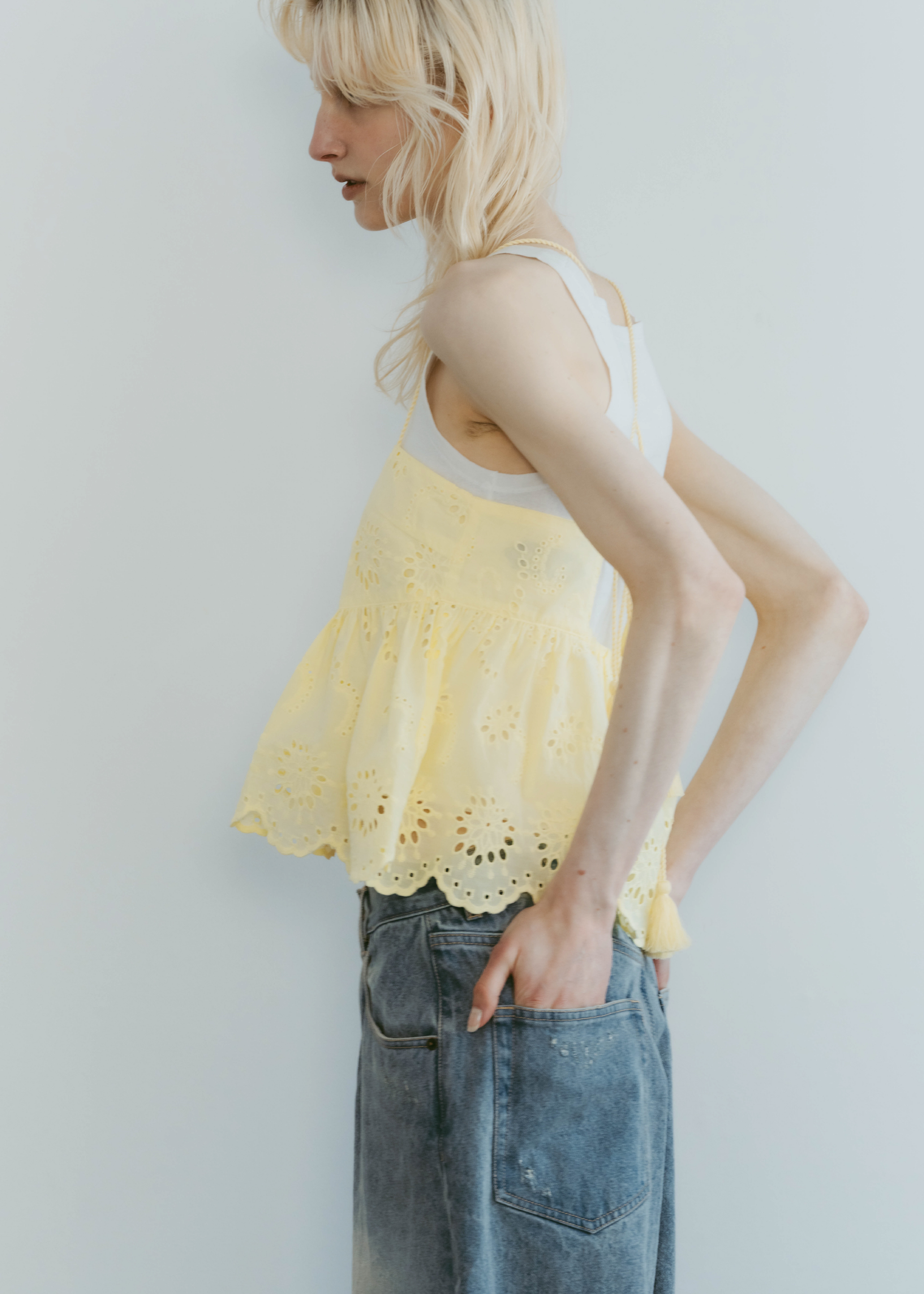 lovintのシグネチャーアイテム EMBRROIDERY CAMISOLE 共生地で作られたポーチとSETでの販売となります。 ※キャミソール単品での販売はございません。 BINK/YELLOWは生地から丁寧に染め上げられ 刺繍生地ならではの表情を生み出します。 キャミソールには生地端からしか取ることの出来ない スカラップを贅沢に使い、主役になるトップスです。 フリンジ付きのストラップは色々な着方でお楽しみいただけます。 クロスしたり、後ろで括ったり、ホルターネックにしたり。