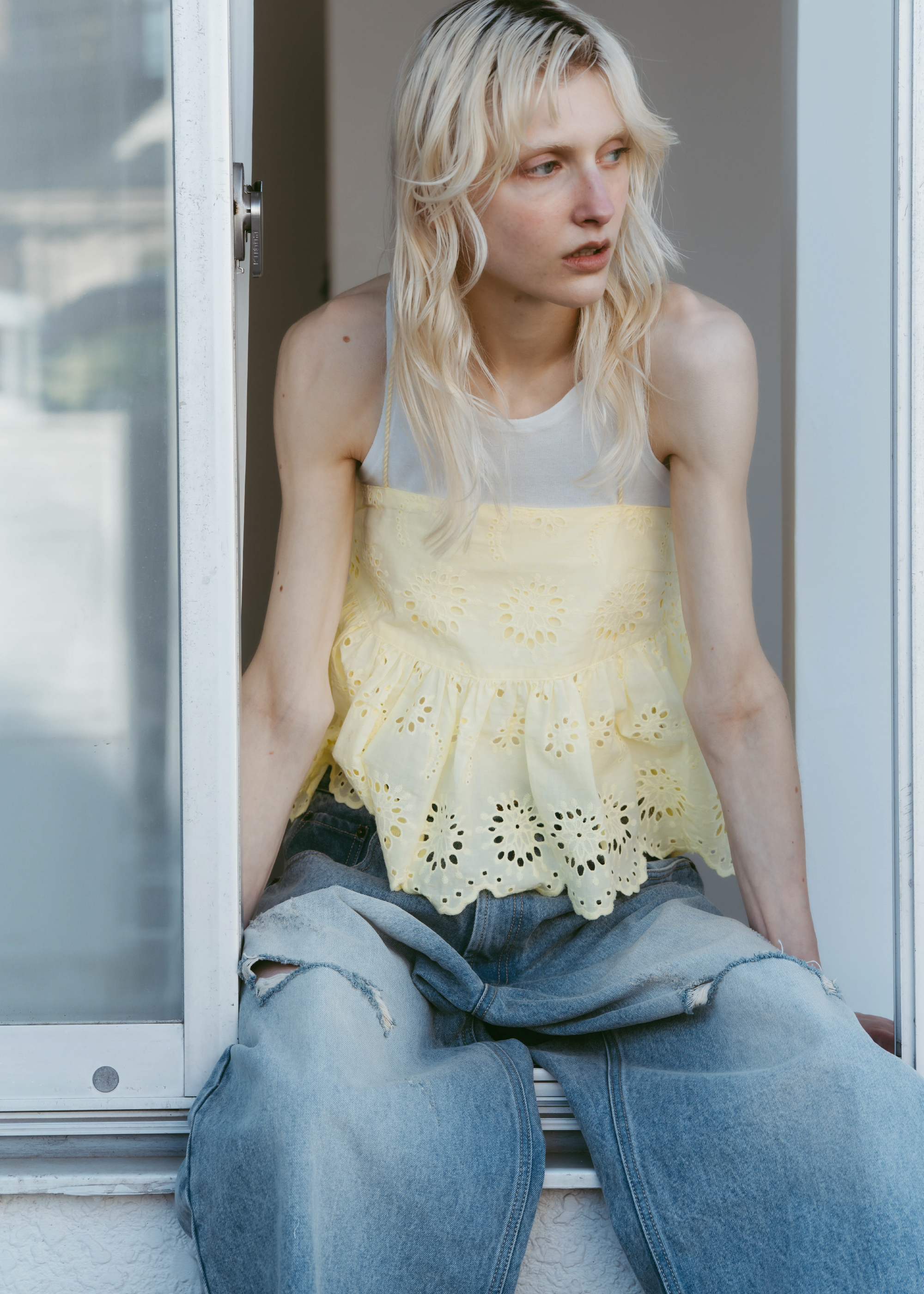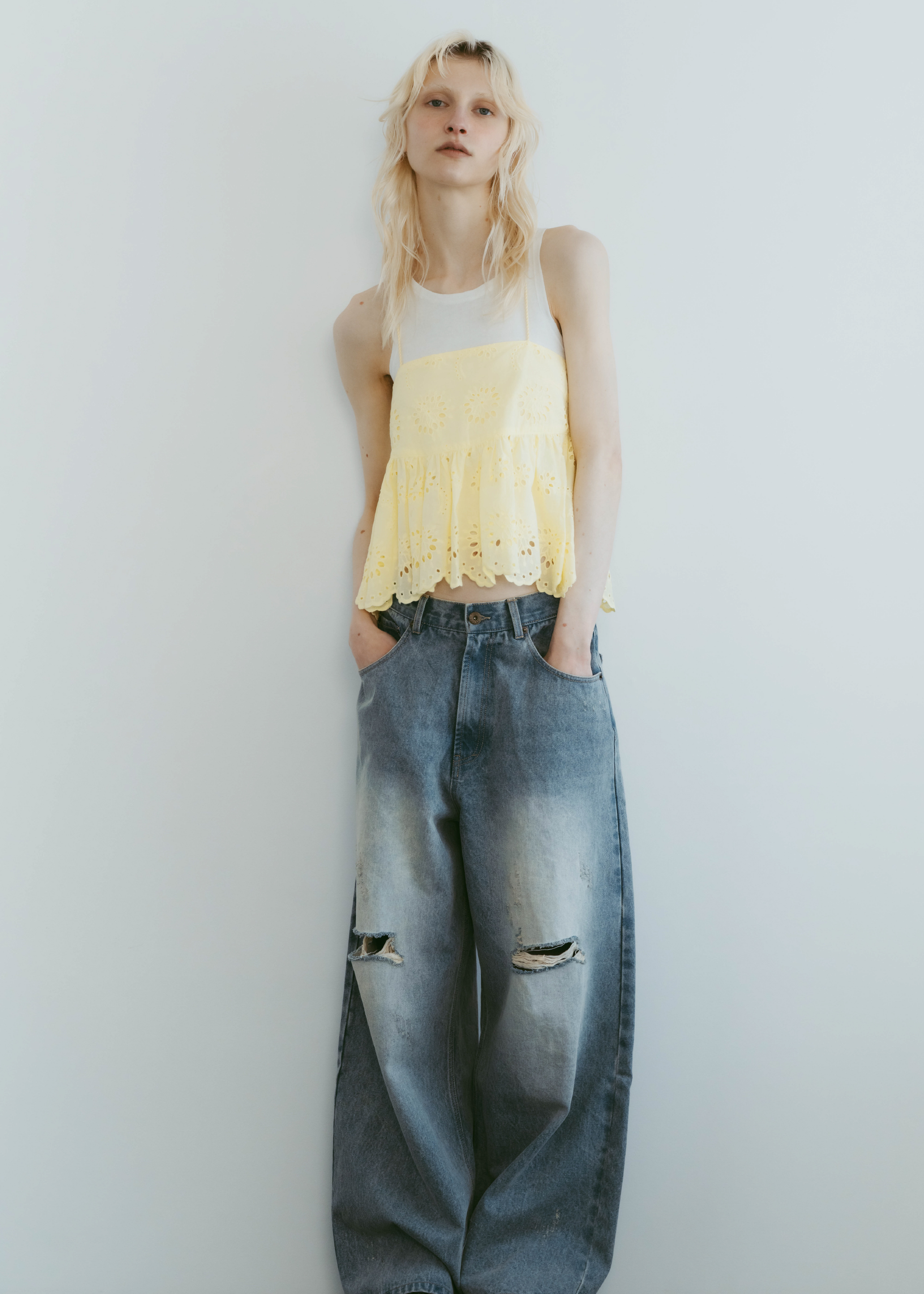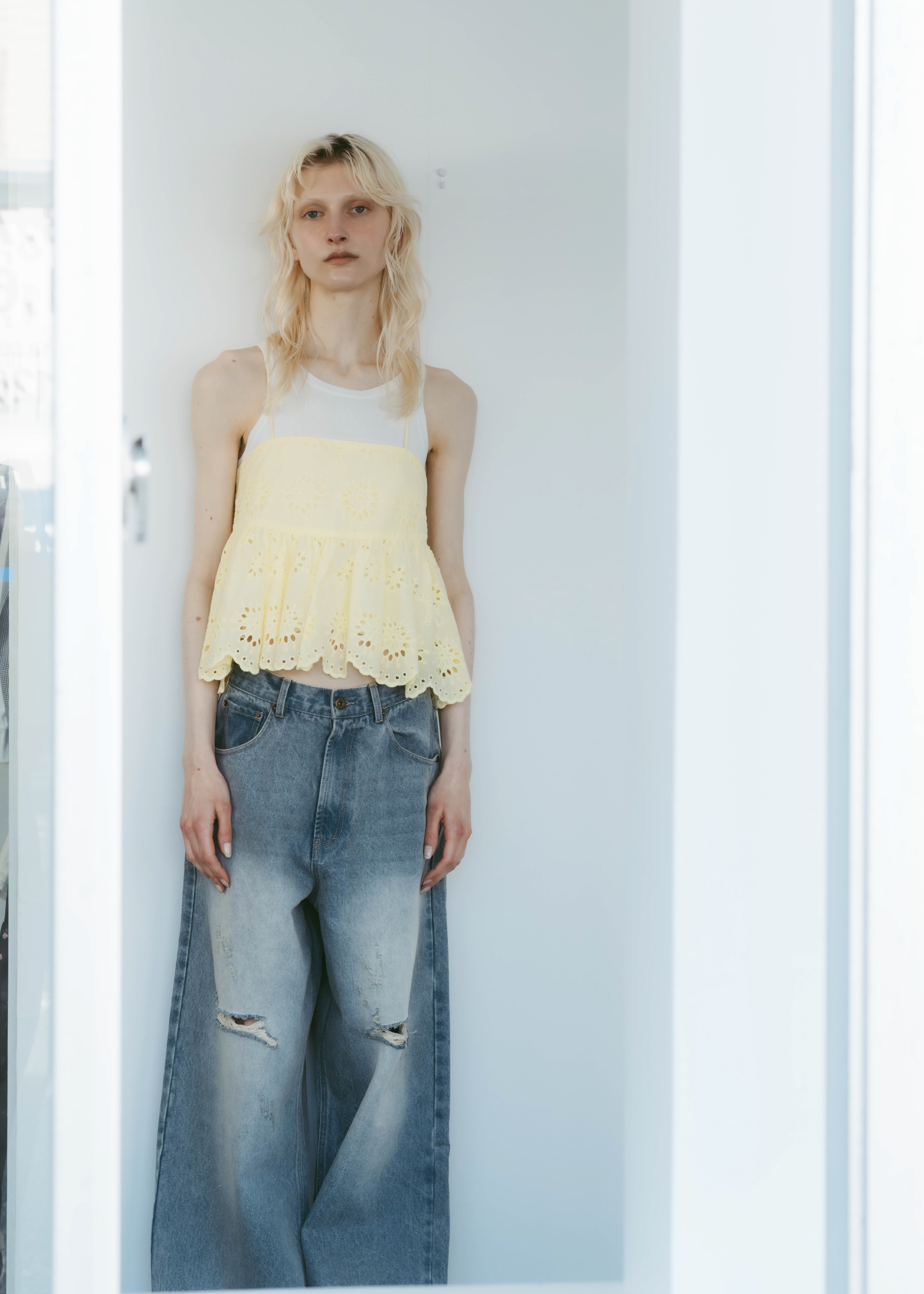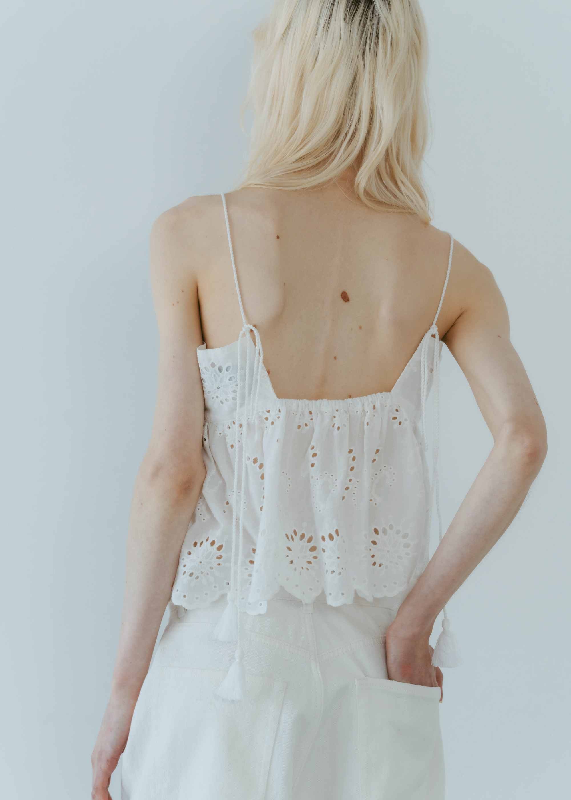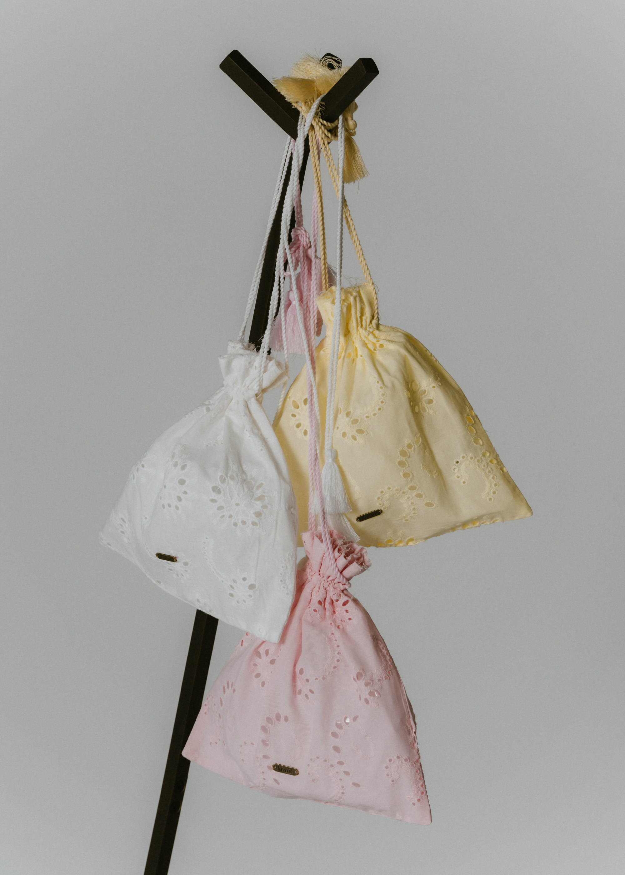 lovintのシグネチャーアイテム EMBRROIDERY CAMISOLE 共生地で作られたポーチとSETでの販売となります。 ※キャミソール単品での販売はございません。 BINK/YELLOWは生地から丁寧に染め上げられ 刺繍生地ならではの表情を生み出します。 キャミソールには生地端からしか取ることの出来ない スカラップを贅沢に使い、主役になるトップスです。 フリンジ付きのストラップは色々な着方でお楽しみいただけます。 クロスしたり、後ろで括ったり、ホルターネックにしたり。