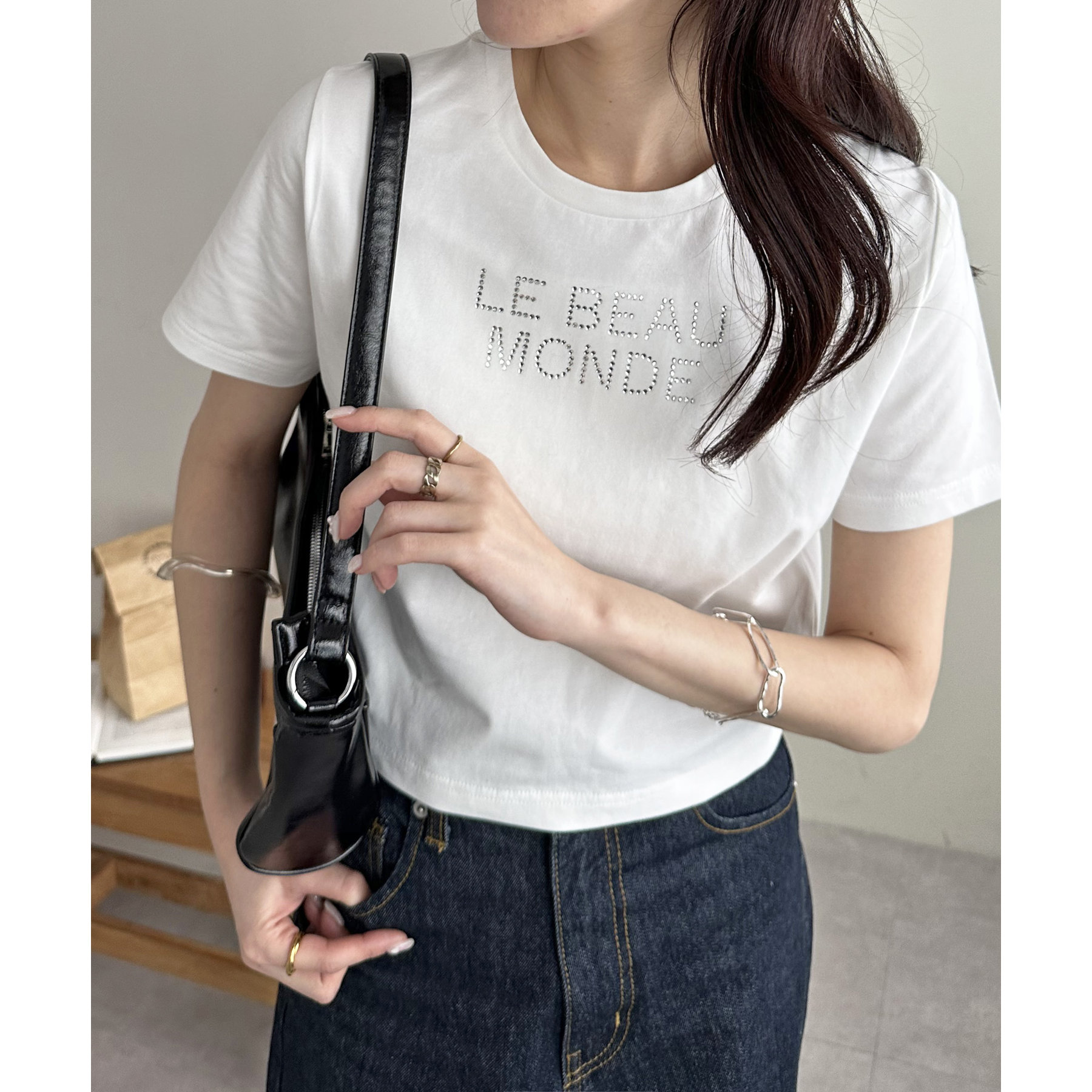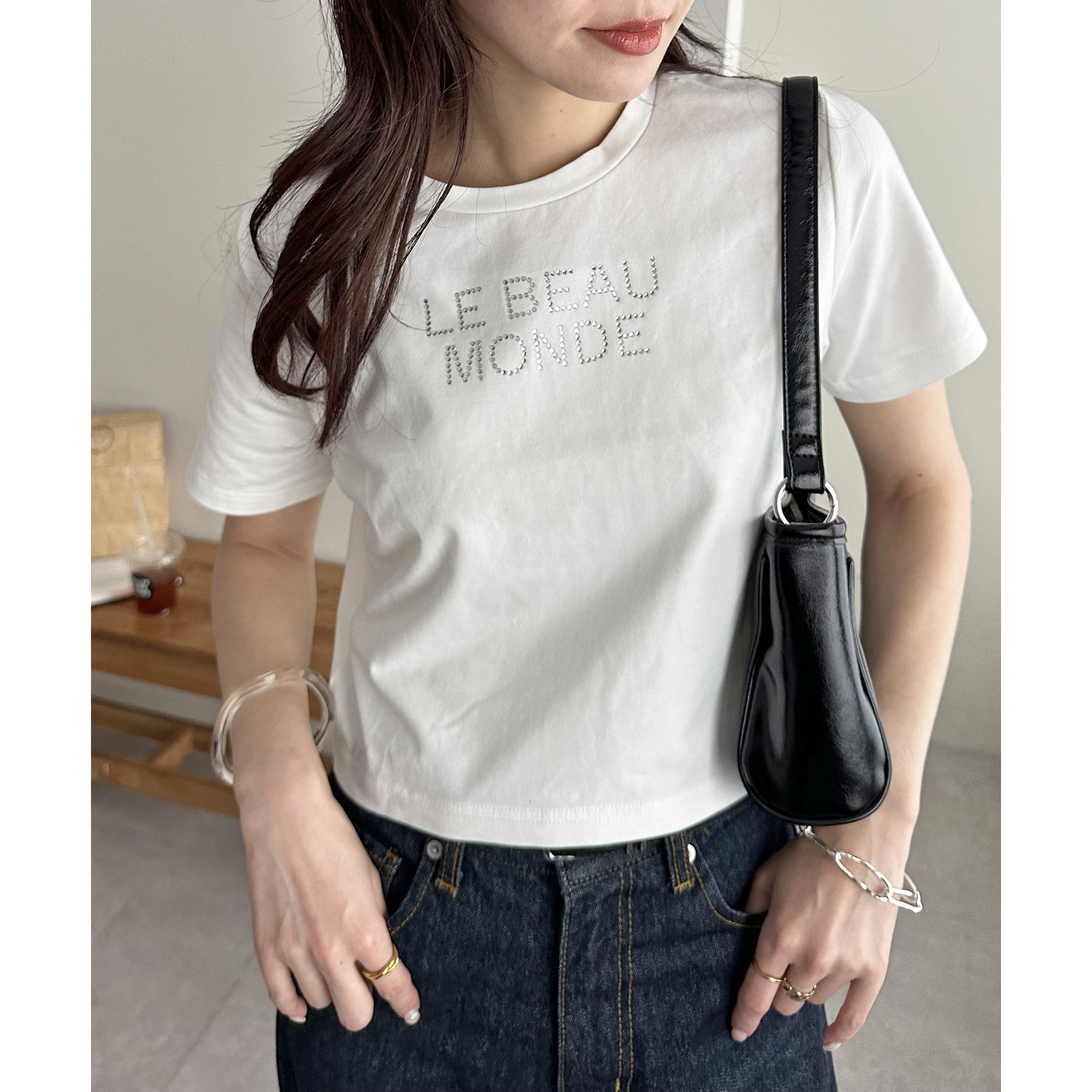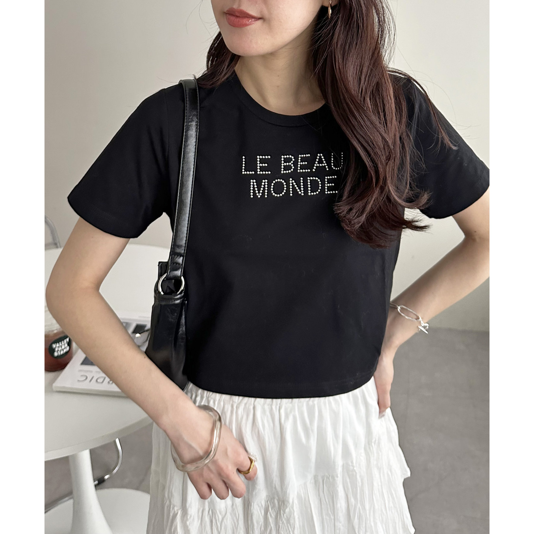 150cmスタッフ:コンパクトなTシャツなので、ボリューム感のあるボトムスと合わせるとメリハリが出ます。
