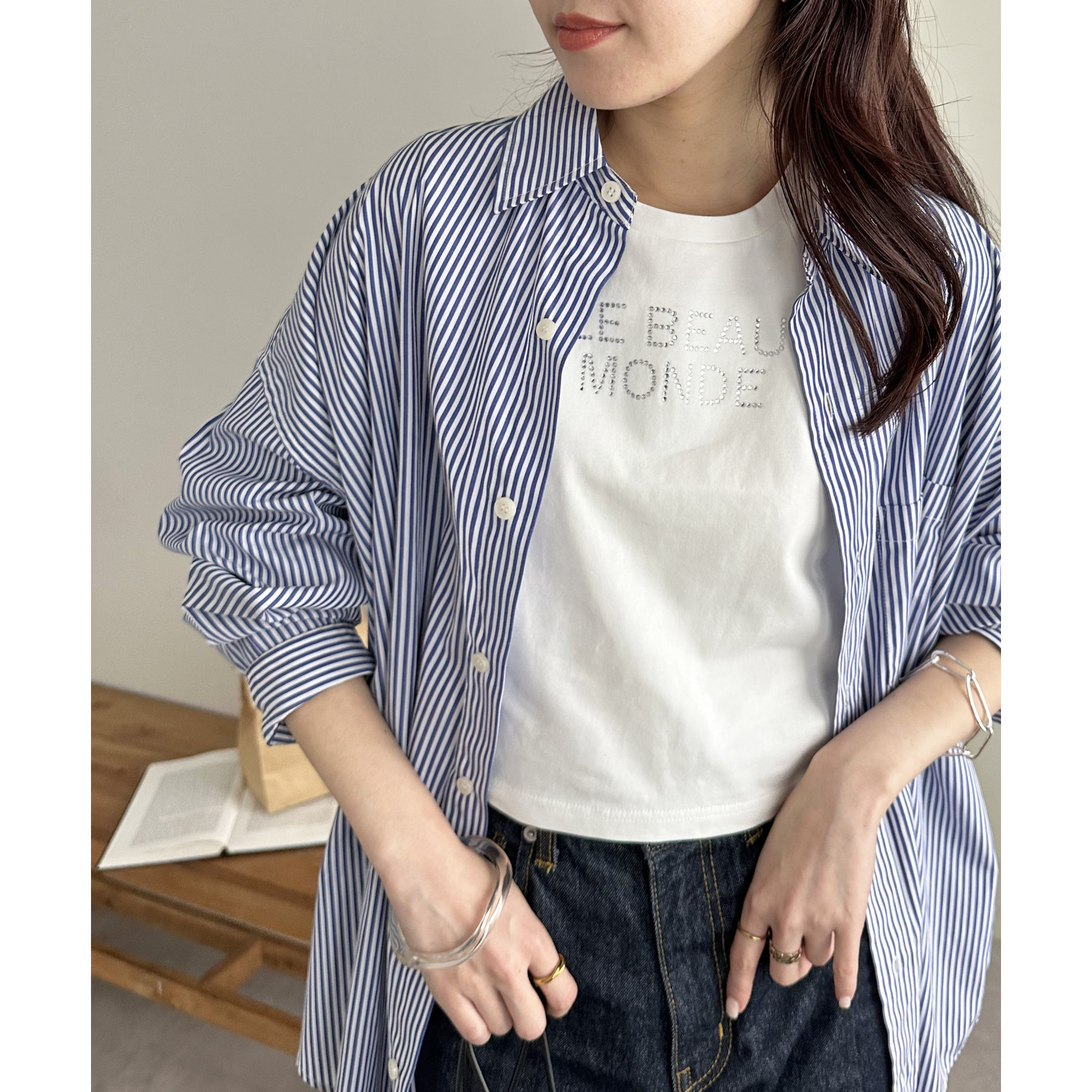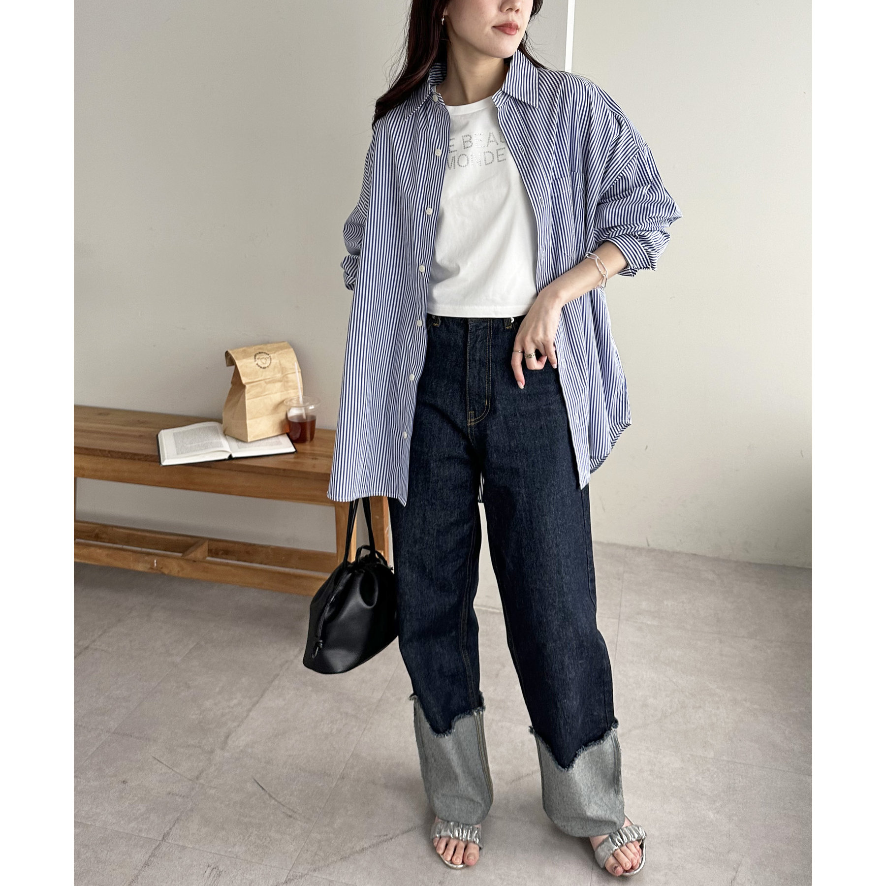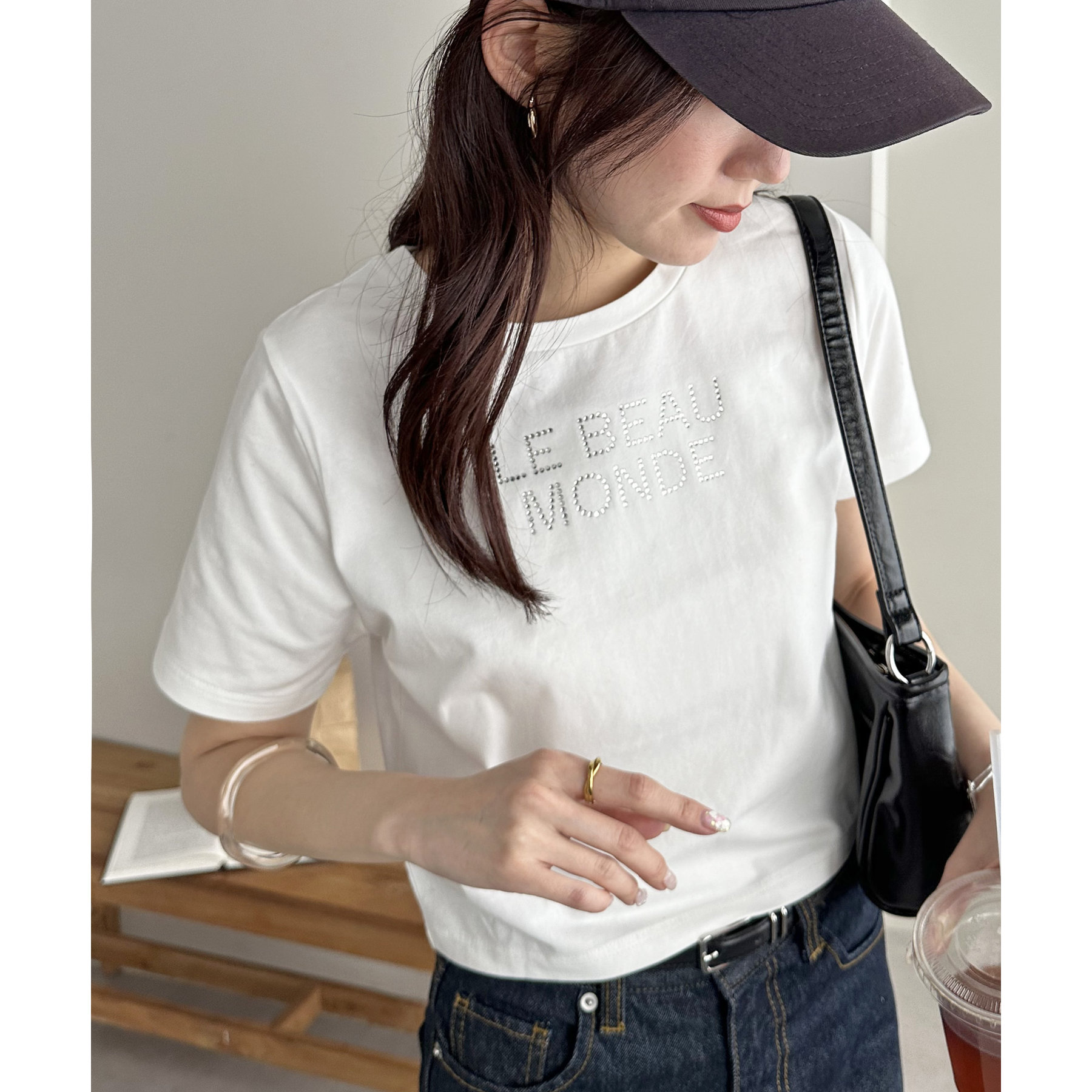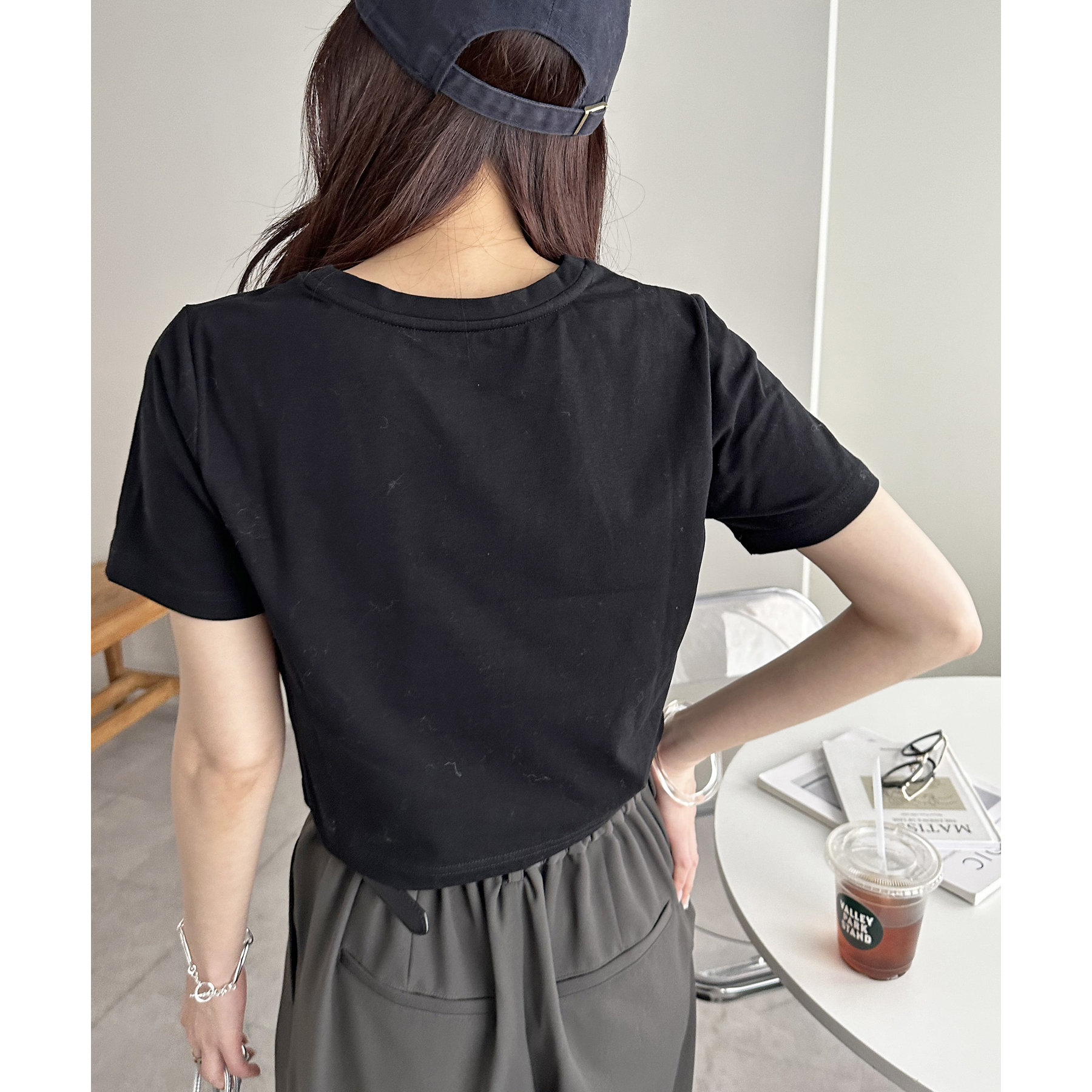 150cmスタッフ:コンパクトなTシャツなので、ボリューム感のあるボトムスと合わせるとメリハリが出ます。