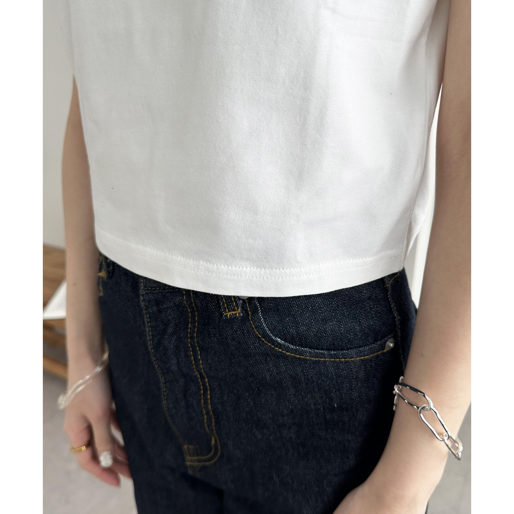 155cmスタッフ:コンパクトなサイズ感なので、ジャケットやシャツのインナーにいれてもごわつきにくく合わせやすいです〇