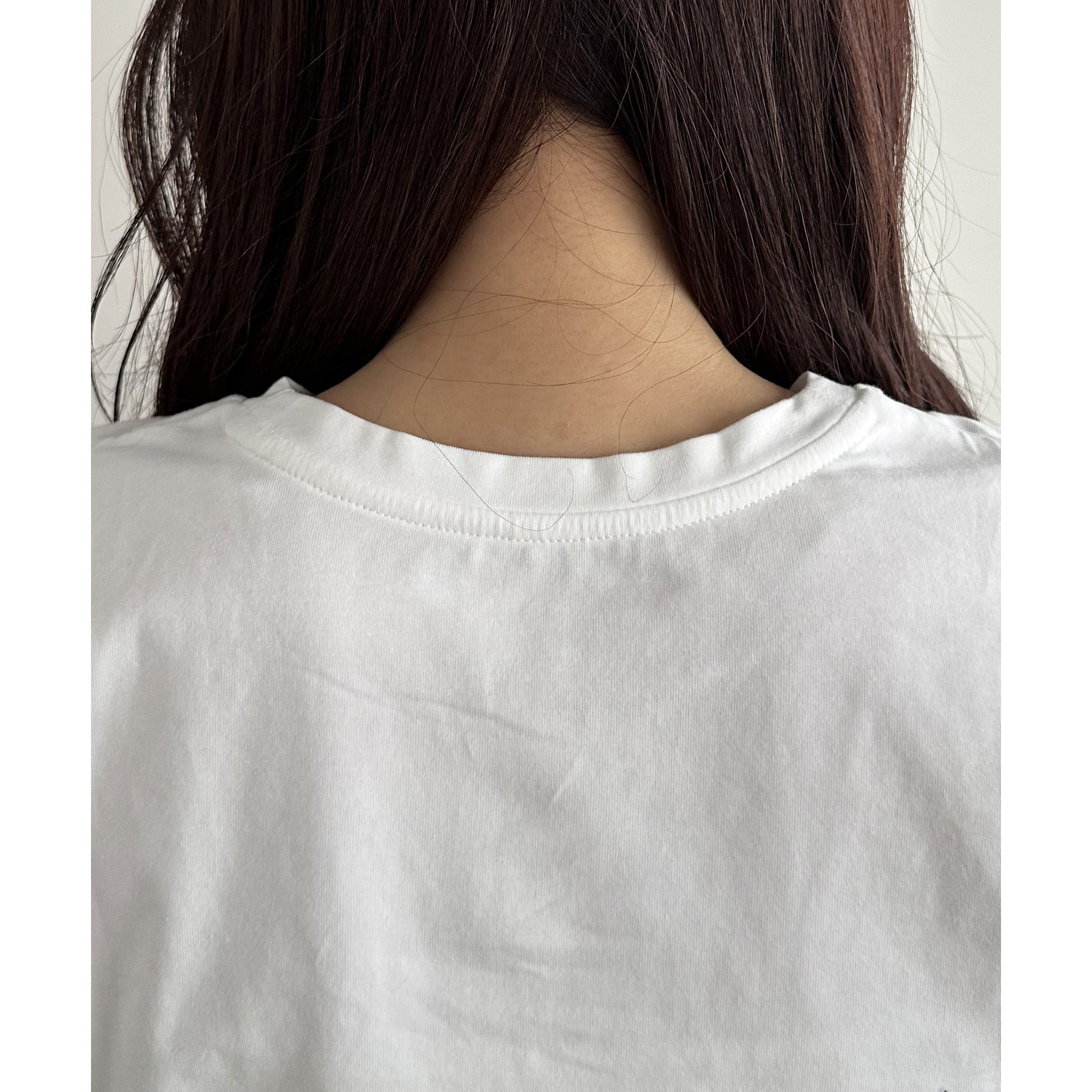 ロゴの部分を胸元よりやや上にしたことで目線が上がり、キャミワンピースやサロペットのインナーに合わせても隠れにくくなっています〇