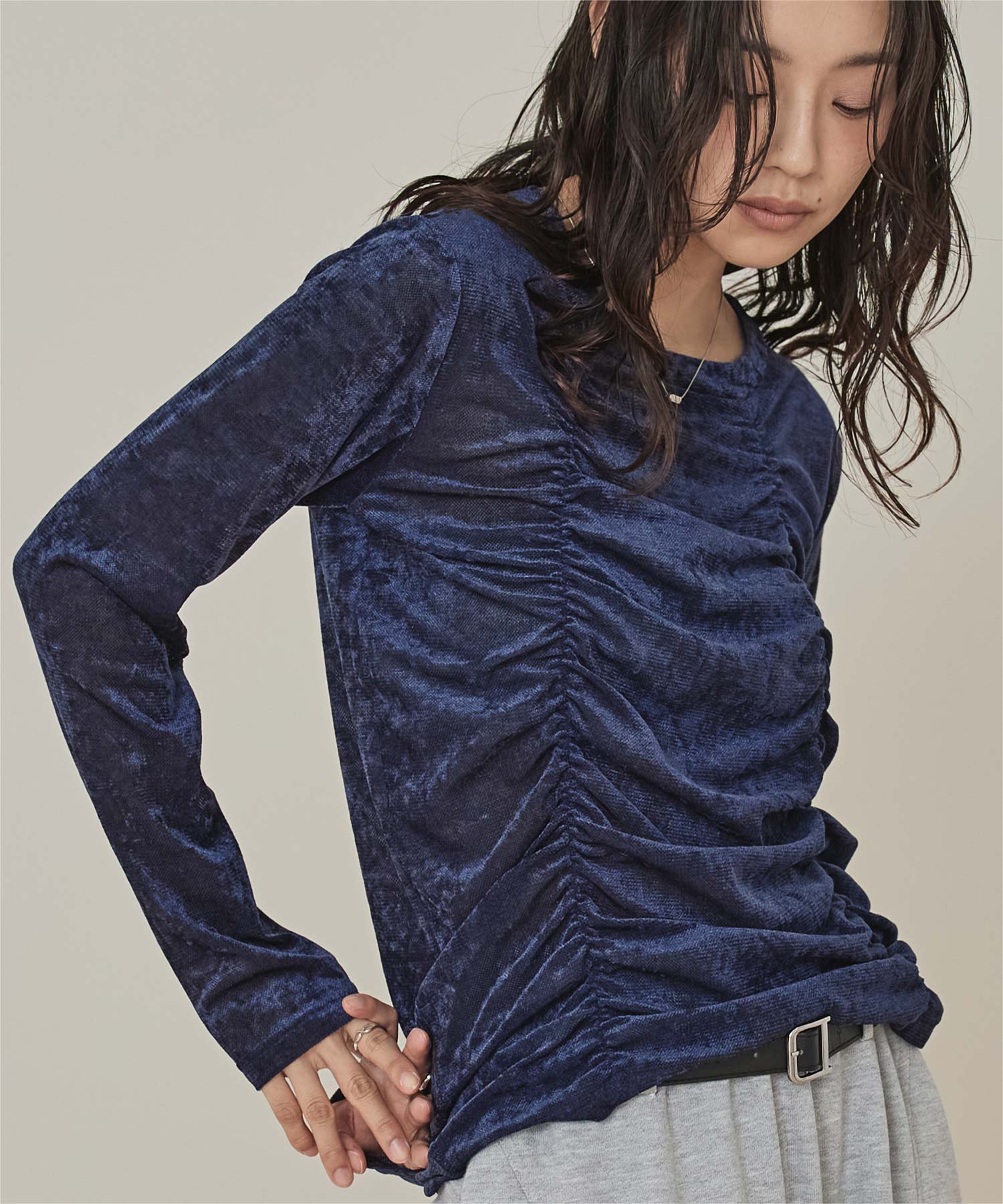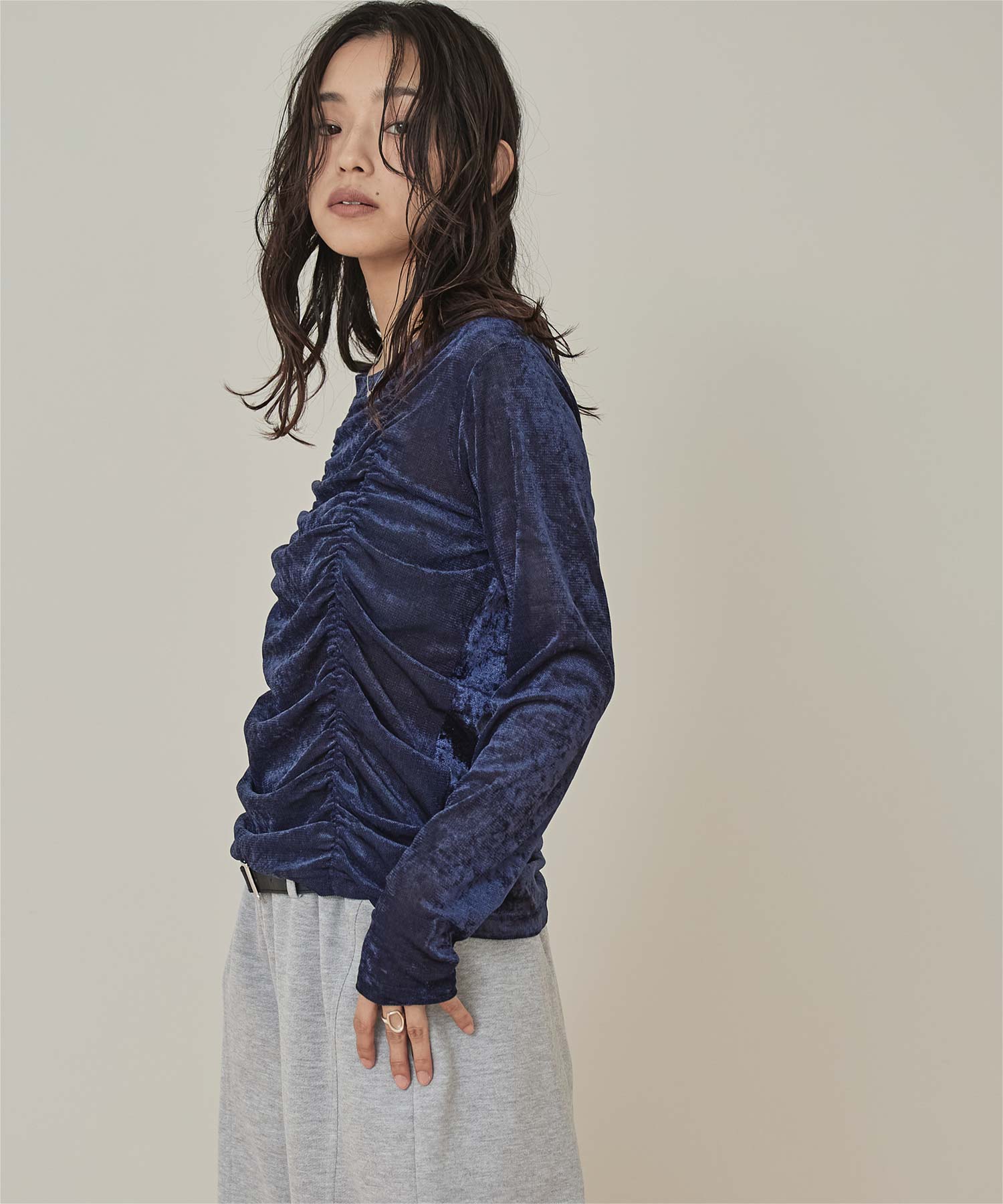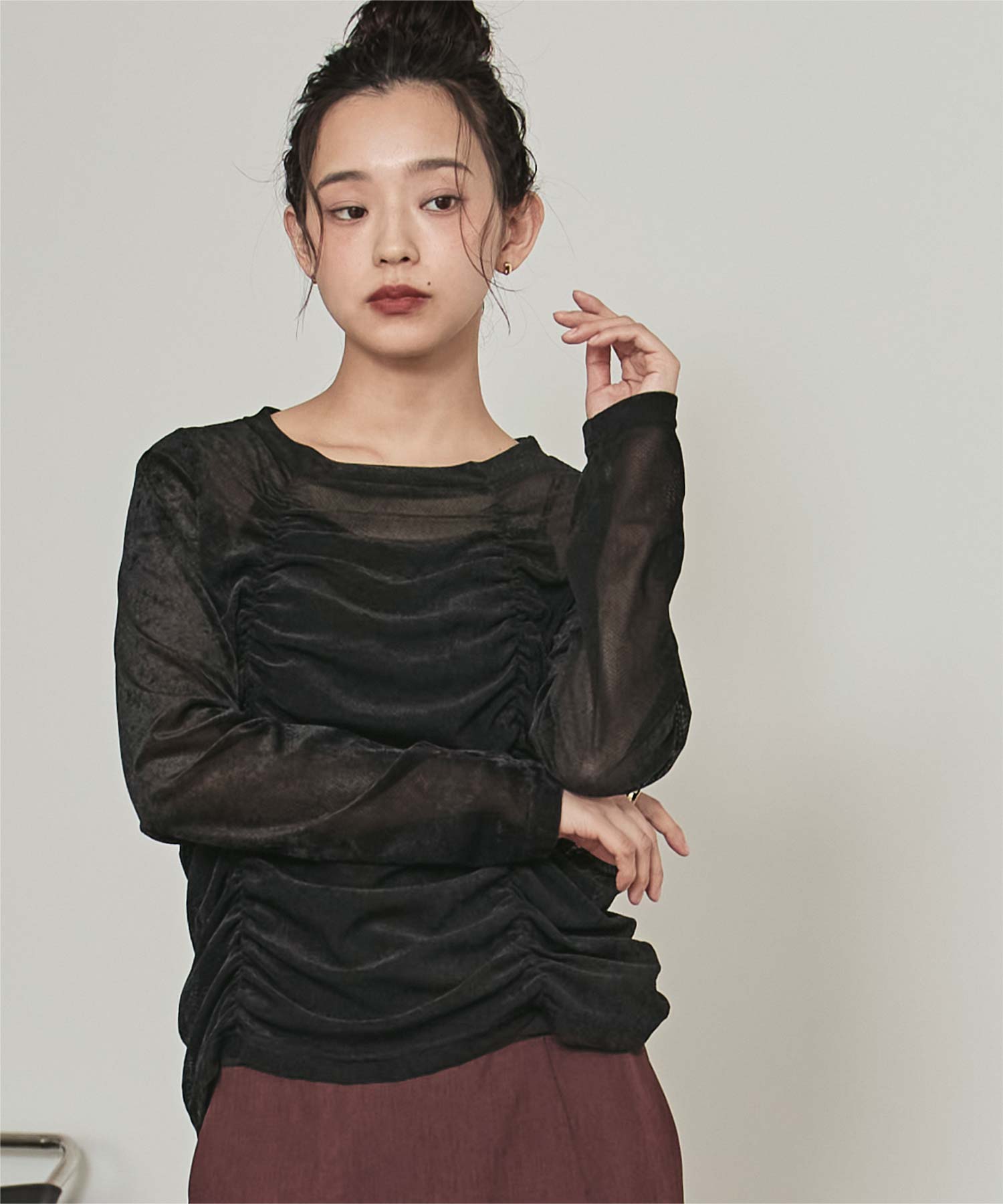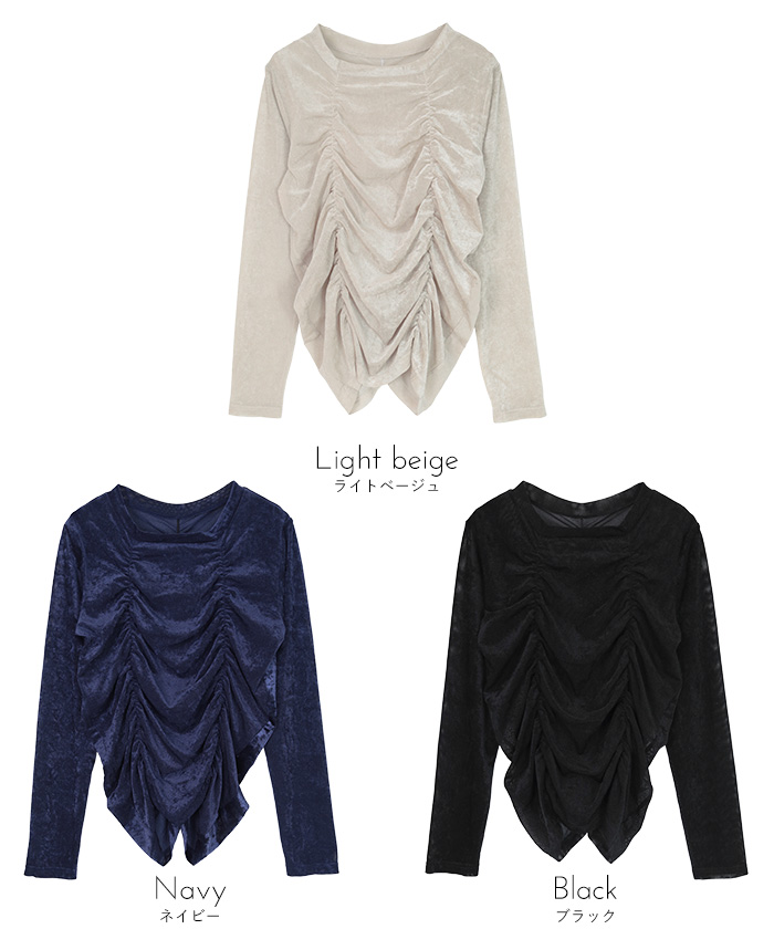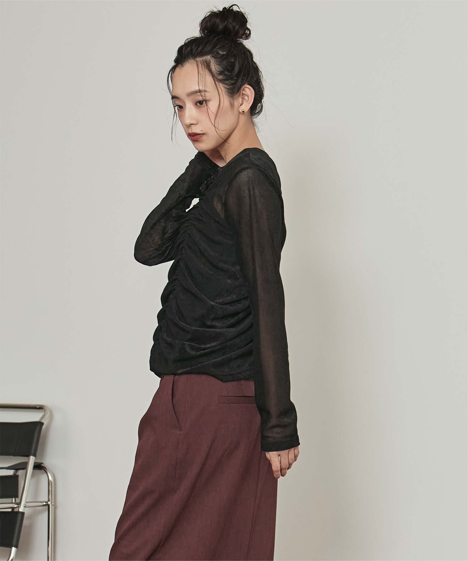 ・長めの袖とサイドギャザーがポイントのデザイントップス