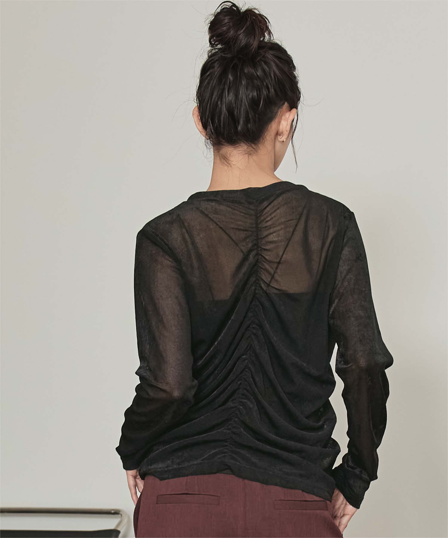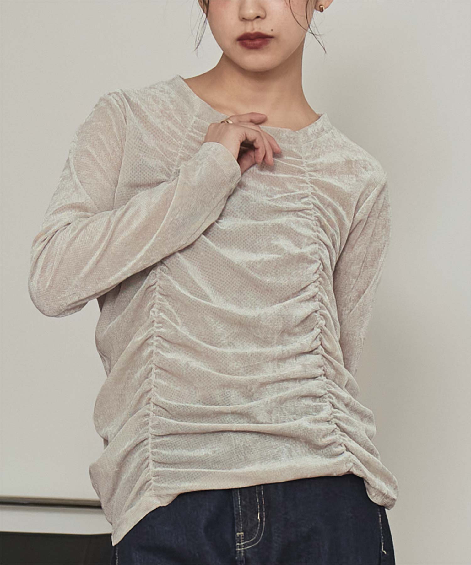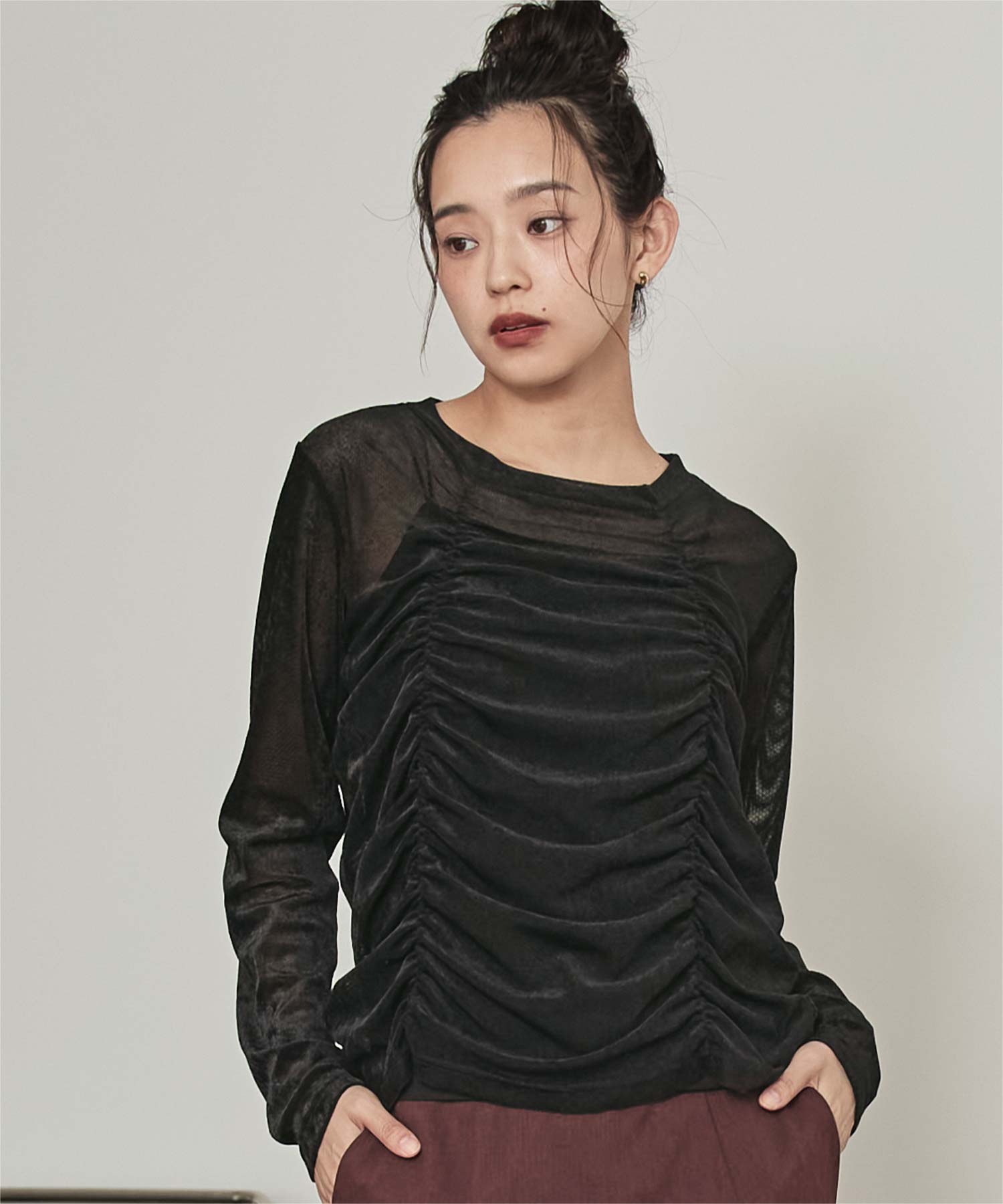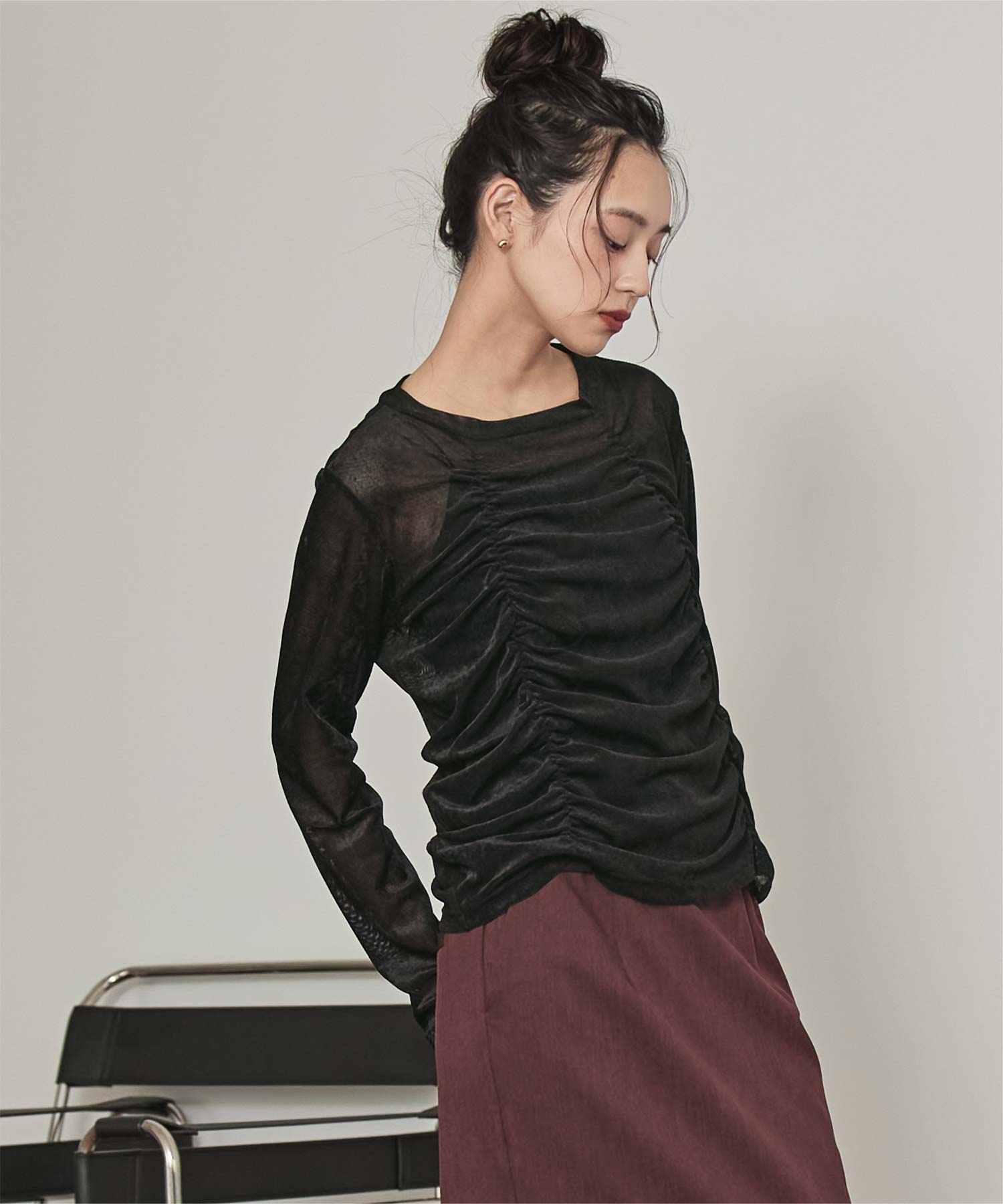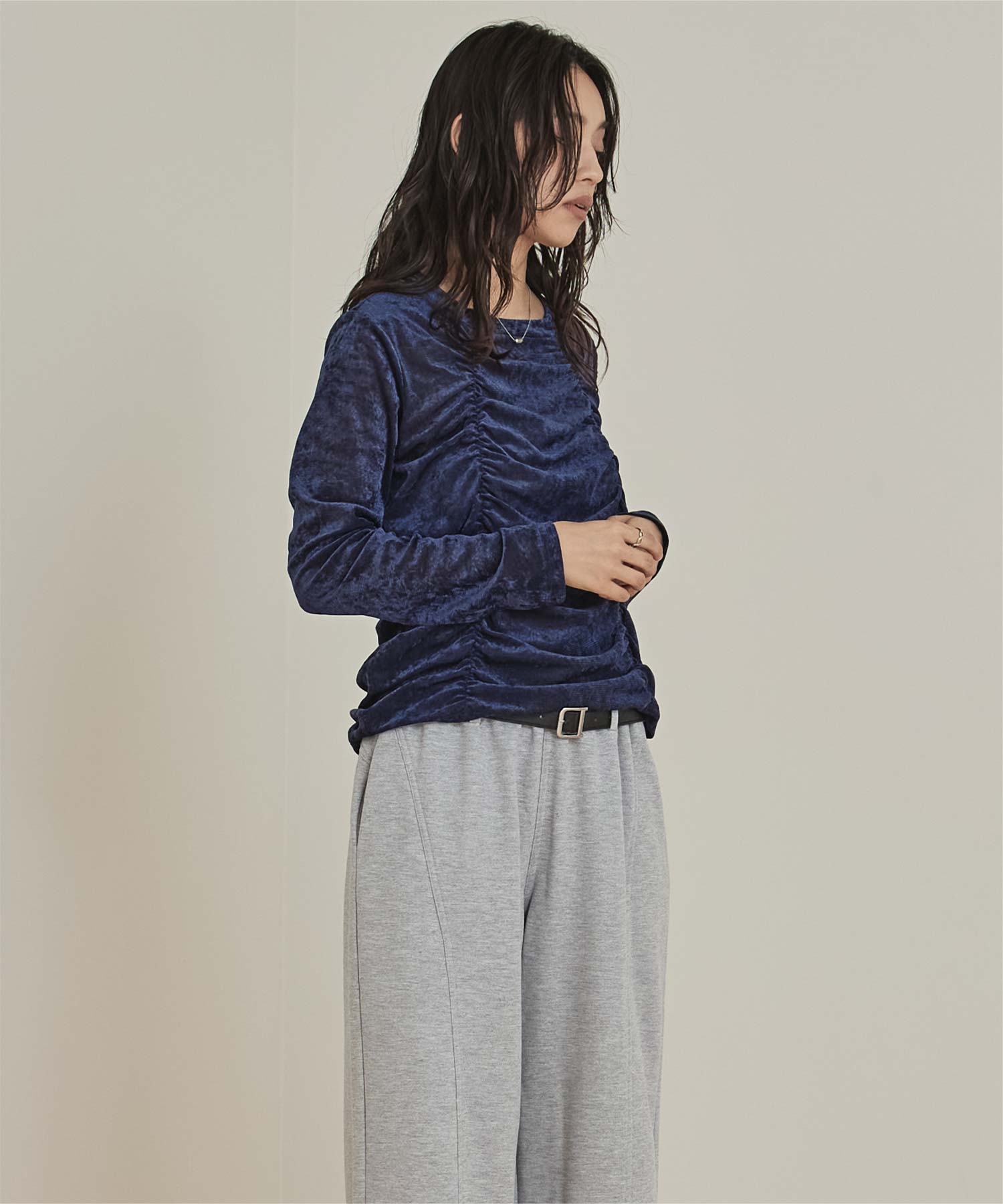 ・長めの袖とサイドギャザーがポイントのデザイントップス