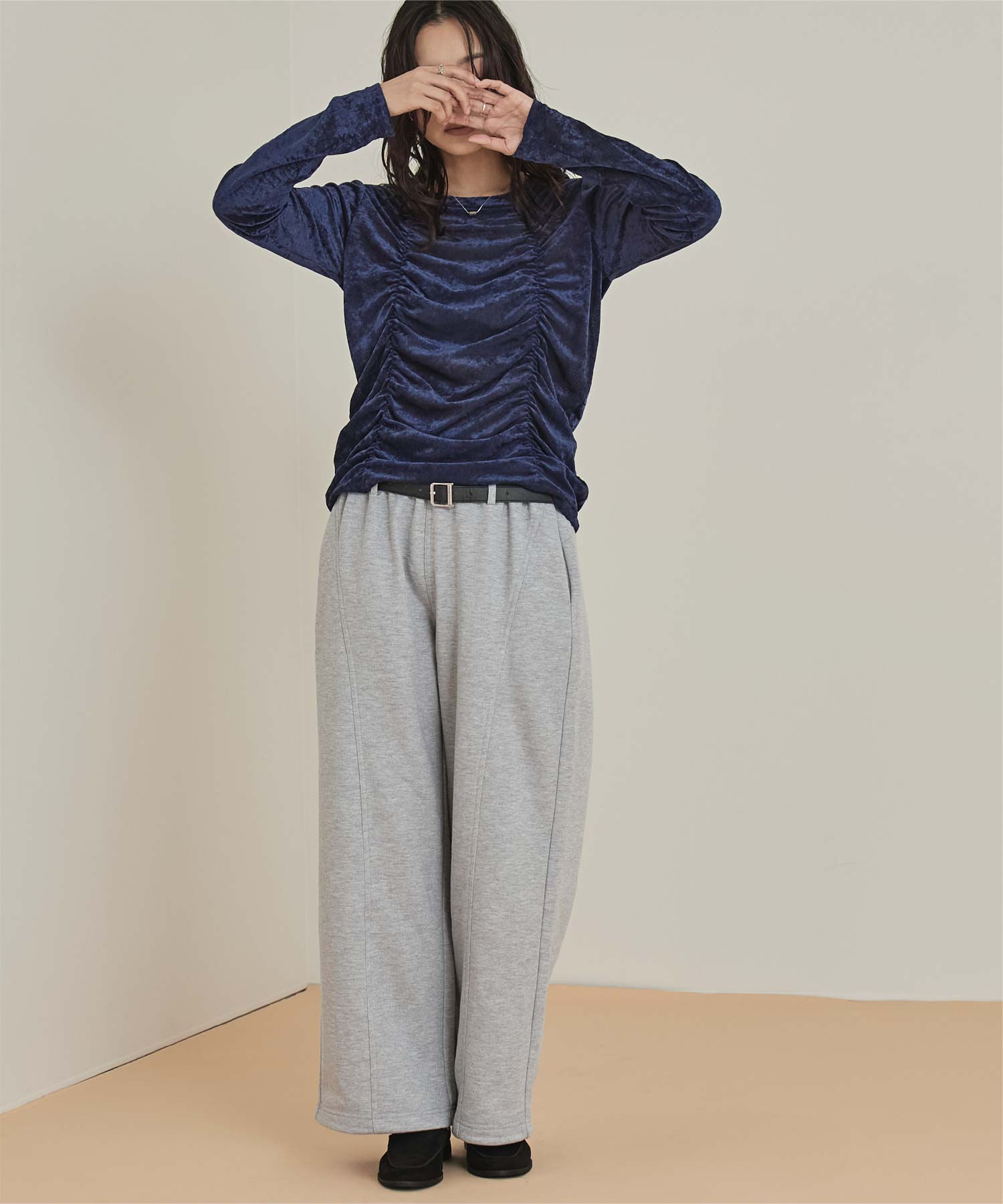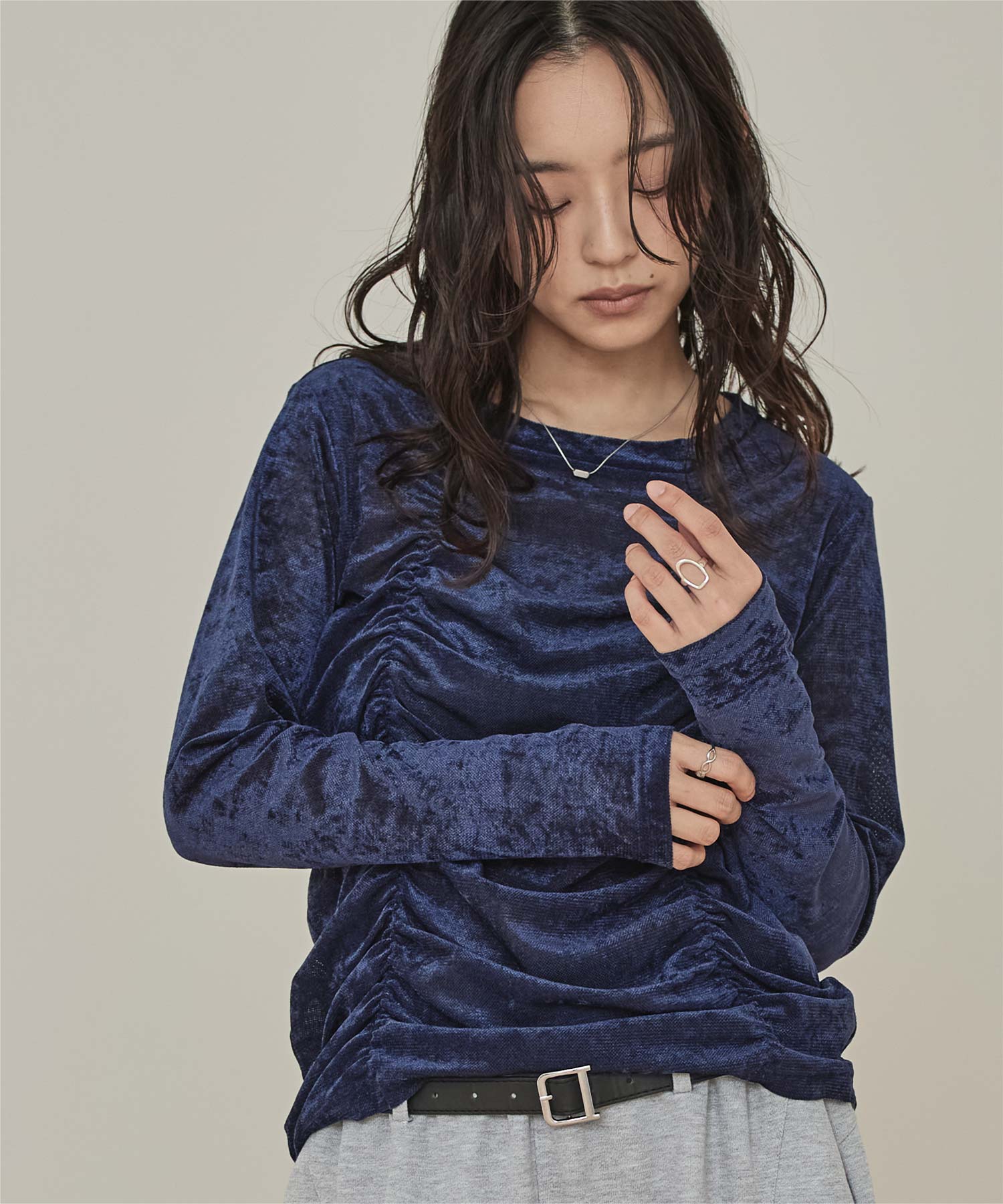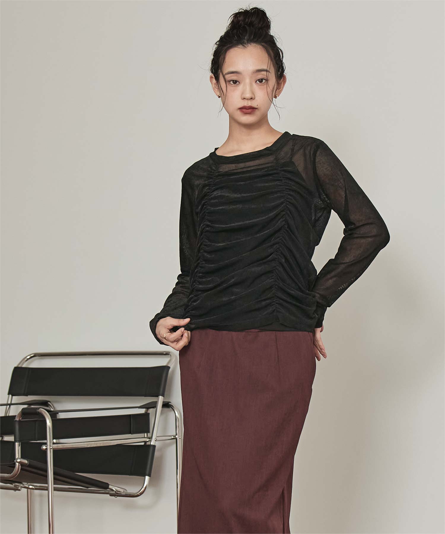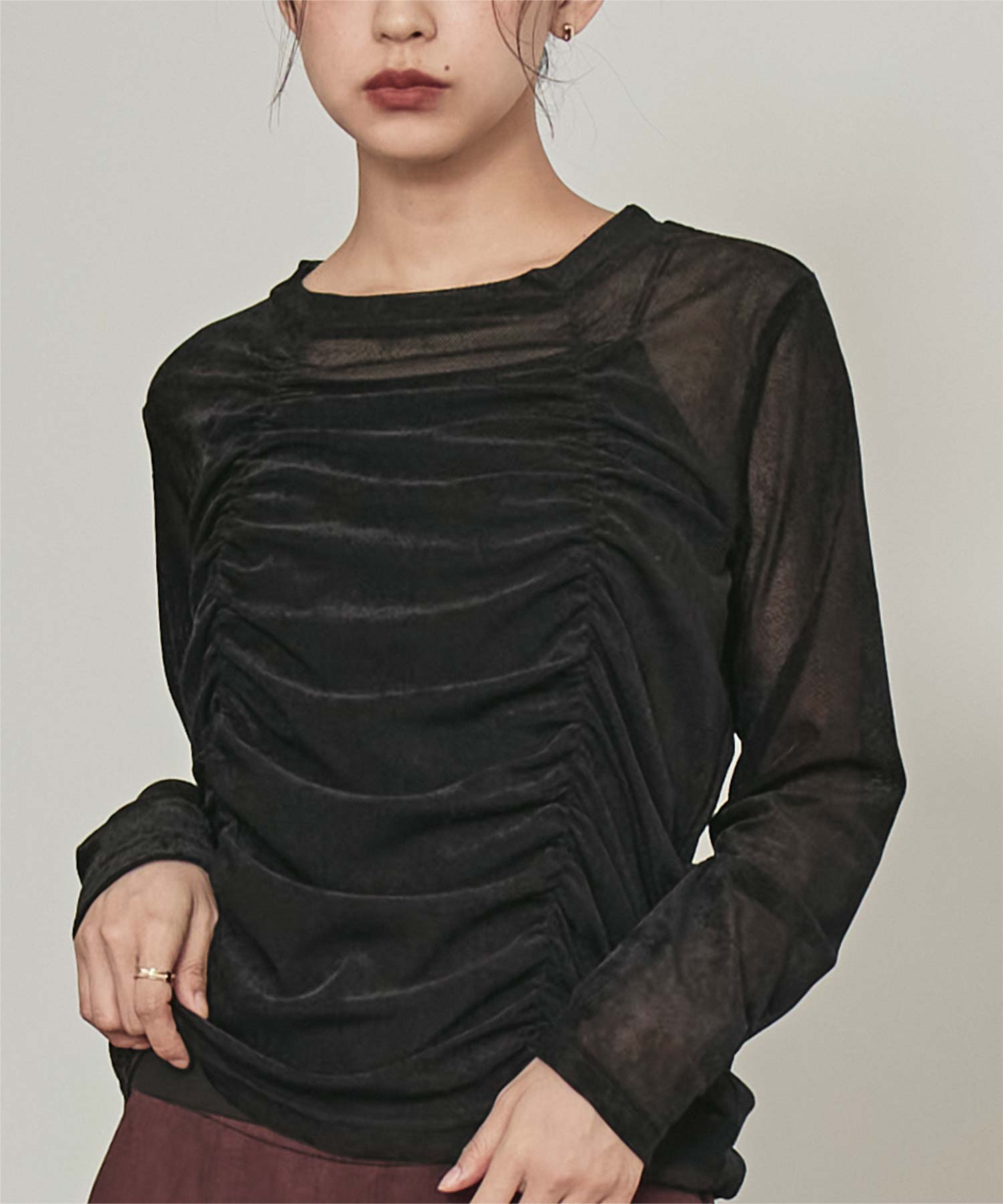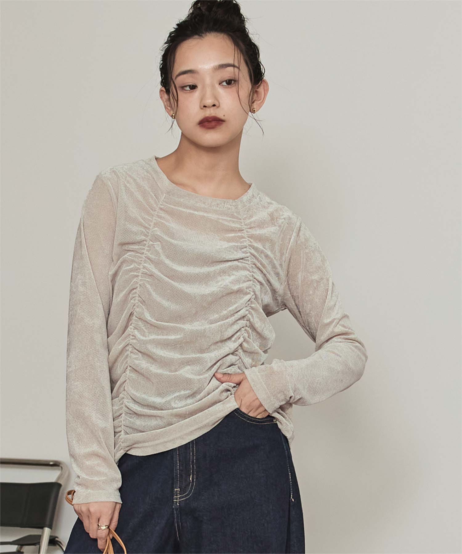 ・長めの袖とサイドギャザーがポイントのデザイントップス